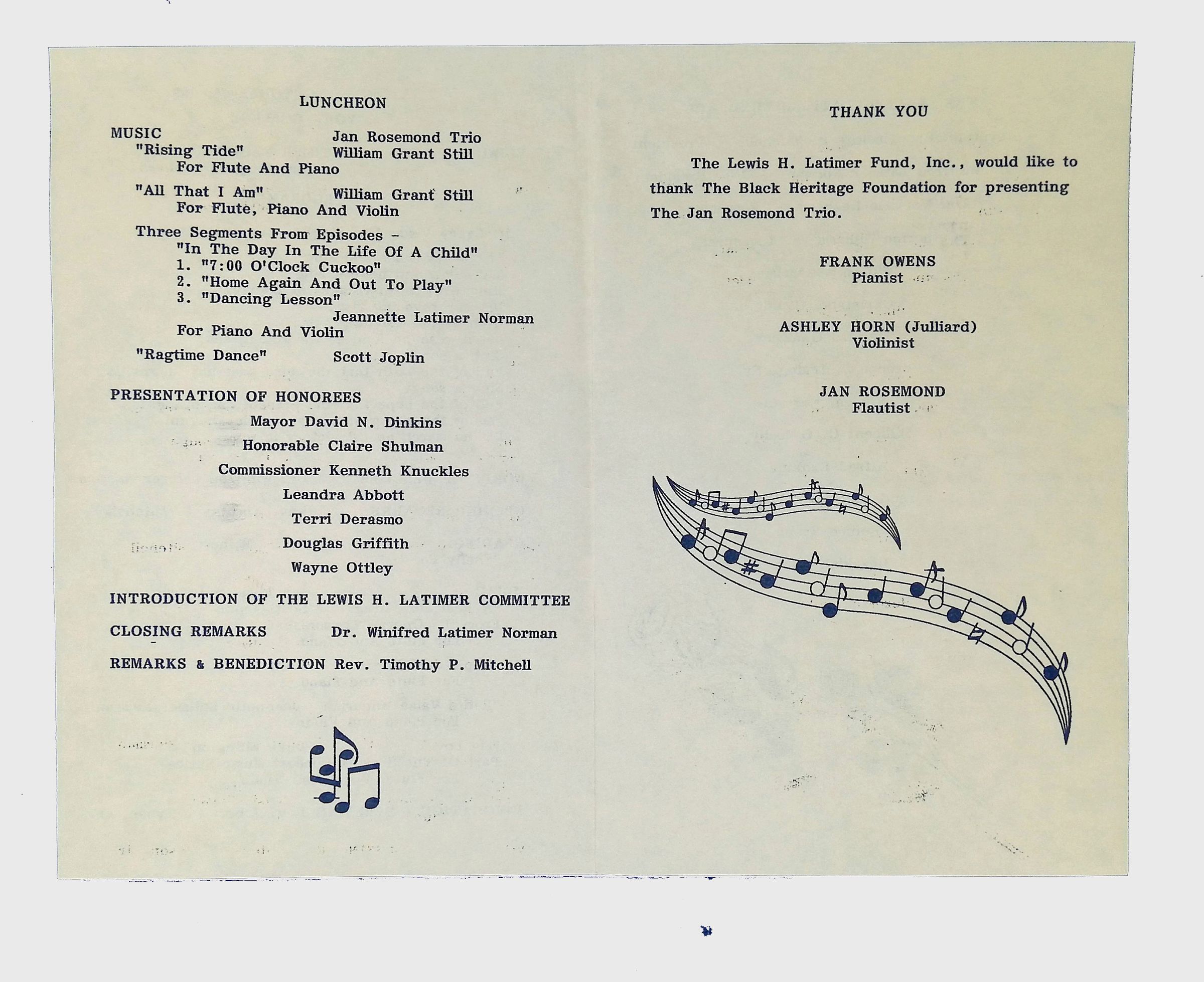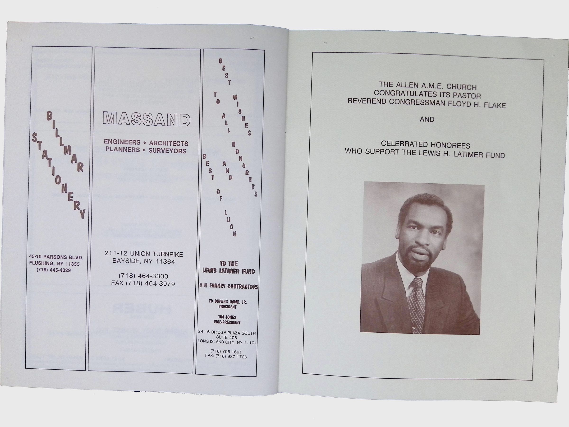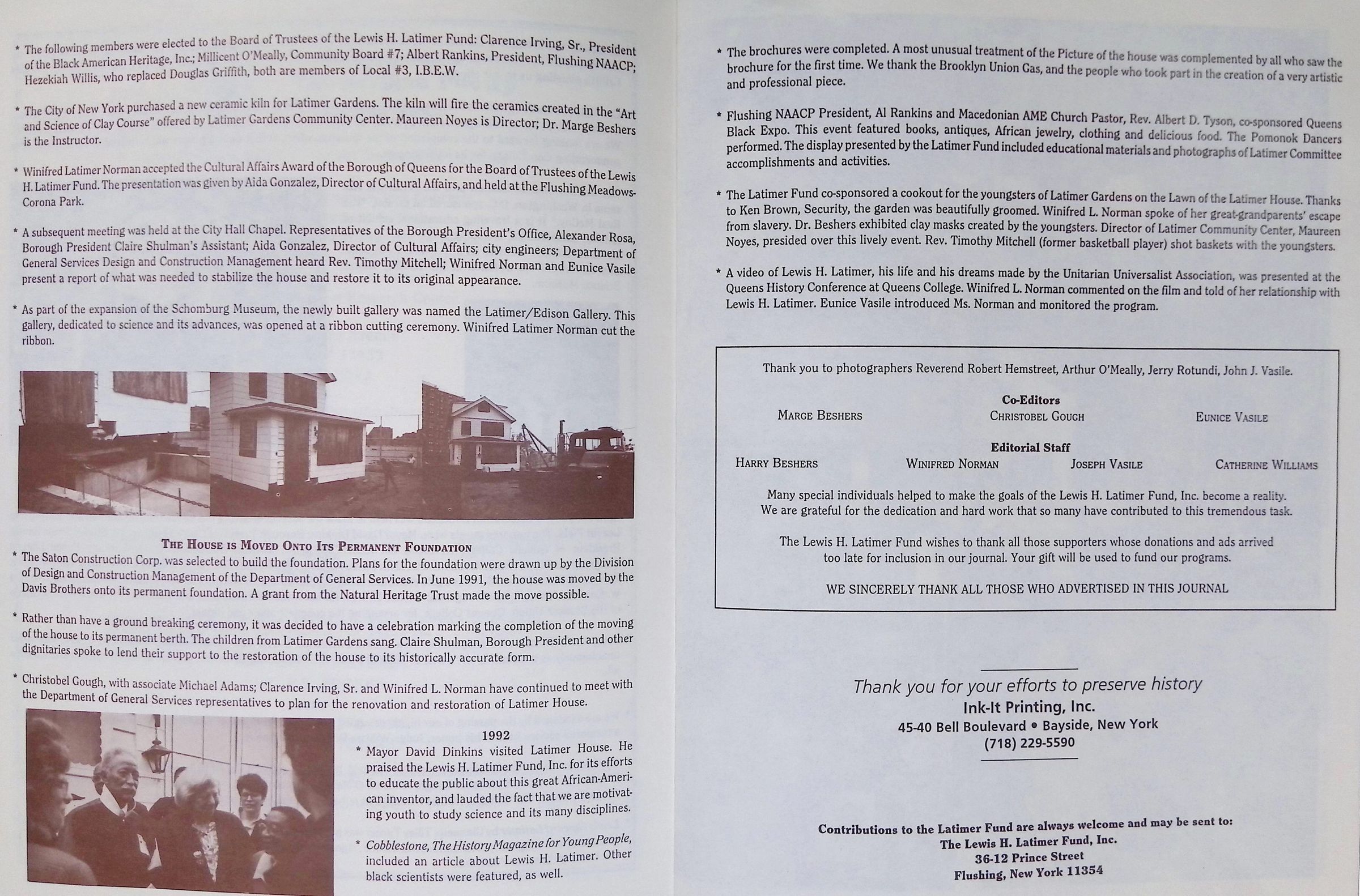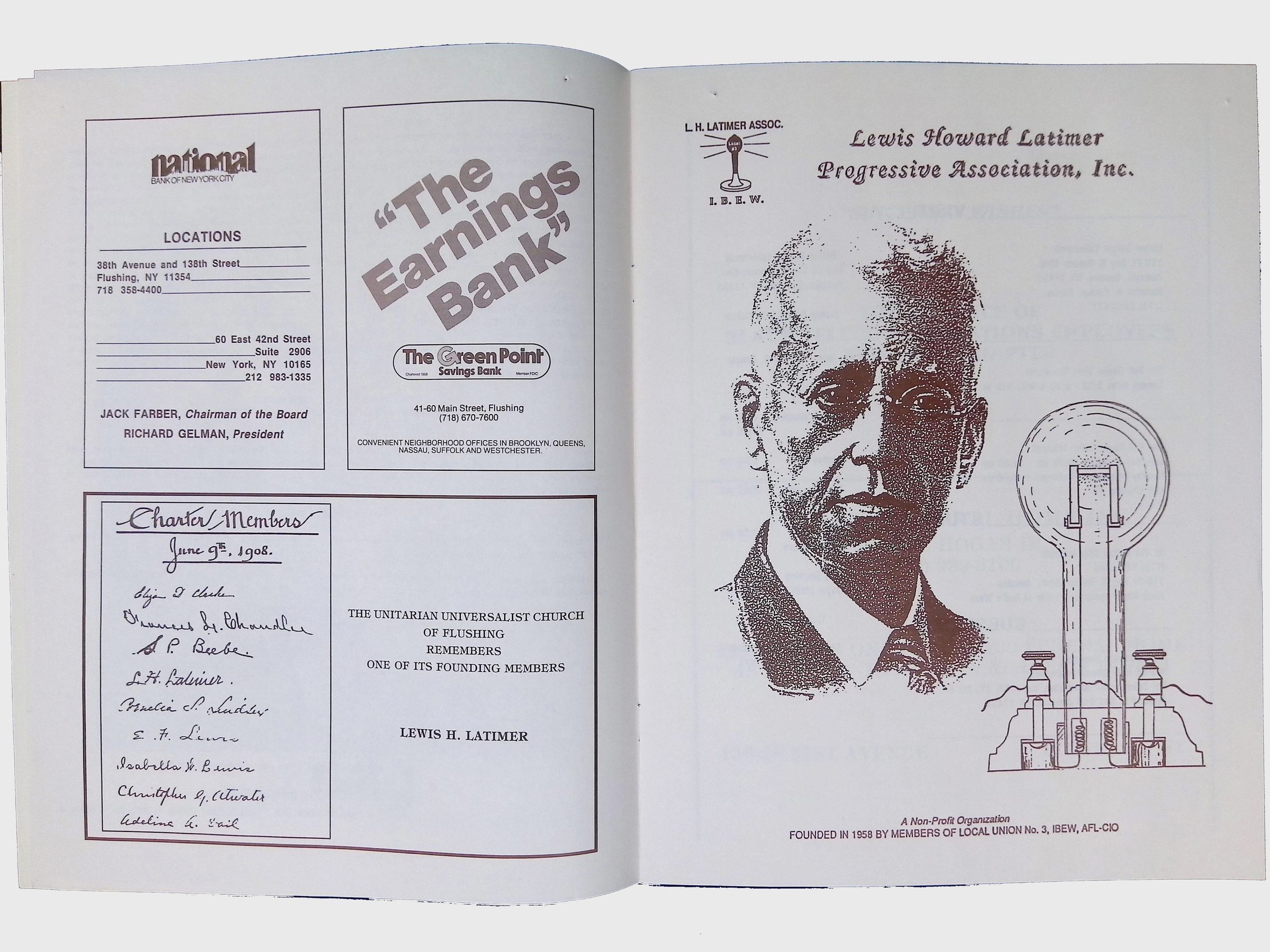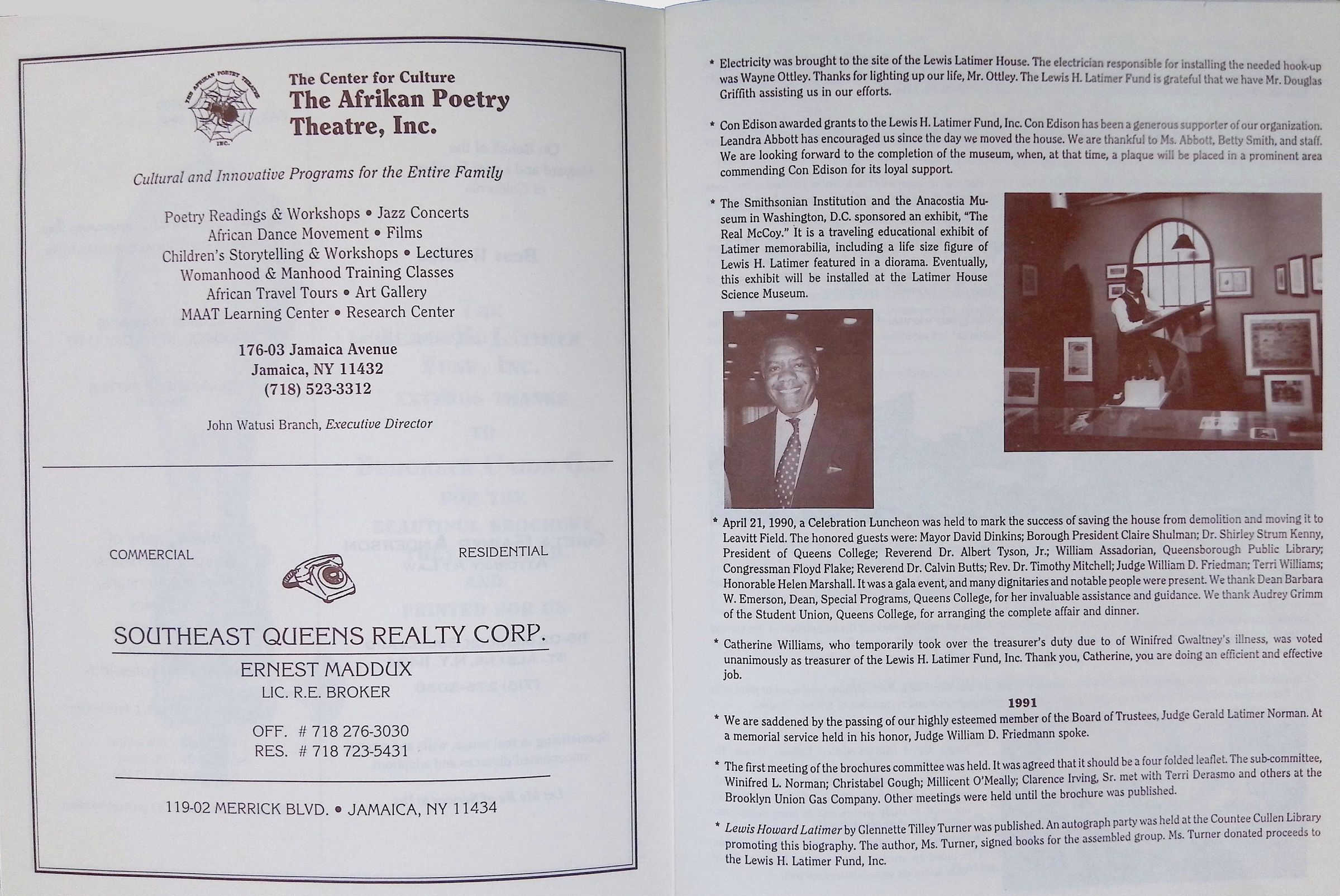 A collection of event programs, community outreach materials, and historical overviews celebrating the legacy of Lewis H. Latimer generated by the Lewis Latimer Fund, Inc. during the 1990s. Among those pictured or mentioned at Lewis Latimer’s grandchildren Winifred Norman and Gerald L. Norman, New York City Mayor David Dinkins, and Queens Borough President Claire Shulman..Context