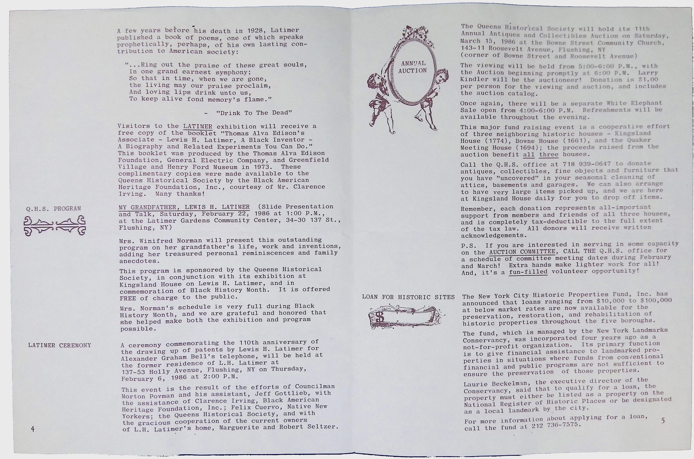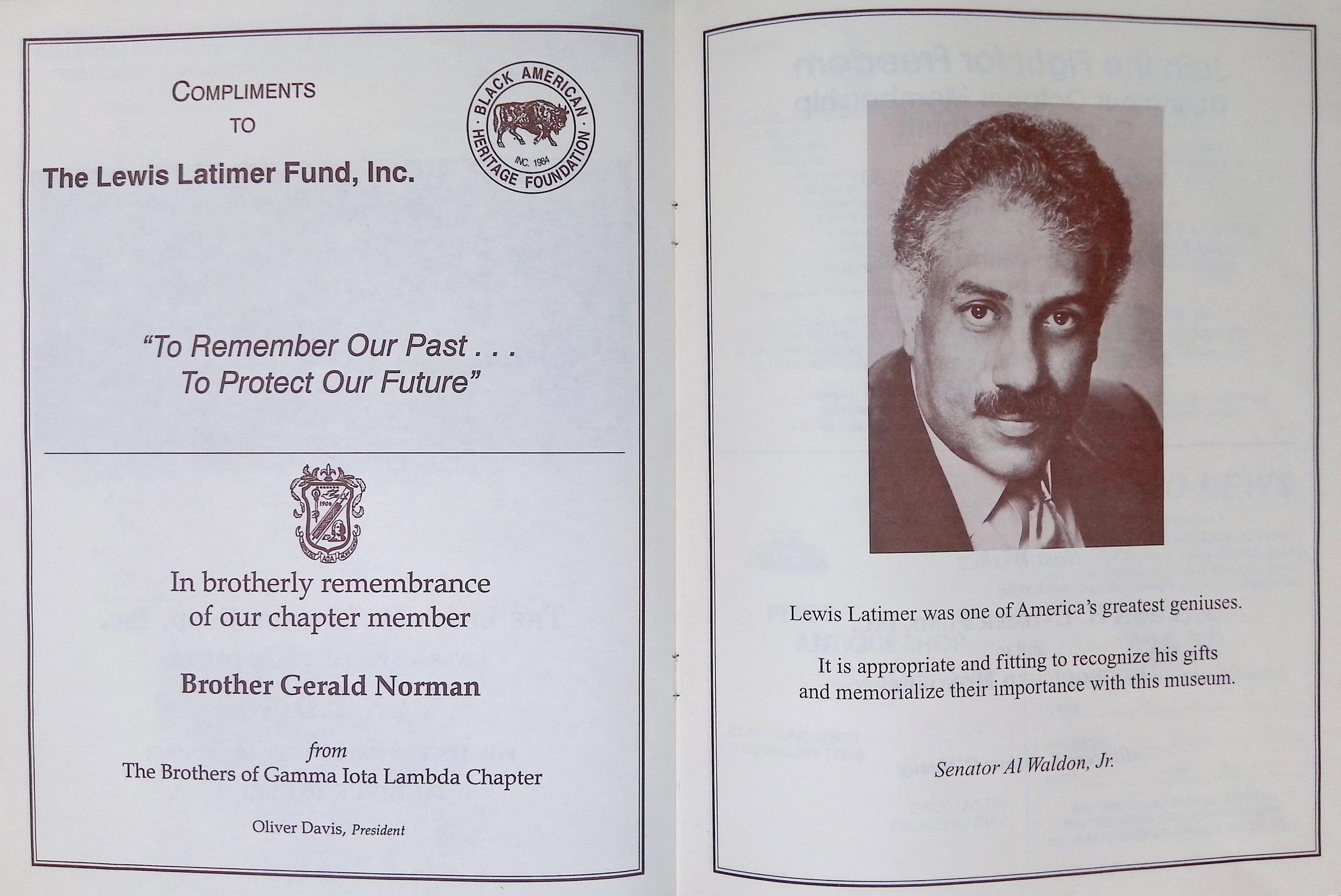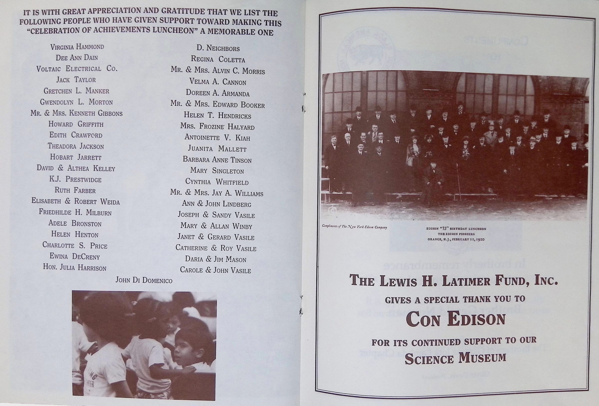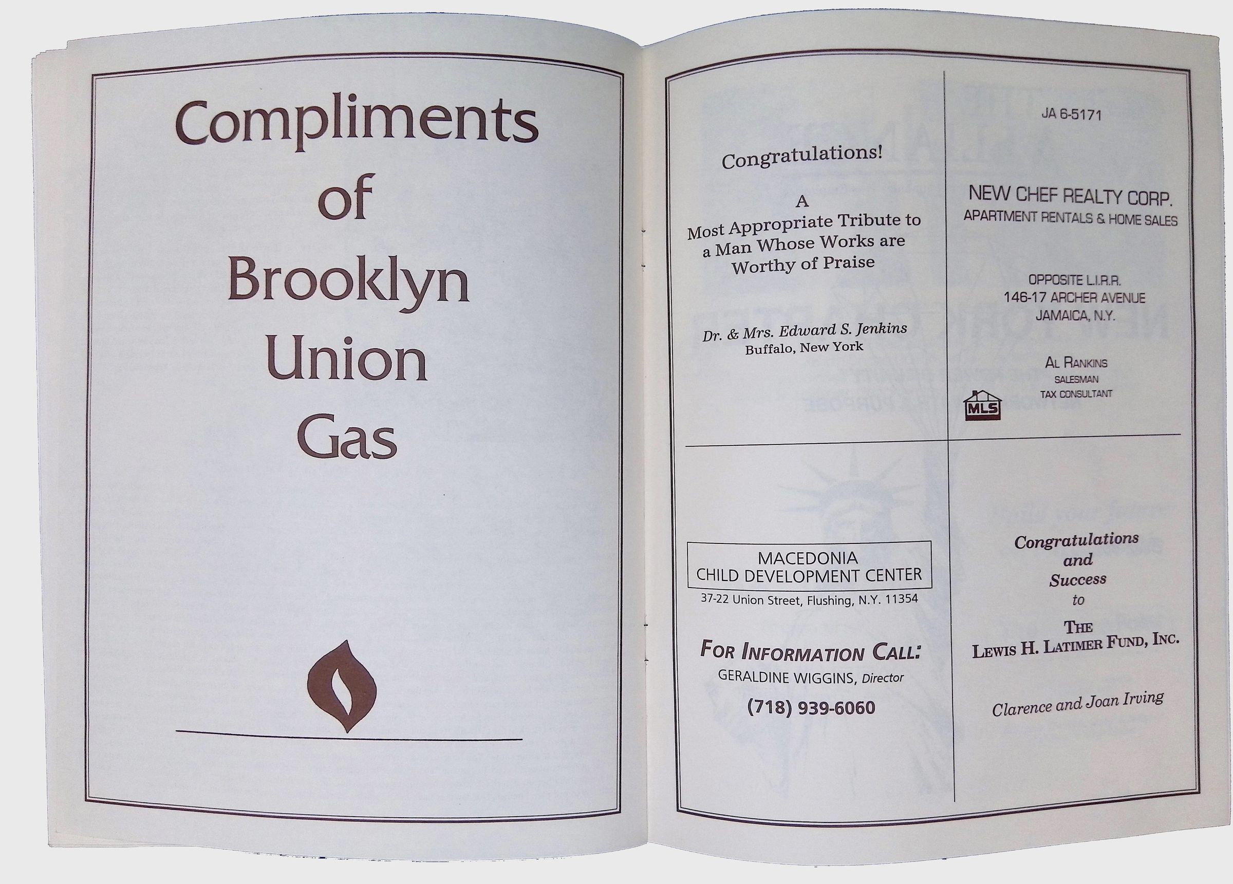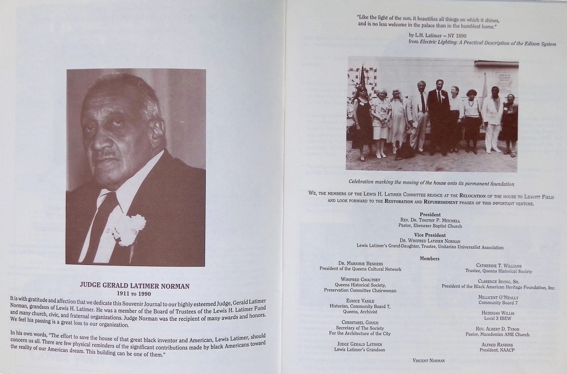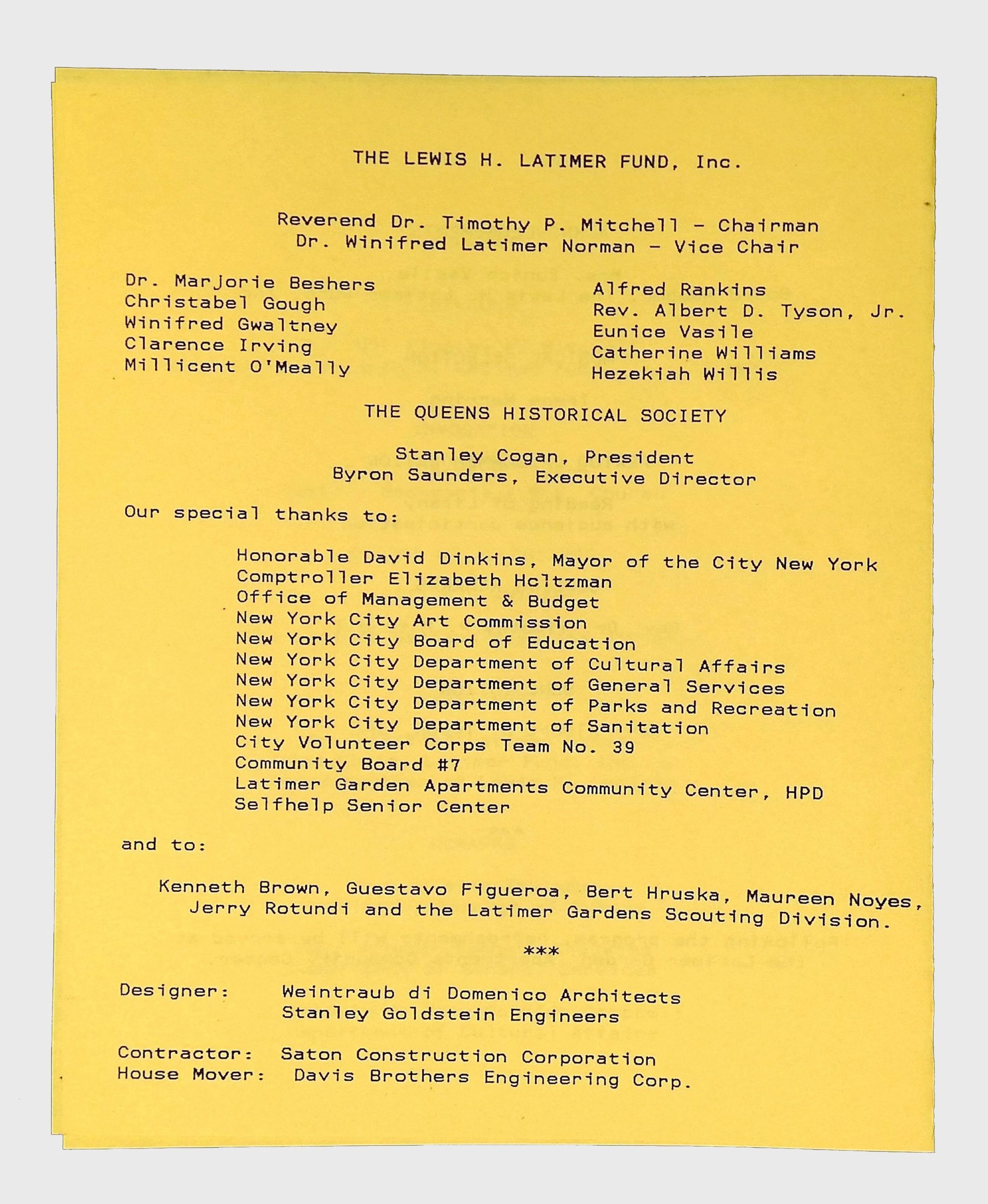 A collection of event programs, community outreach materials, and historical overviews celebrating the legacy of Lewis H. Latimer generated by the Lewis Latimer Fund, Inc. during the 1990s. Among those pictured or mentioned at Lewis Latimer’s grandchildren Winifred Norman and Gerald L. Norman, New York City Mayor David Dinkins, and Queens Borough President Claire Shulman..Context