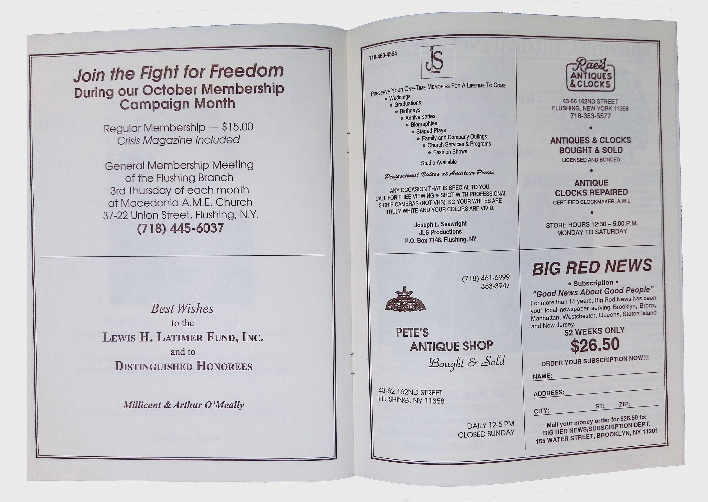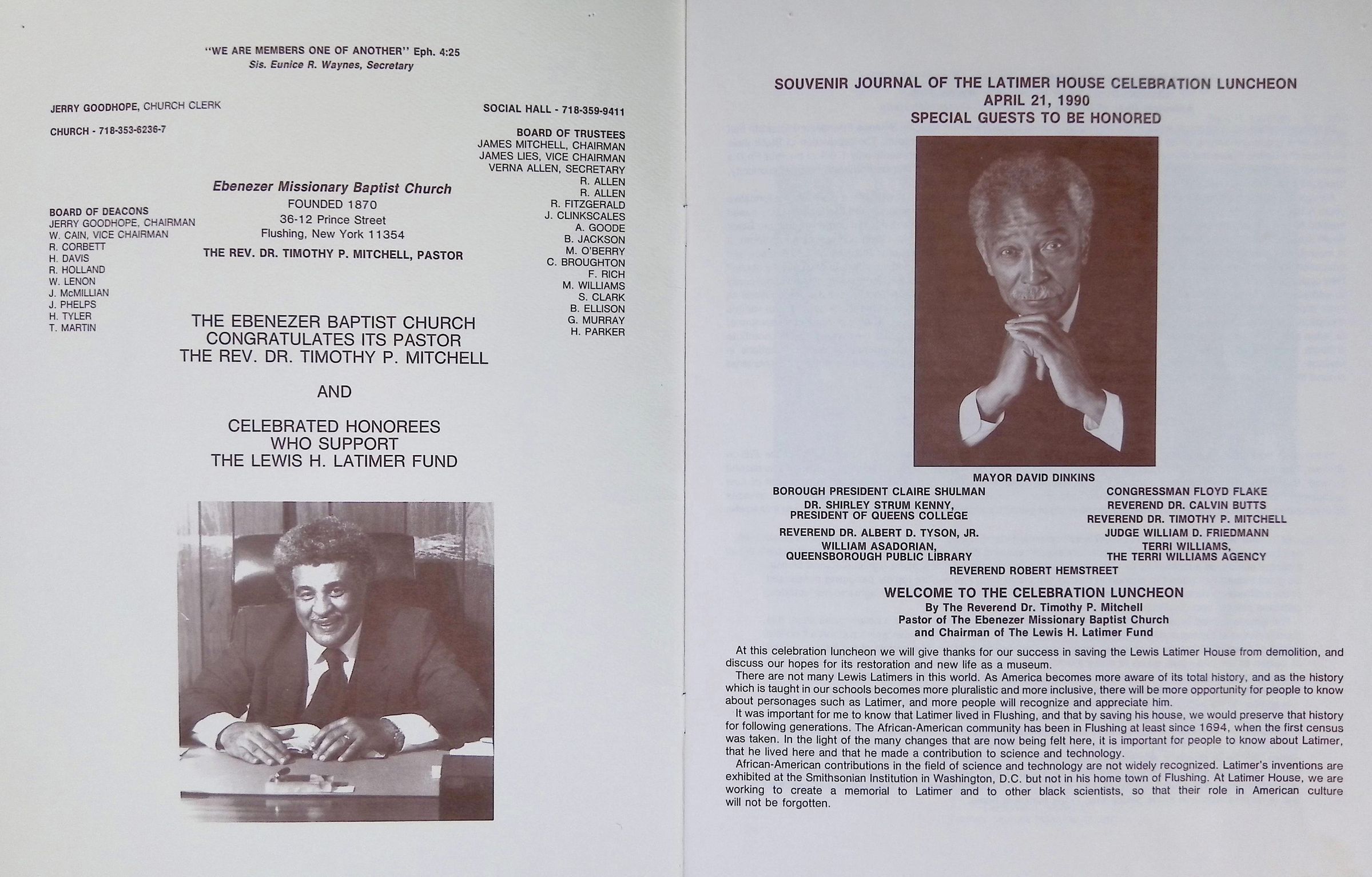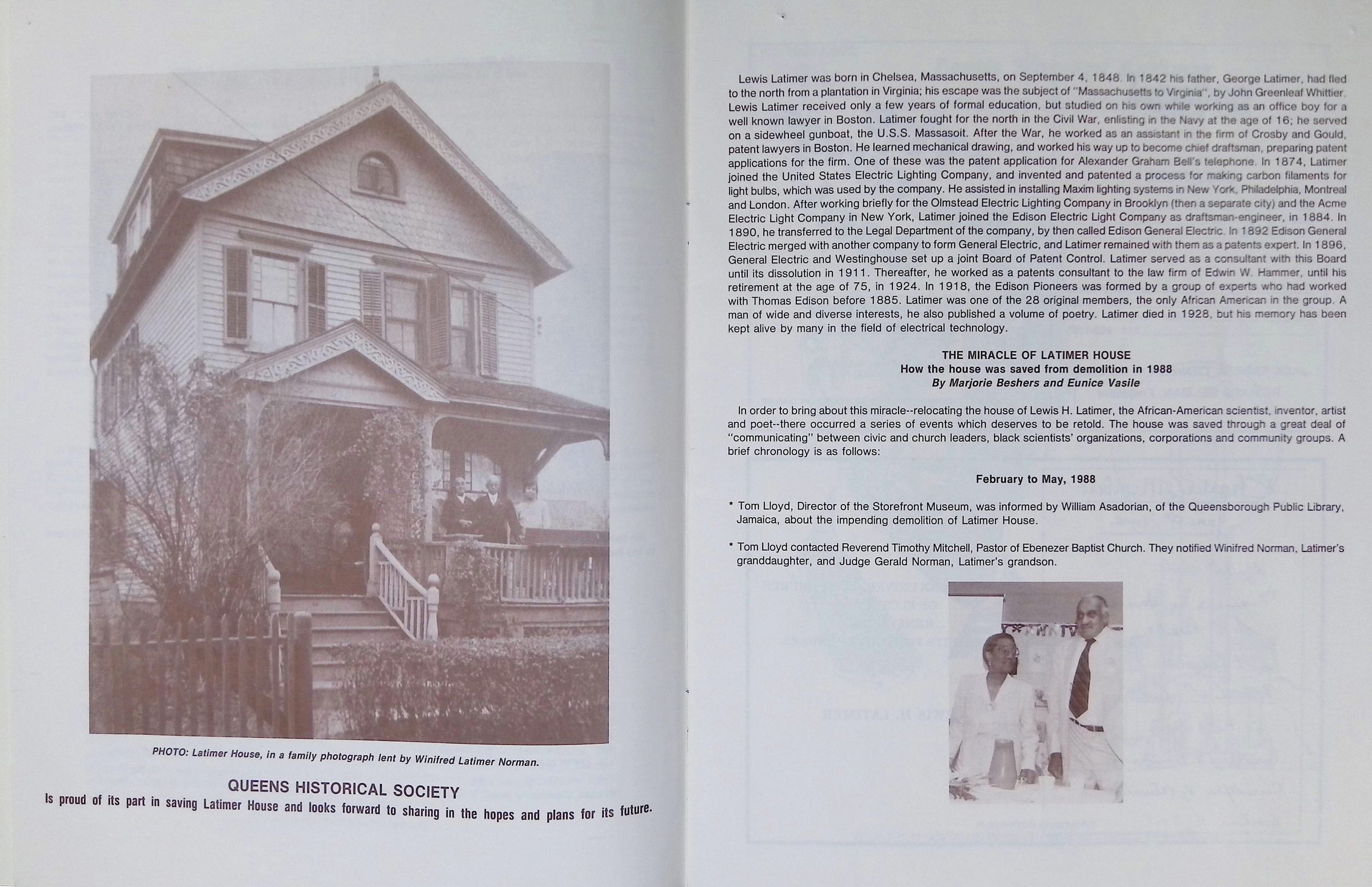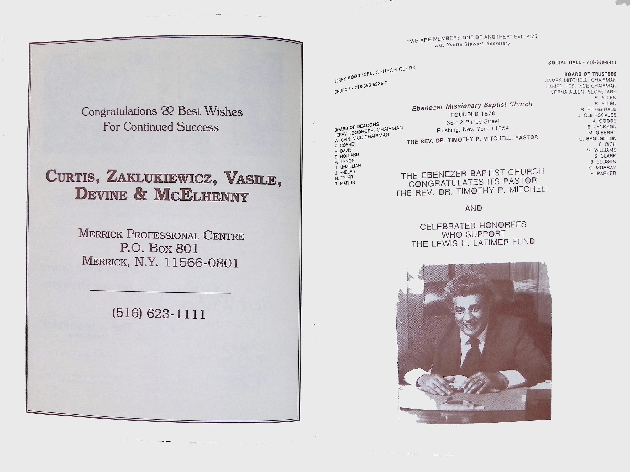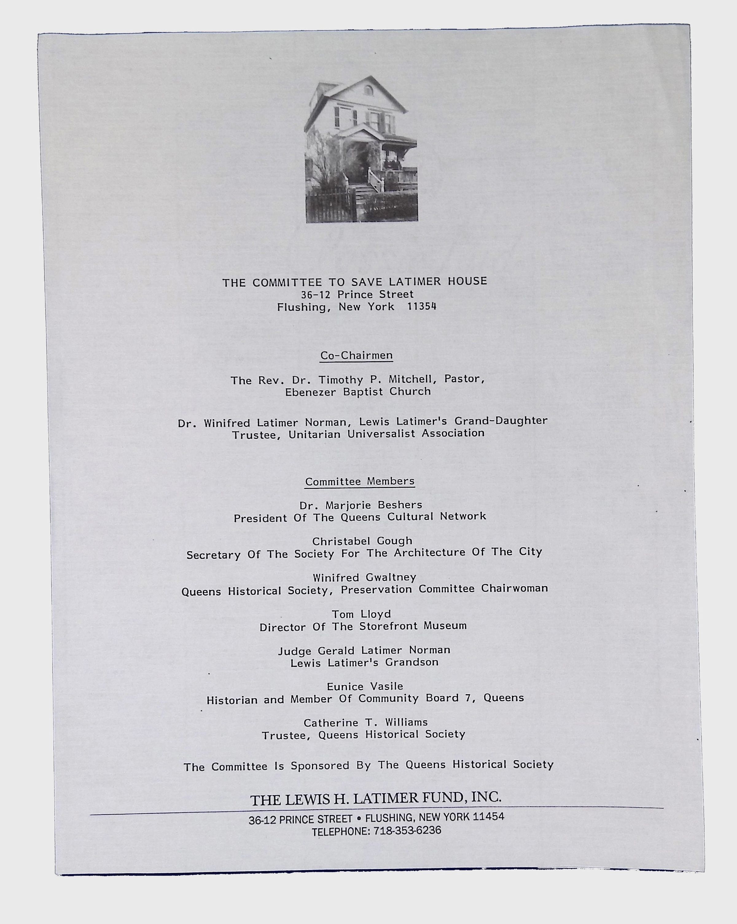 A collection of event programs, community outreach materials, and historical overviews celebrating the legacy of Lewis H. Latimer generated by the Lewis Latimer Fund, Inc. during the 1990s. Among those pictured or mentioned at Lewis Latimer’s grandchildren Winifred Norman and Gerald L. Norman, New York City Mayor David Dinkins, and Queens Borough President Claire Shulman..Context