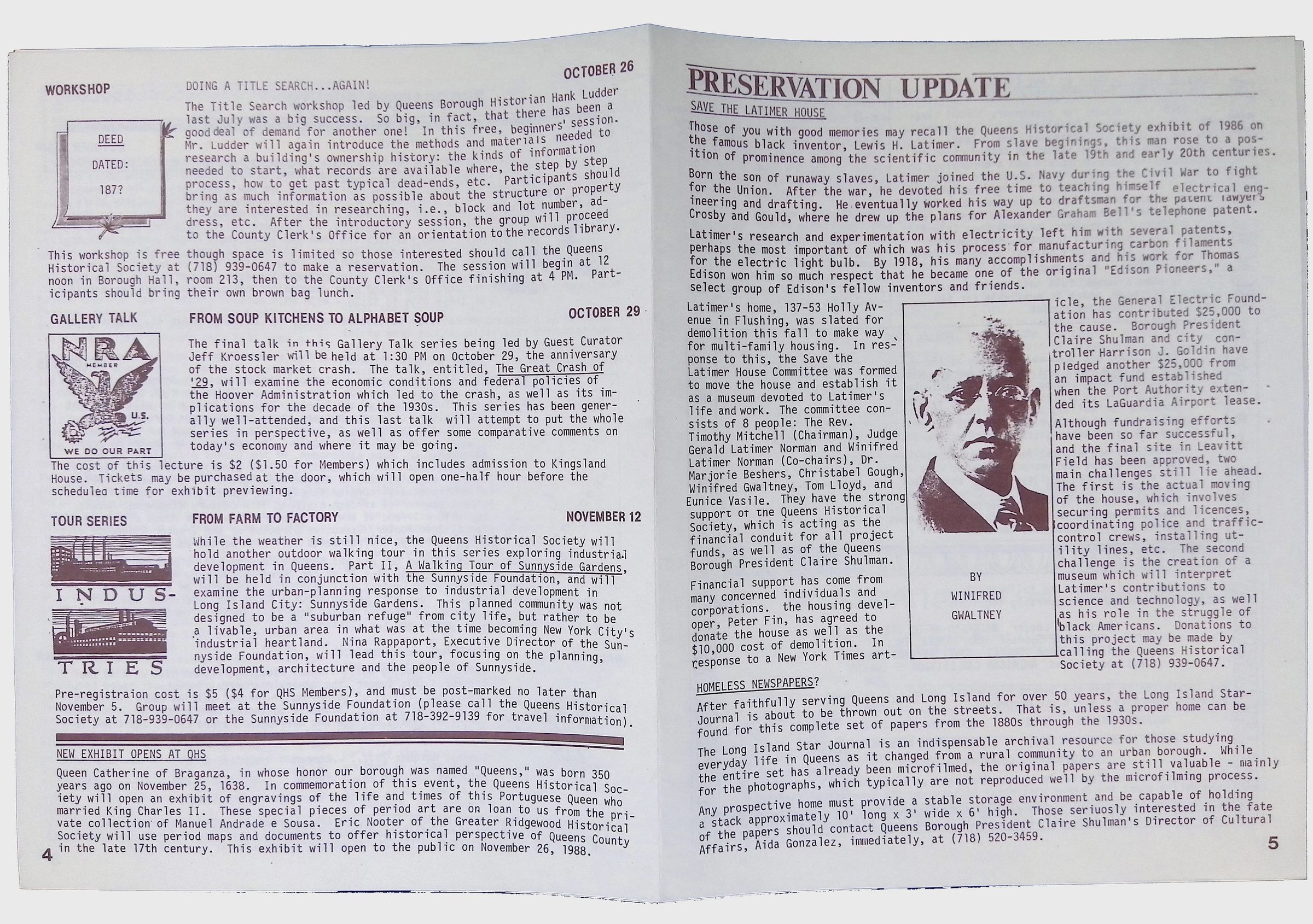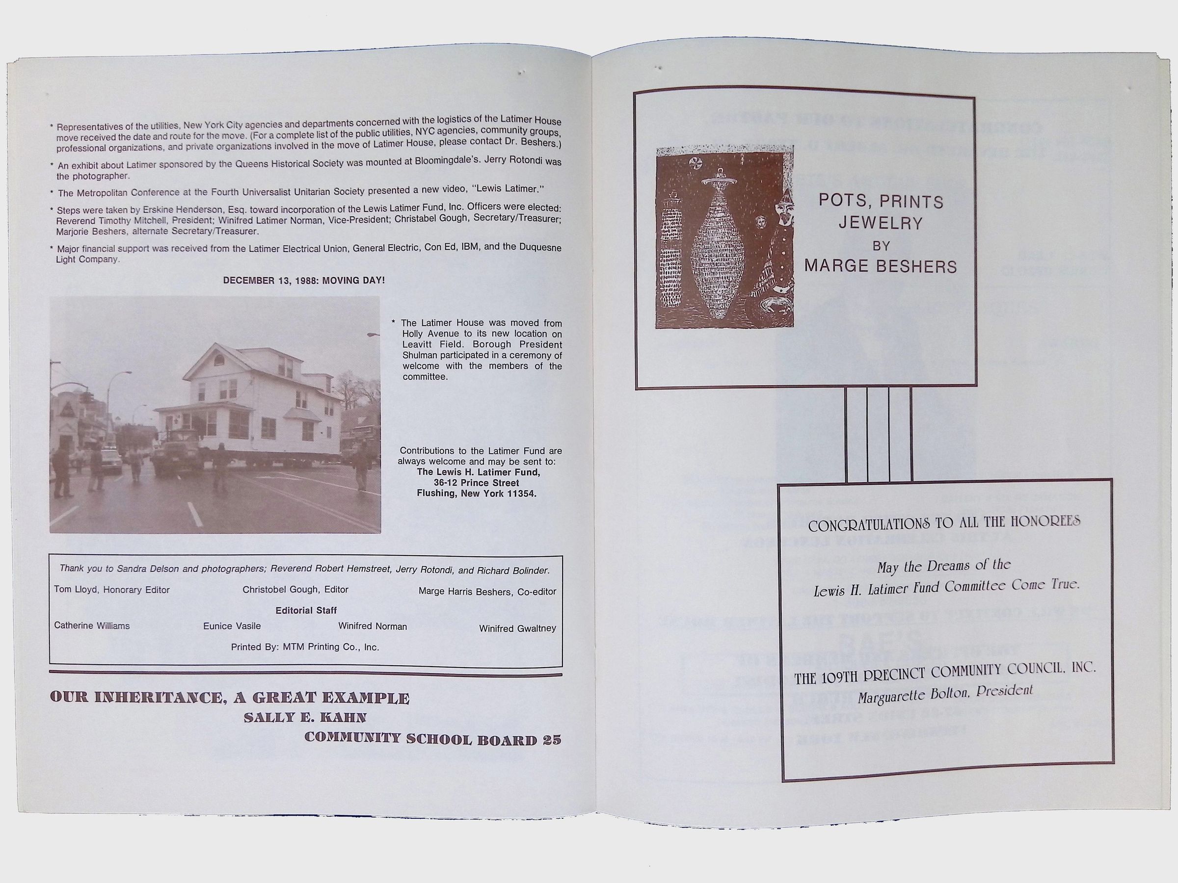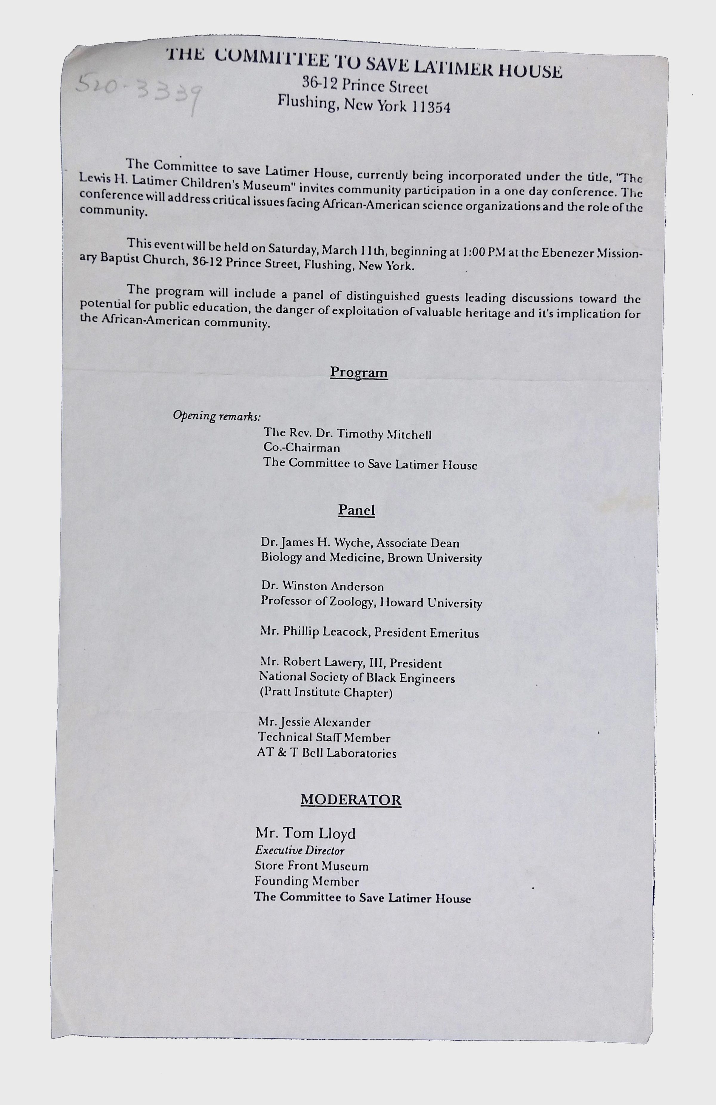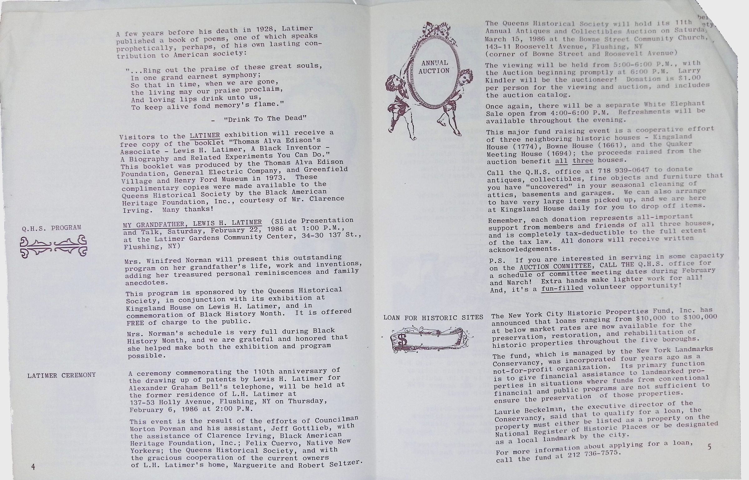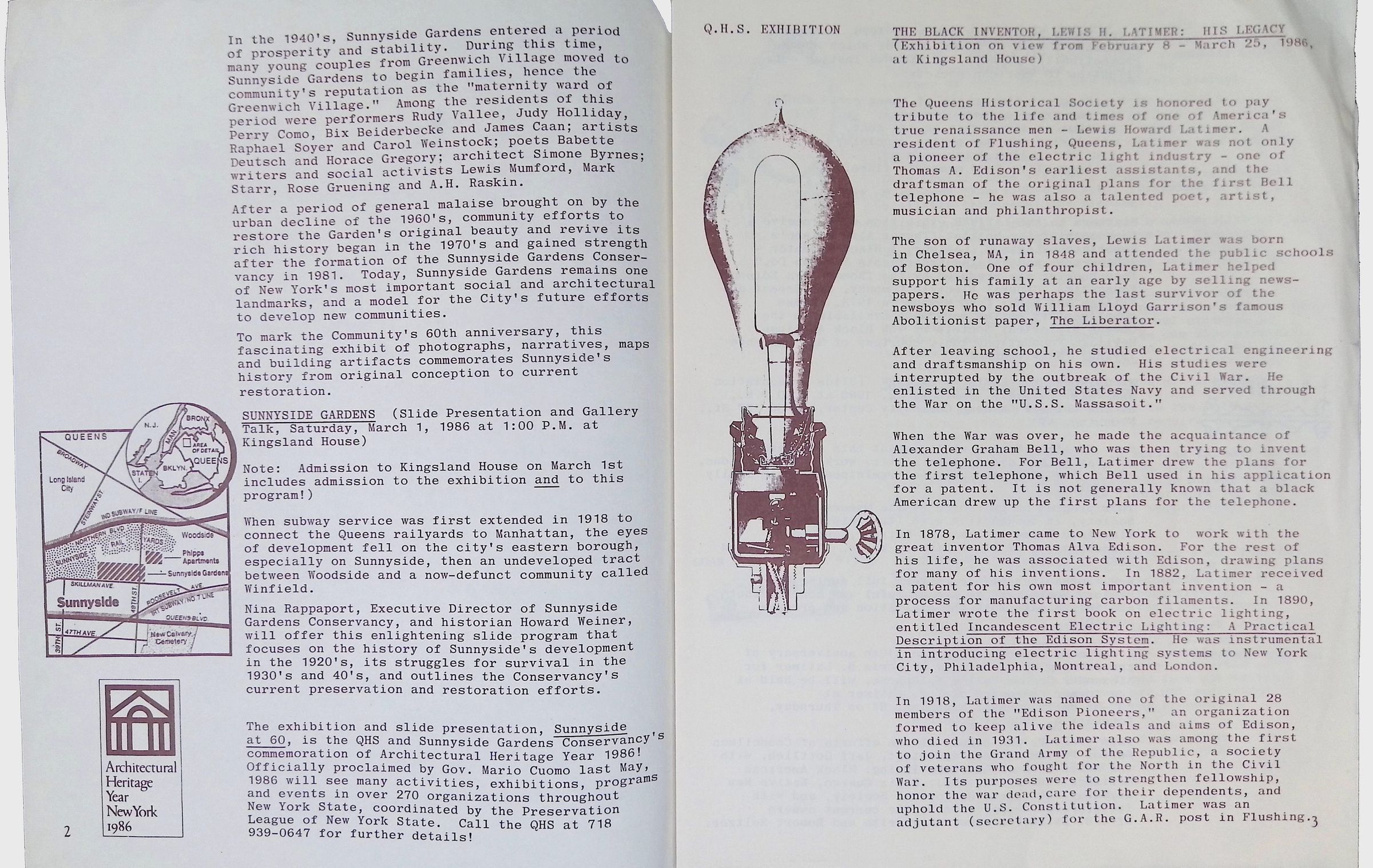 A collection of event programs, community outreach materials, and historical overviews celebrating the legacy of Lewis H. Latimer generated by the Lewis Latimer Fund, Inc. during the 1990s. Among those pictured or mentioned at Lewis Latimer’s grandchildren Winifred Norman and Gerald L. Norman, New York City Mayor David Dinkins, and Queens Borough President Claire Shulman..Context