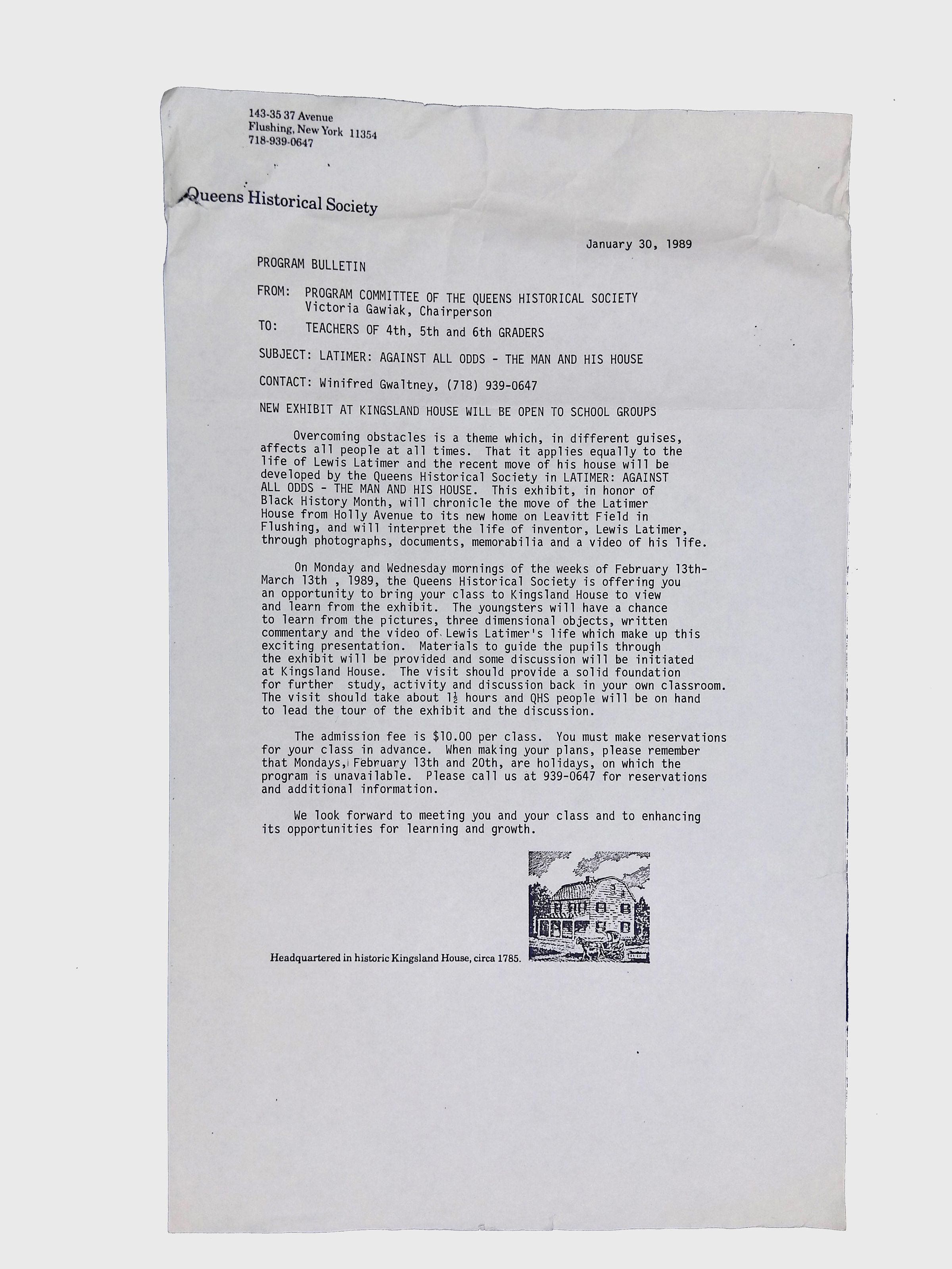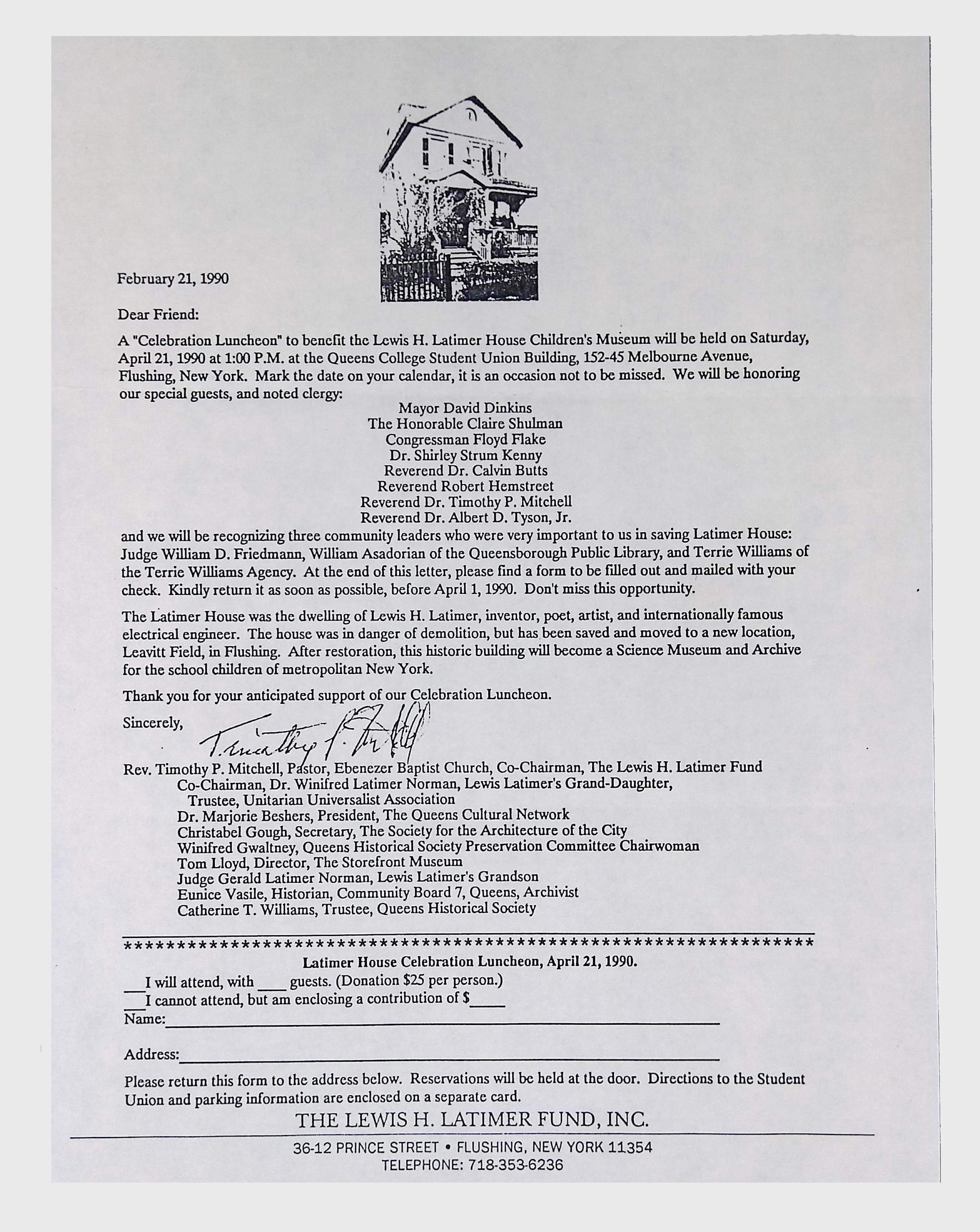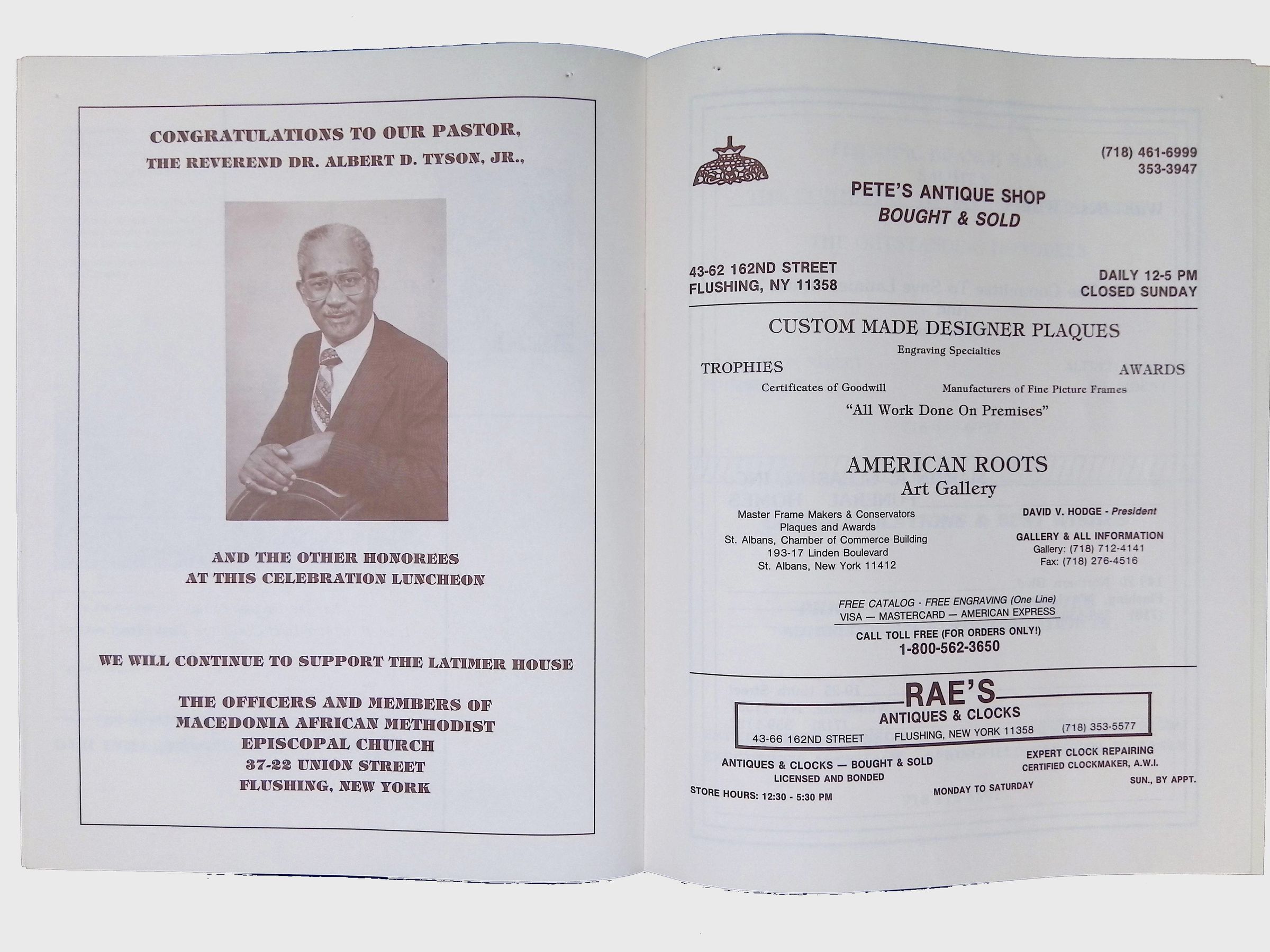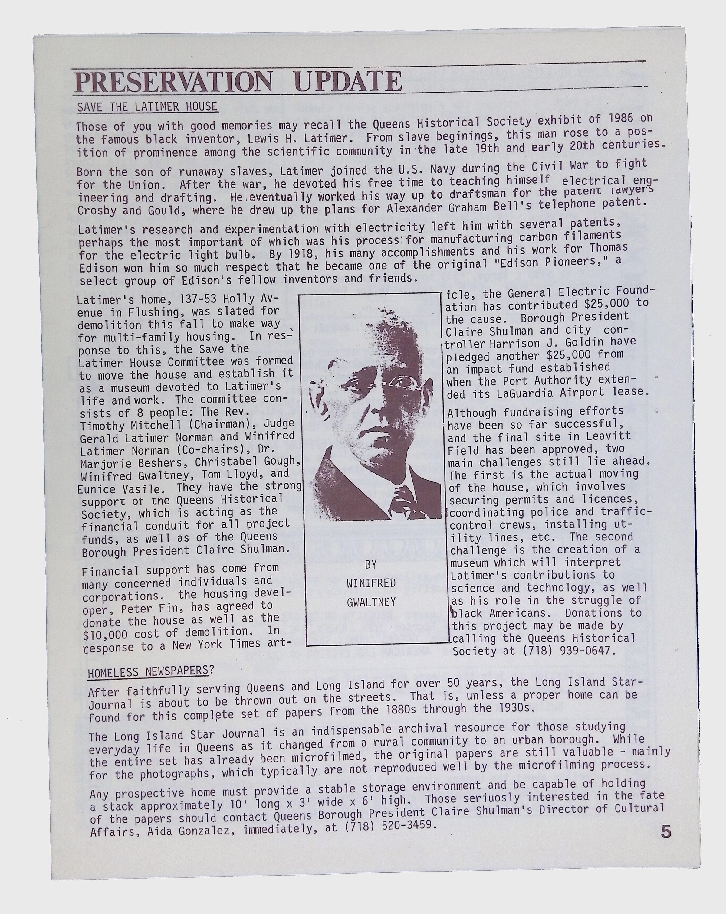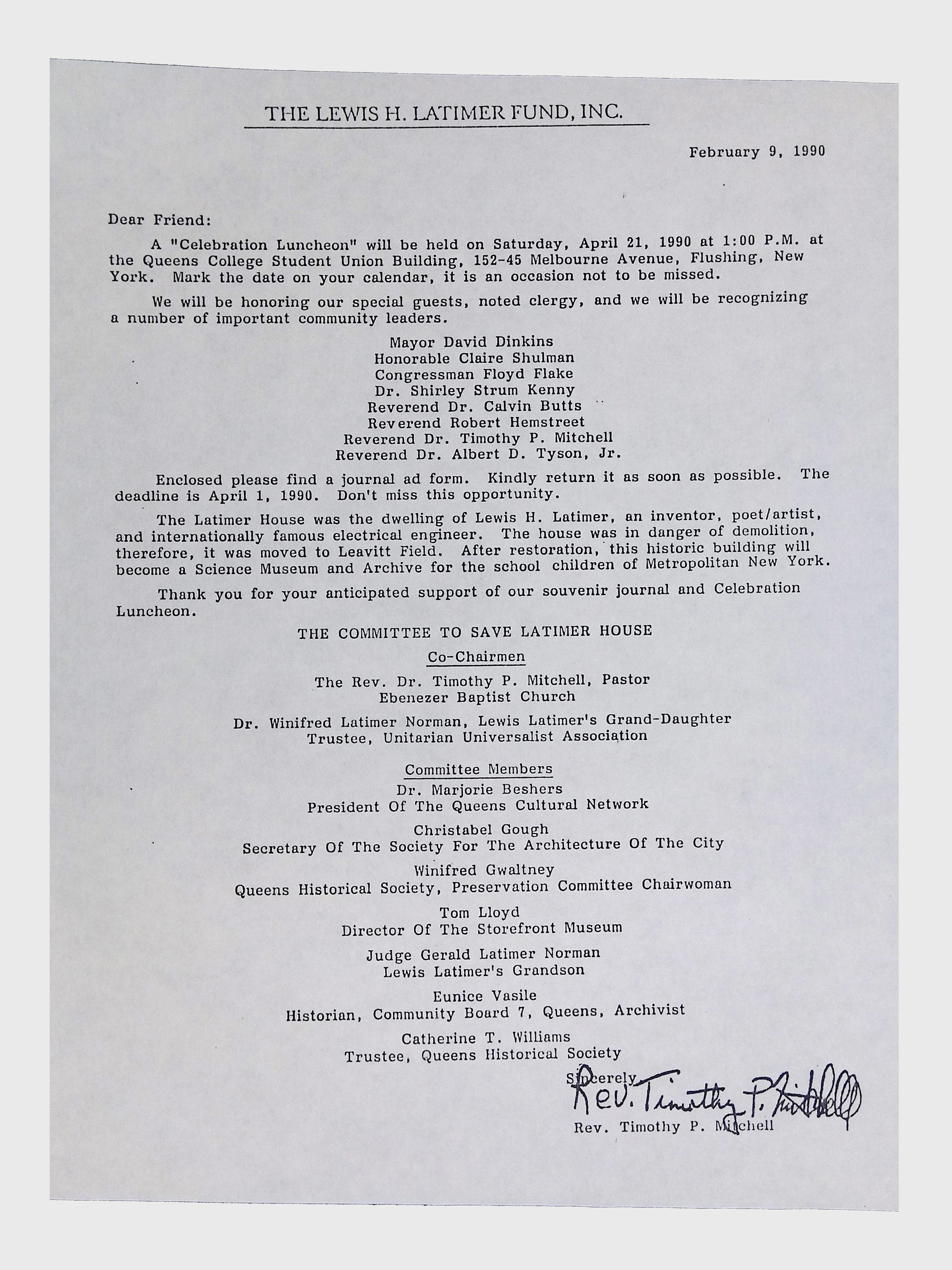 A collection of event programs, community outreach materials, and historical overviews celebrating the legacy of Lewis H. Latimer generated by the Lewis Latimer Fund, Inc. during the 1990s. Among those pictured or mentioned at Lewis Latimer’s grandchildren Winifred Norman and Gerald L. Norman, New York City Mayor David Dinkins, and Queens Borough President Claire Shulman..Context