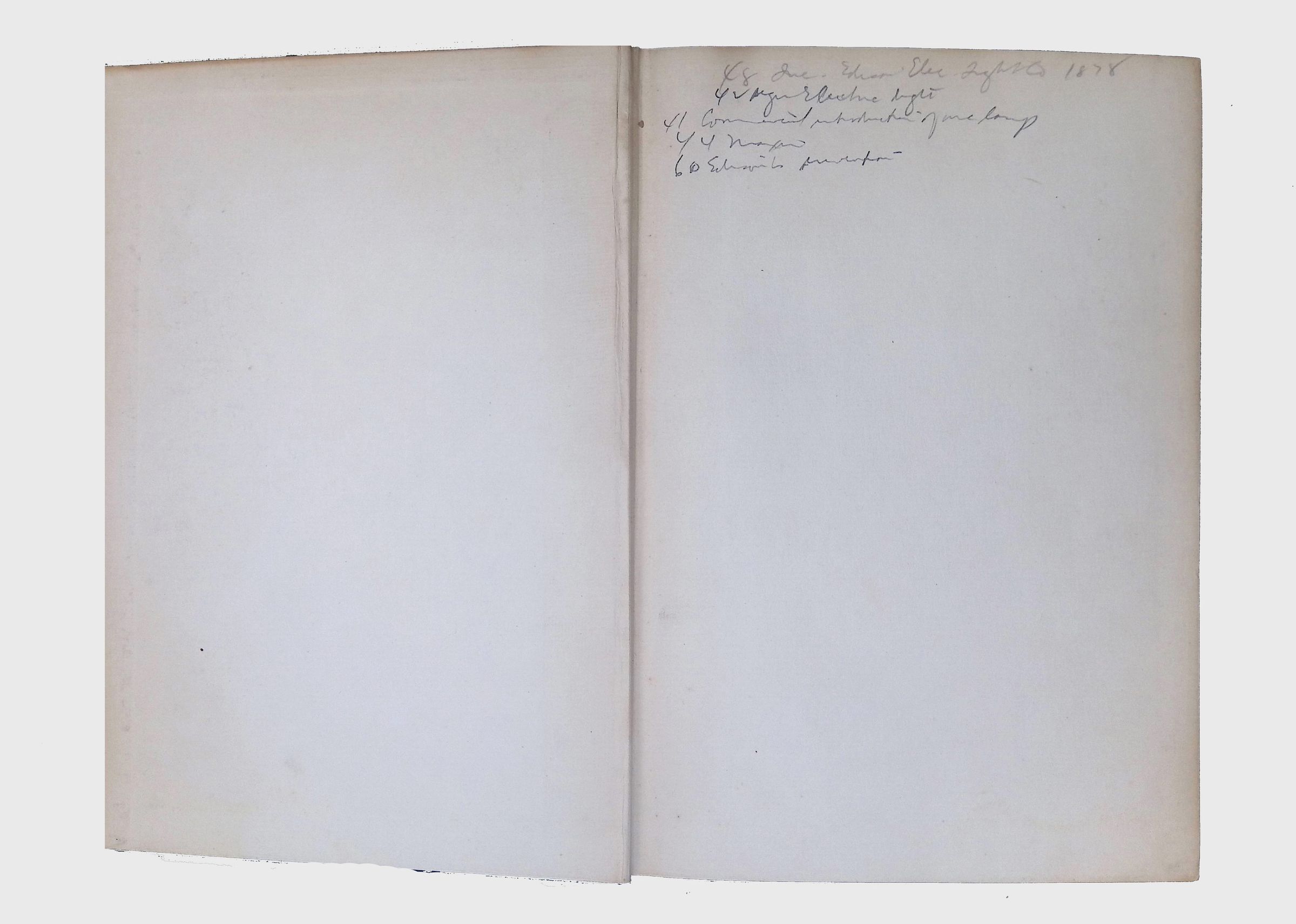 This book, The History of the Incandescent Lamp, serves as a comprehensive resource for understanding the history and significance of the incandescent lamp in technological and industrial history. It provides valuable insights into the scientific progress and entrepreneurial efforts that made electric lighting a fundamental aspect of modern life. Inside the front cover are several notes, possibly by Lewis Latimer, seemingly referring to specific pages in the book, with comments: “48—Inc. Edison Electric Light Co. 1878/ 42—[illegible] electric light/41 [commercial?] introduction of [one?] lamp/ 44—Maxim/ 60—[illegible].”Context