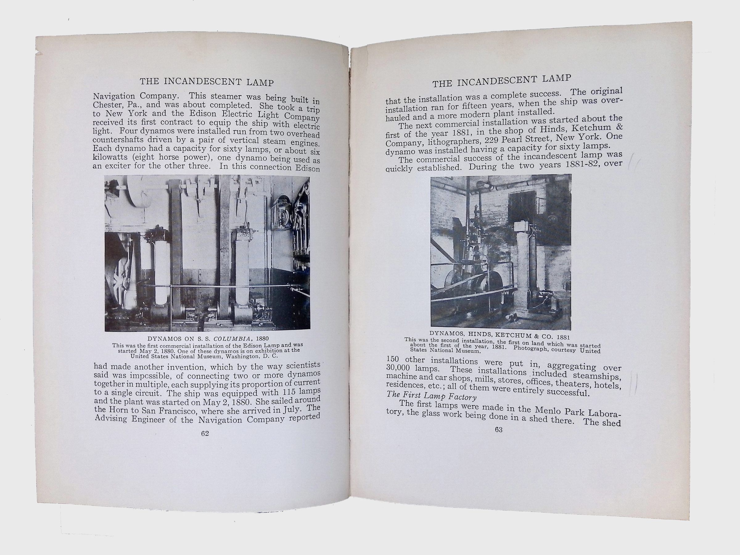 Illustrations and photographs of early incandescent lamps and lighting systems.
