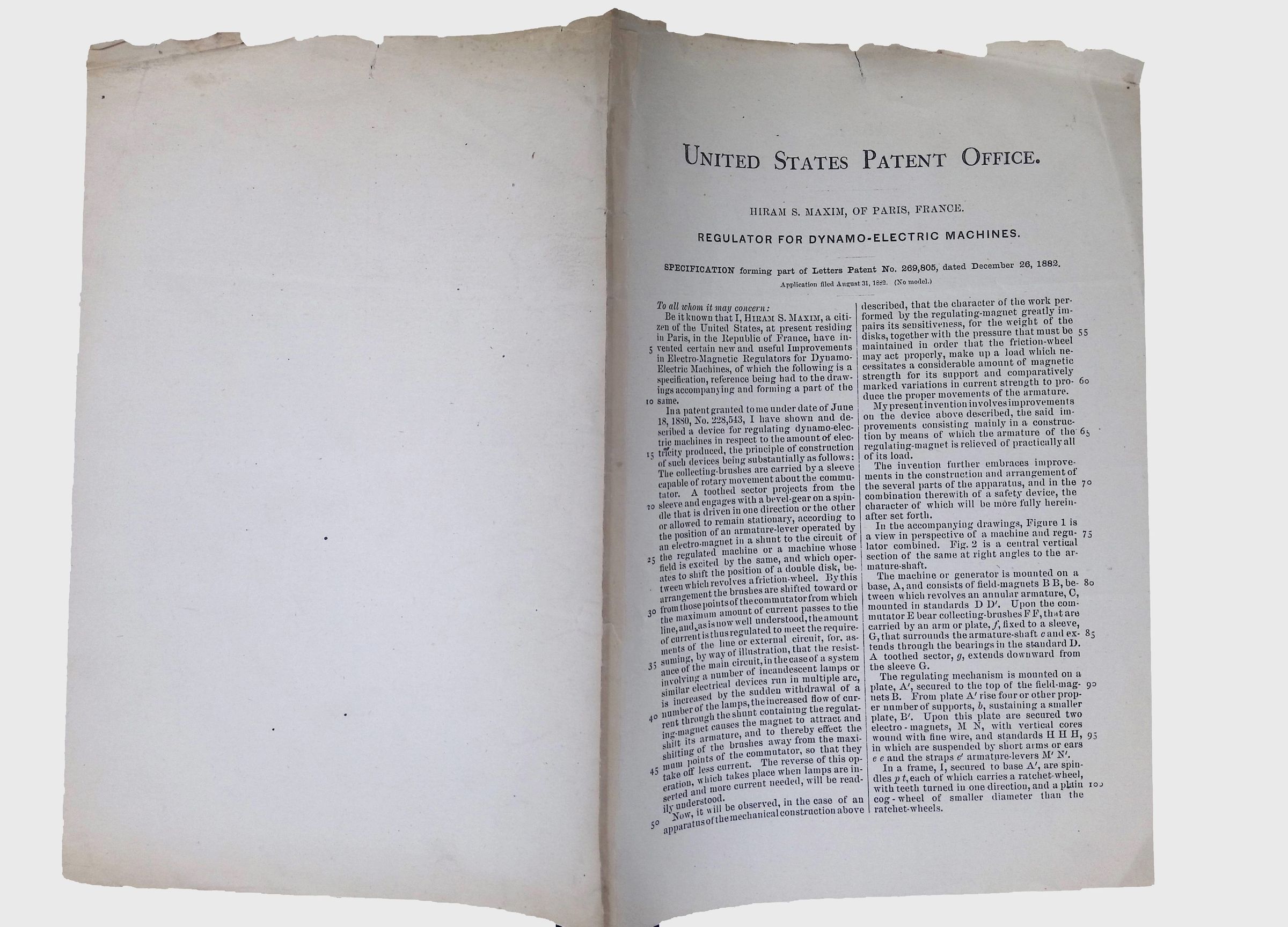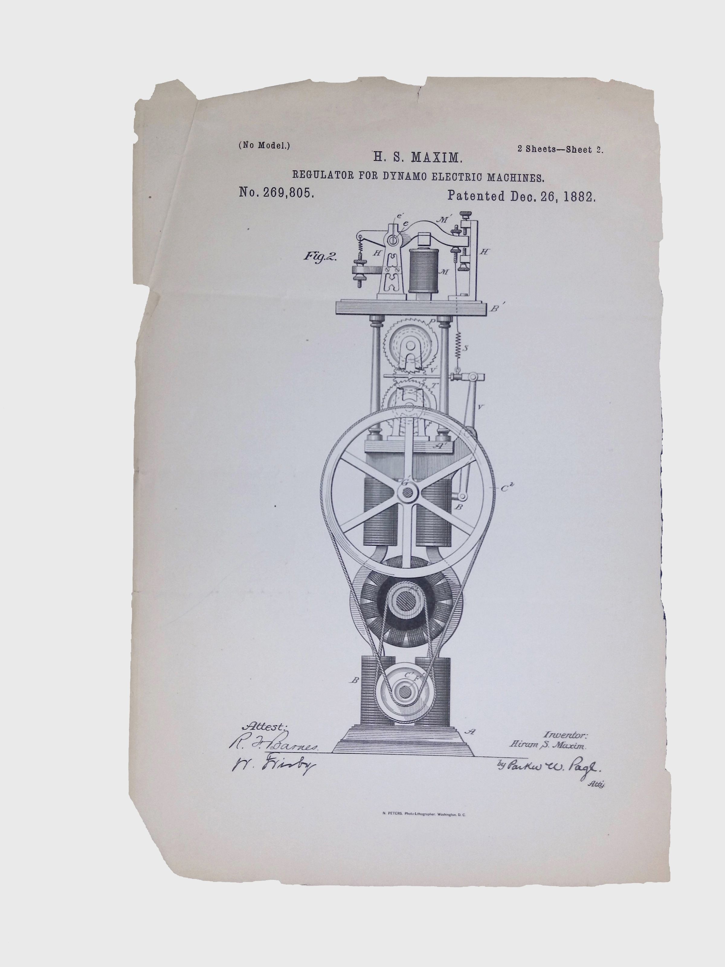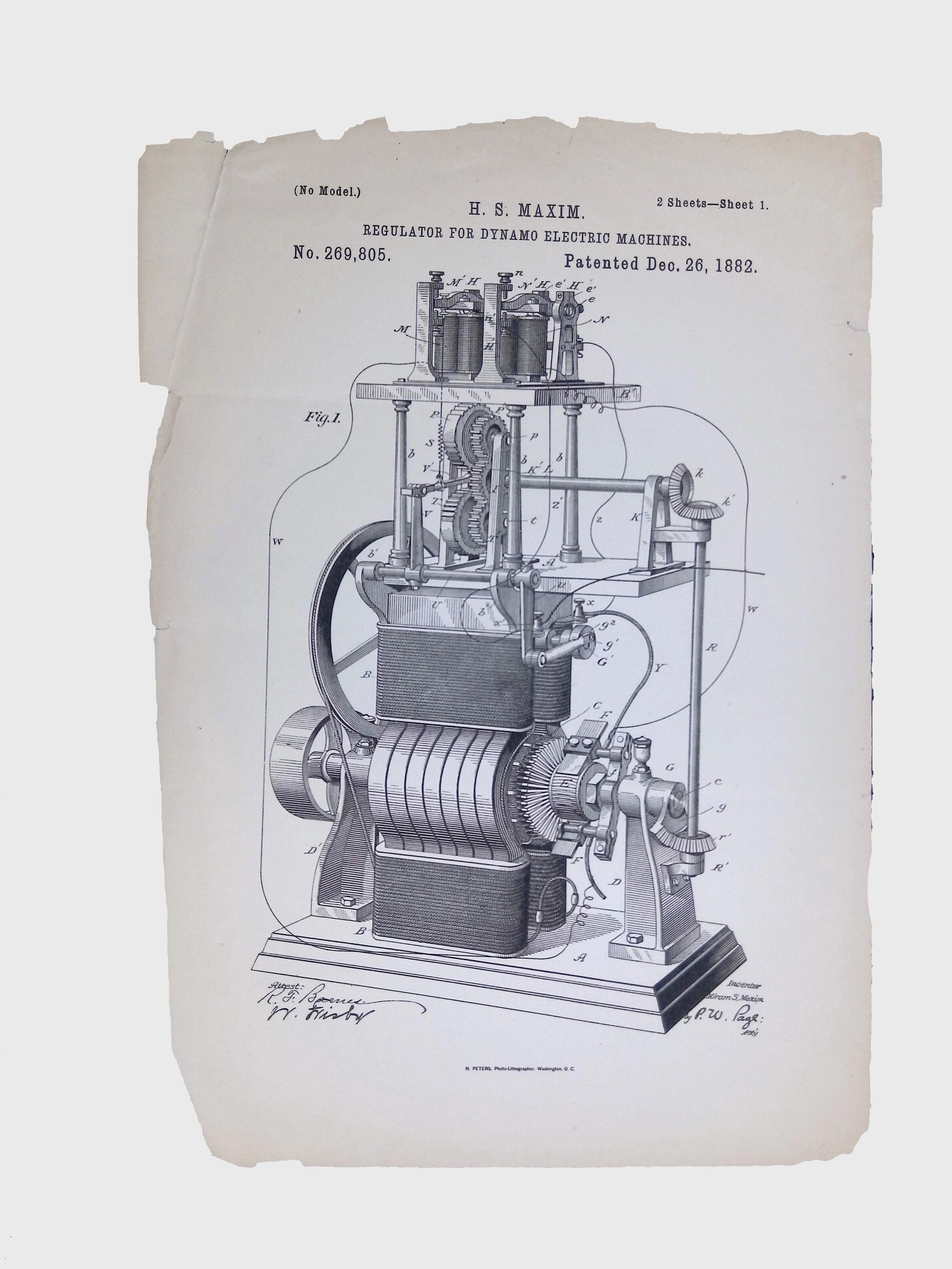 A patent granted to Hiram S. Maxim on December 26, 1882, for a regulator designed to improve the performance of dynamo-electric machines. Lewis Latimer was an employee of Hiram Maxim’s during the early 1880s, and it is possible that he was involved in helping to develop or illustrate this prototype.Collection
