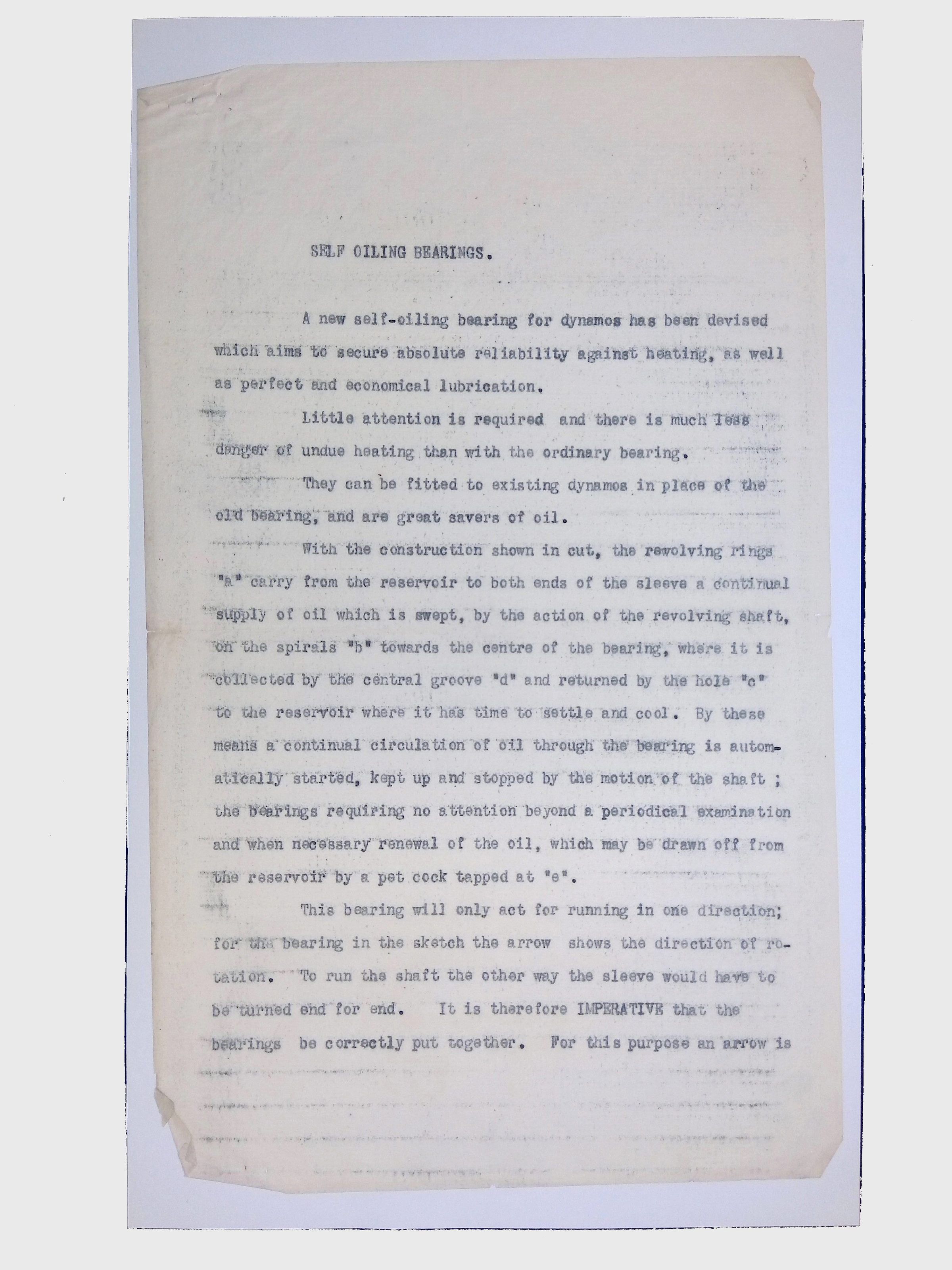 Self Oiling Bearings, (1 folder, ca. 1890)Scope and Content