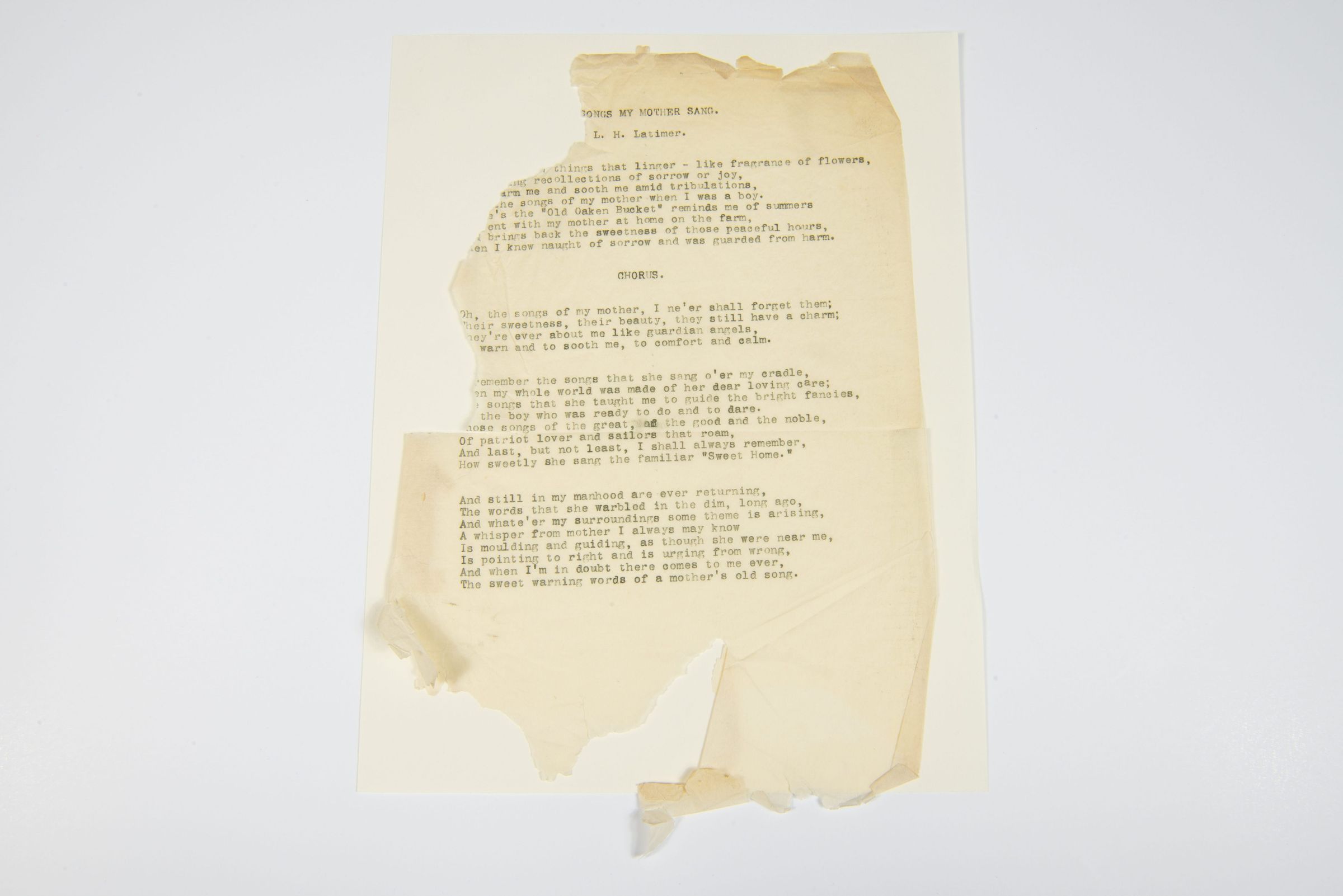 This is a typewritten poem titled "Songs My Mother Sang," authored by Lewis H. Latimer. The poem reflects on the nostalgia and emotional power of a mother’s songs, comparing them to the fragrance of flowers and the comfort of guardian angels. The verses describe memories of childhood, guidance through life’s difficulties, and the lasting influence of a mother’s words. A chorus section emphasizes the warmth and enduring presence of these songs.