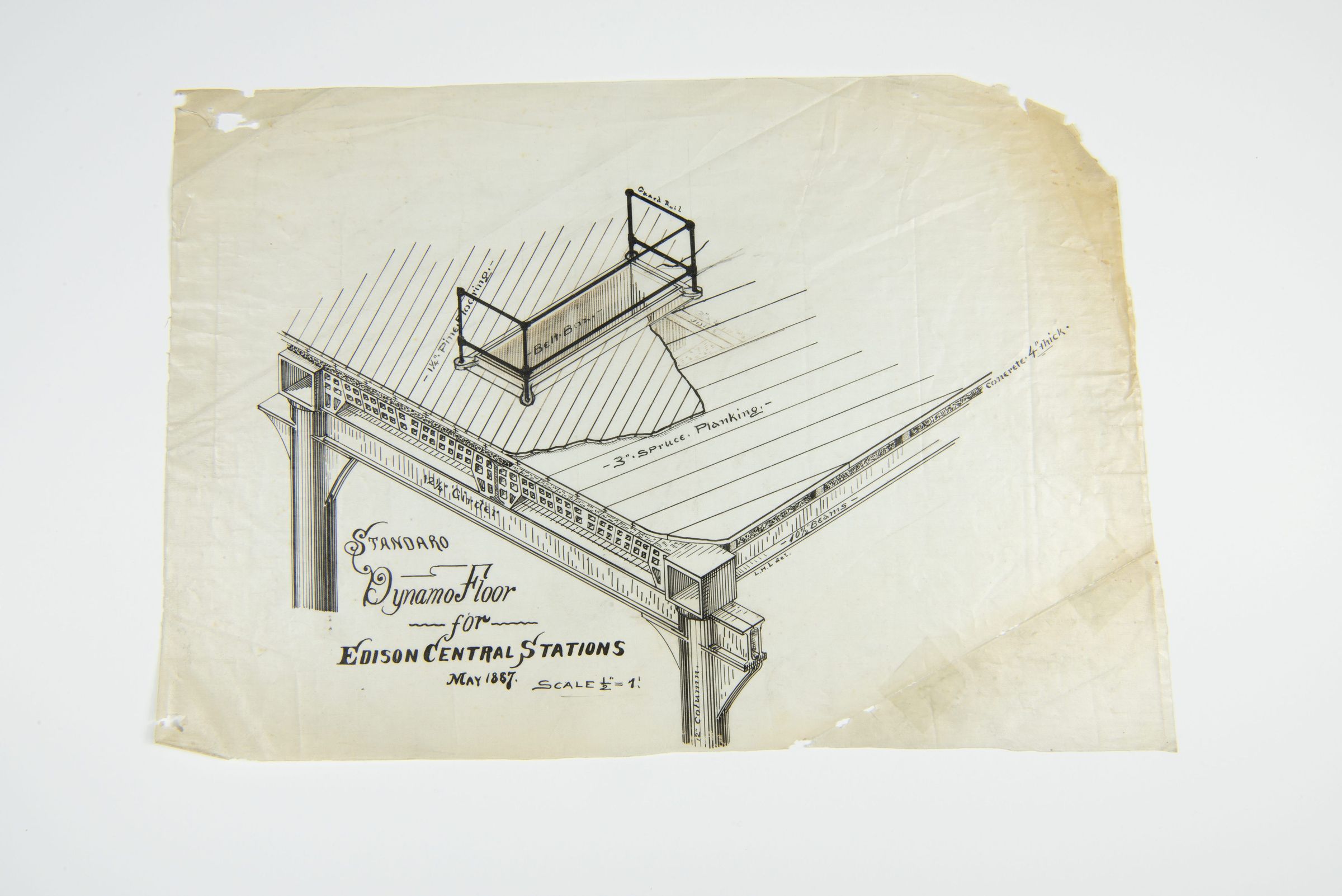 Lewis Latimer inspected the Central Stations that the Edison Company built in various cities to supply electricity to customers. Here he drew a diagram of reinforced floors that reduced the vibrations that could disable the dynamos powering such plants. This drawing reflects the infrastructural planning behind Thomas Edison's Central Power Stations, which were pioneering in bringing electricity to urban centers in the late 19th century. As part of Edison’s early electrical distribution system, these stations housed dynamos (early generators) that provided direct current (DC) electricity. The meticulous detailing in this drawing highlights the careful engineering required to construct stable flooring capable of supporting the weight and vibration of these machines. Lewis H. Latimer, an important contributor to Edison’s work, was involved in drafting, engineering, and patenting key innovations in electric lighting and infrastructure during this period.Collection
