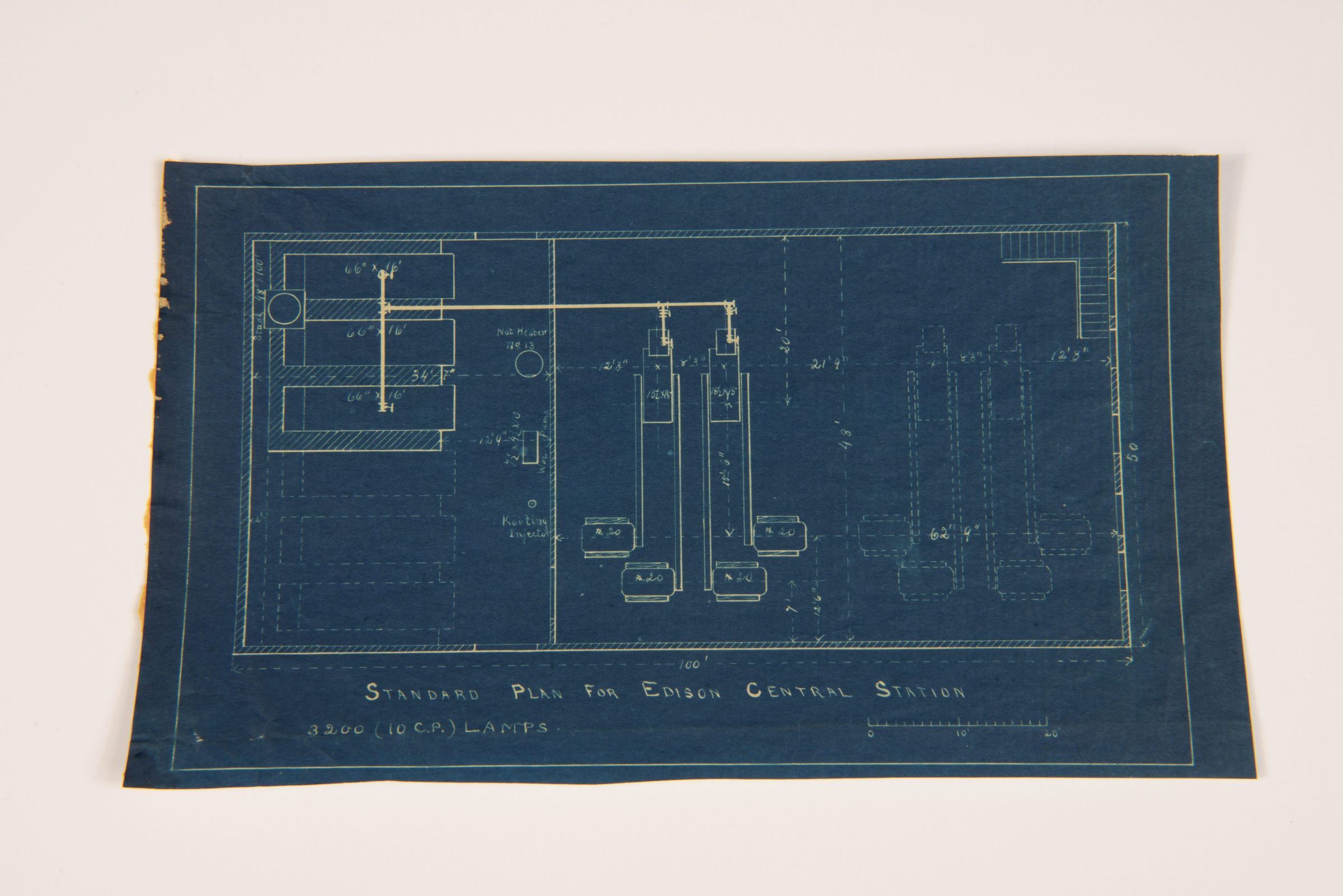 This document is a schematic plan for an Edison Central Station, which was an early power generation facility used to supply electricity for lighting in the late 19th century. These stations were a critical part of Thomas Edison’s electric lighting system, helping to distribute power efficiently to homes and businesses. The reference to 3,200 lamps indicates the intended power capacity of this particular station. The blueprint reflects engineering precision in early electrical infrastructure design. Lewis Latimer inspected the Central Stations that the Edison Company built in various cities to supply electricity to customers. Latimer kept numerous blueprints relating to his work.Collection
