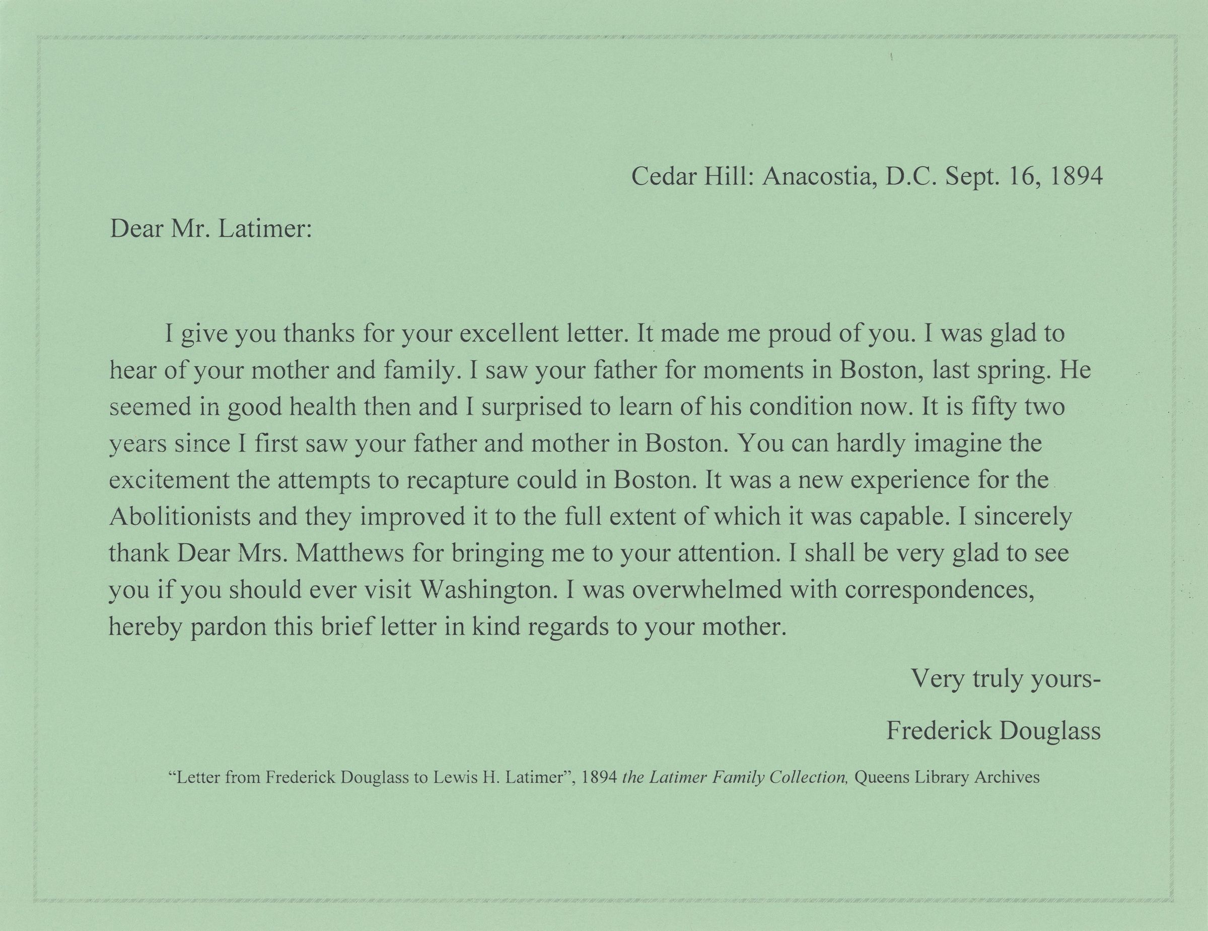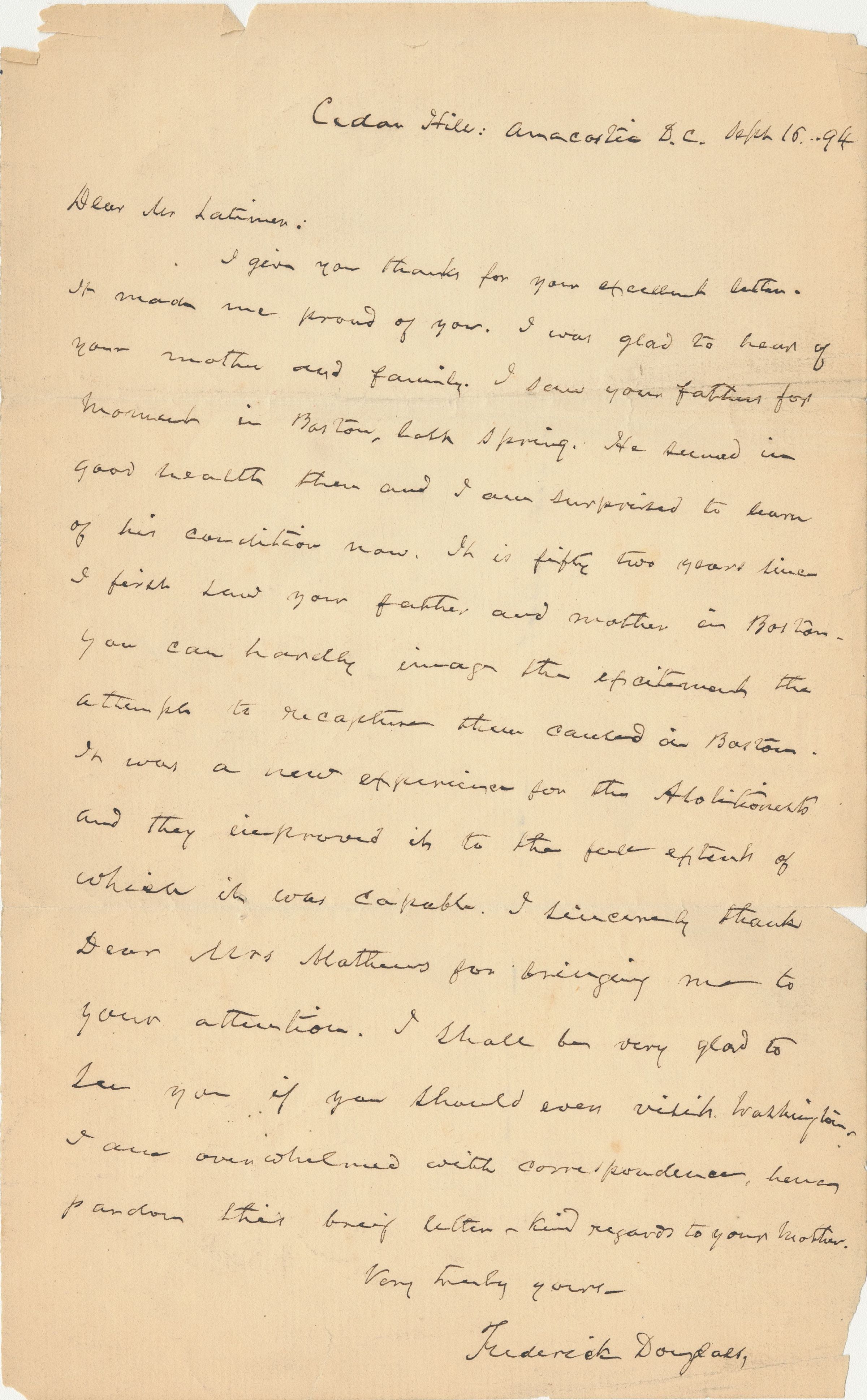 This is a handwritten letter from Frederick Douglass, the renowned abolitionist, orator, and statesman, to Lewis H. Latimer, the African American inventor and draftsman. Dated September 16, 1894, and sent from Cedar Hill, Anacostia, D.C., Douglass expresses pride in Latimer’s achievements, reflects on having seen Latimer’s father in Boston, and recalls the abolitionist movement’s response to efforts to recapture fugitive enslaved people. The letter also acknowledges Mrs. Matthews for reintroducing Latimer to him and extends an invitation for Latimer to visit him in Washington, D.C.
