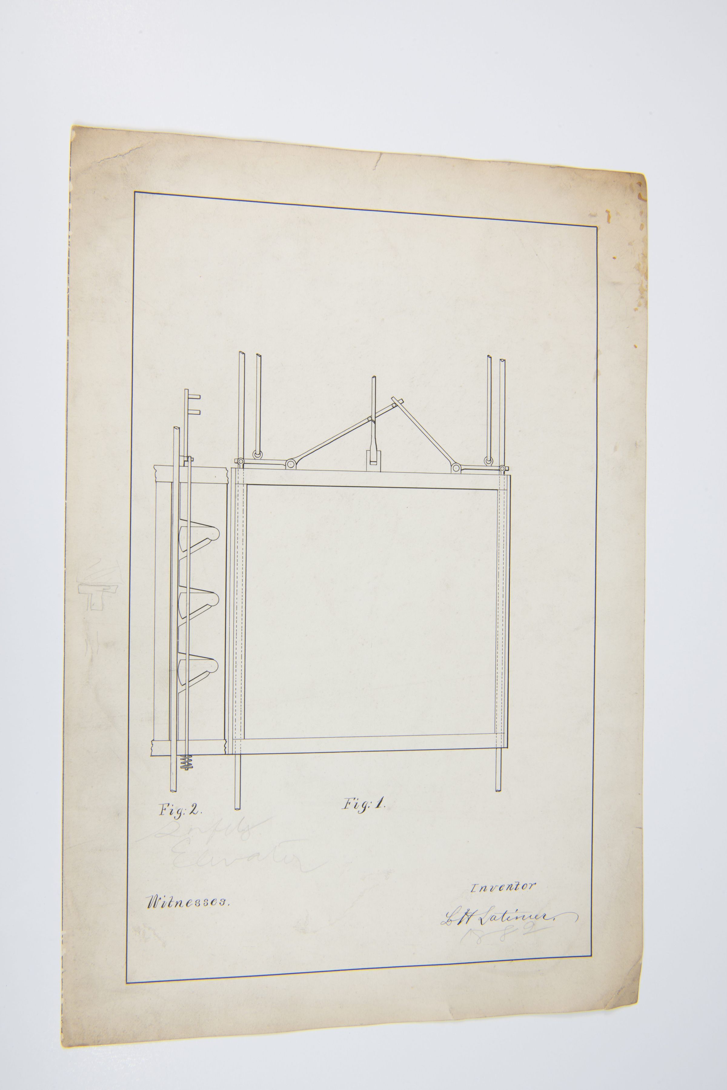 Fig. 1 Fig. 2 Inventor L.H. Latimer Witnesses [Faint penciled text, "Safety Elevator" and “1882”]