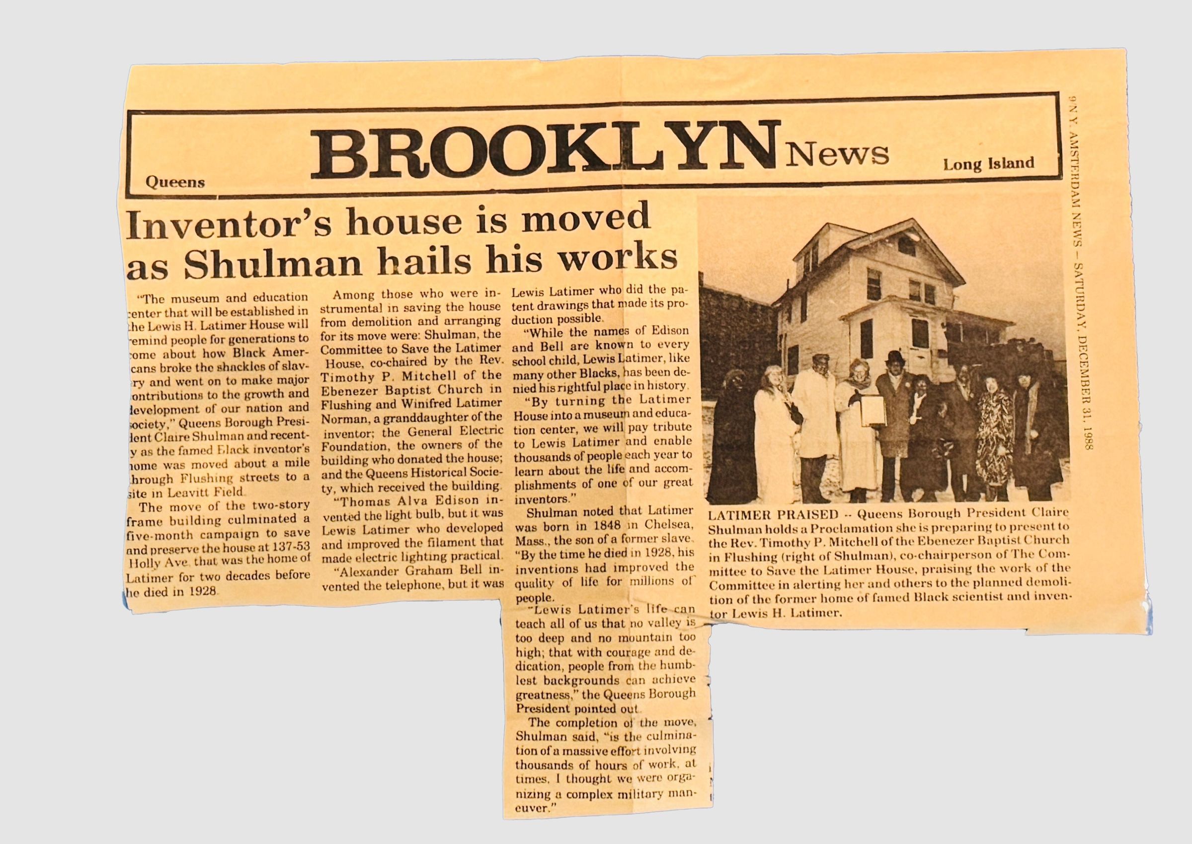 This newspaper article celebrates the successful efforts to save the Latimer House from demolition, ensuring its legacy as a site for learning and homage to Lewis H. Latimer's groundbreaking contributions to science and society. The house was moved from its original location at 64 Holly Street in Flushing, Queens, to its current location in Flushing in 1988.Context
