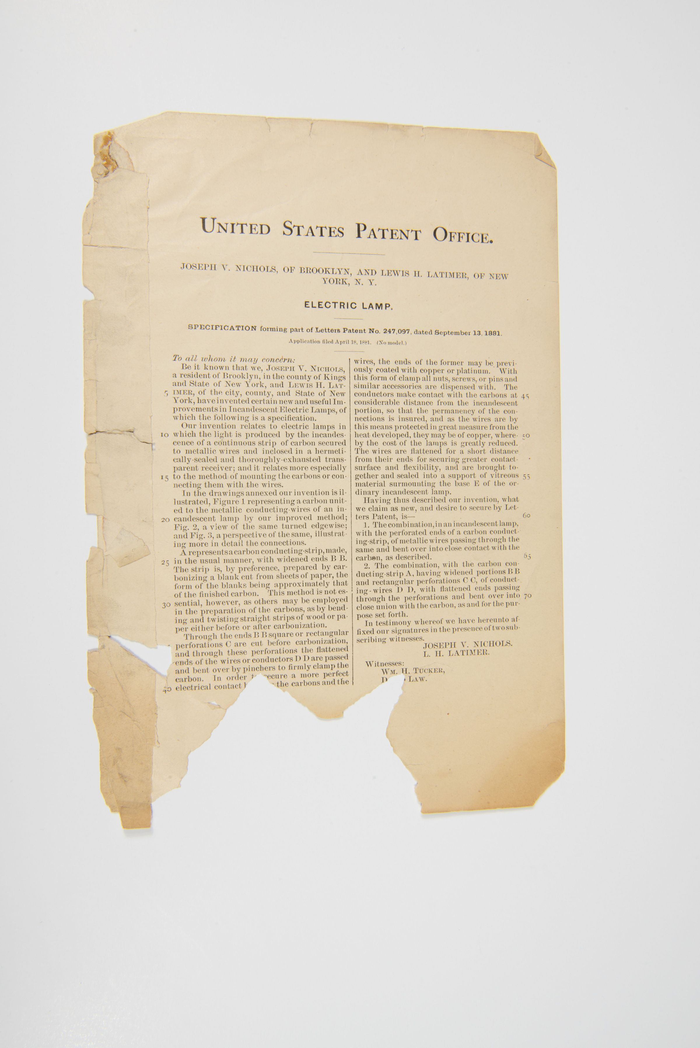 Lewis H. Latimer was a pioneering Black inventor and engineer who played a role in refining and improving the incandescent light bulb. He worked with Alexander Graham Bell and Hiram Maxim and for Thomas Edison. This patent represents one of Latimer’s contributions to electric lighting technology. This patent was filed during the period when Latimer was working for Hiram Maxim’s U.S. Electric Lighting Company. The patent, submitted by Latimer with fellow Maxim employee Joseph V. Nichols, proposed a new way of clamping carbon strips—the light source inside incandescent glass bulbs—to the wires that supplied electric power to them. This method would end the need for platinum “nuts, screws, or pins... whereby the cost of the lamps is greatly reduced.”Collection