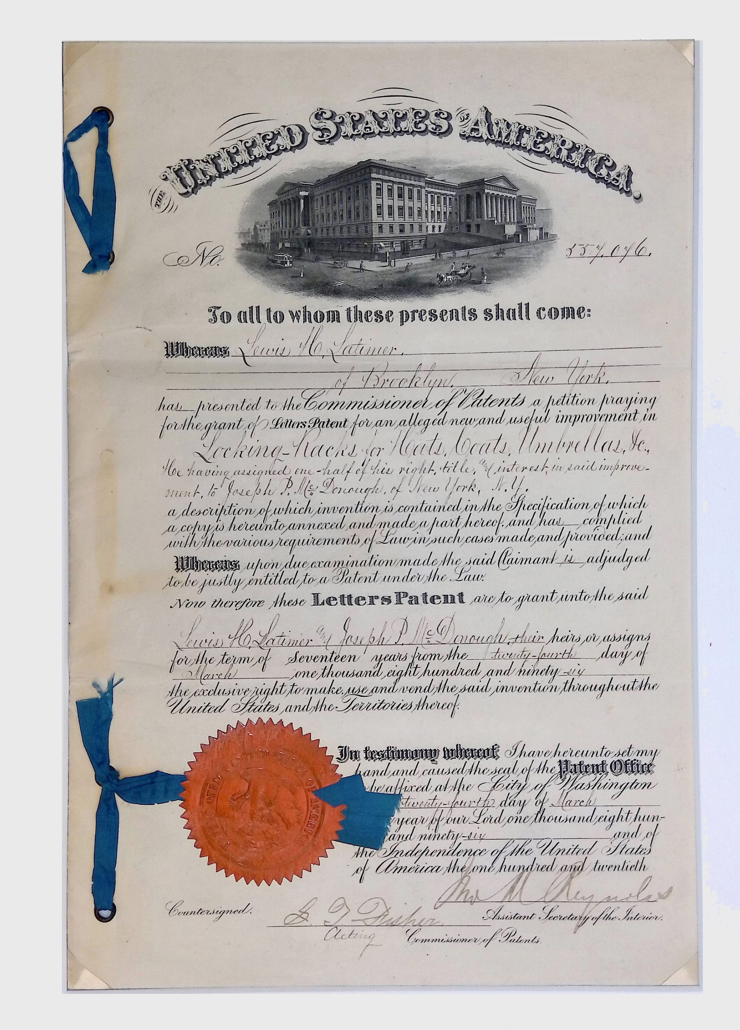 This is an official U.S. patent certificate issued to Lewis H. Latimer of Brooklyn, New York, for his Locking Rack for Hats, Coats, Umbrellas, &c., granted on March 24, 1896. The document represents Latimer’s inventive contributions beyond his well-known work in electric lighting, demonstrating his ingenuity in practical household and industrial applications.Collection