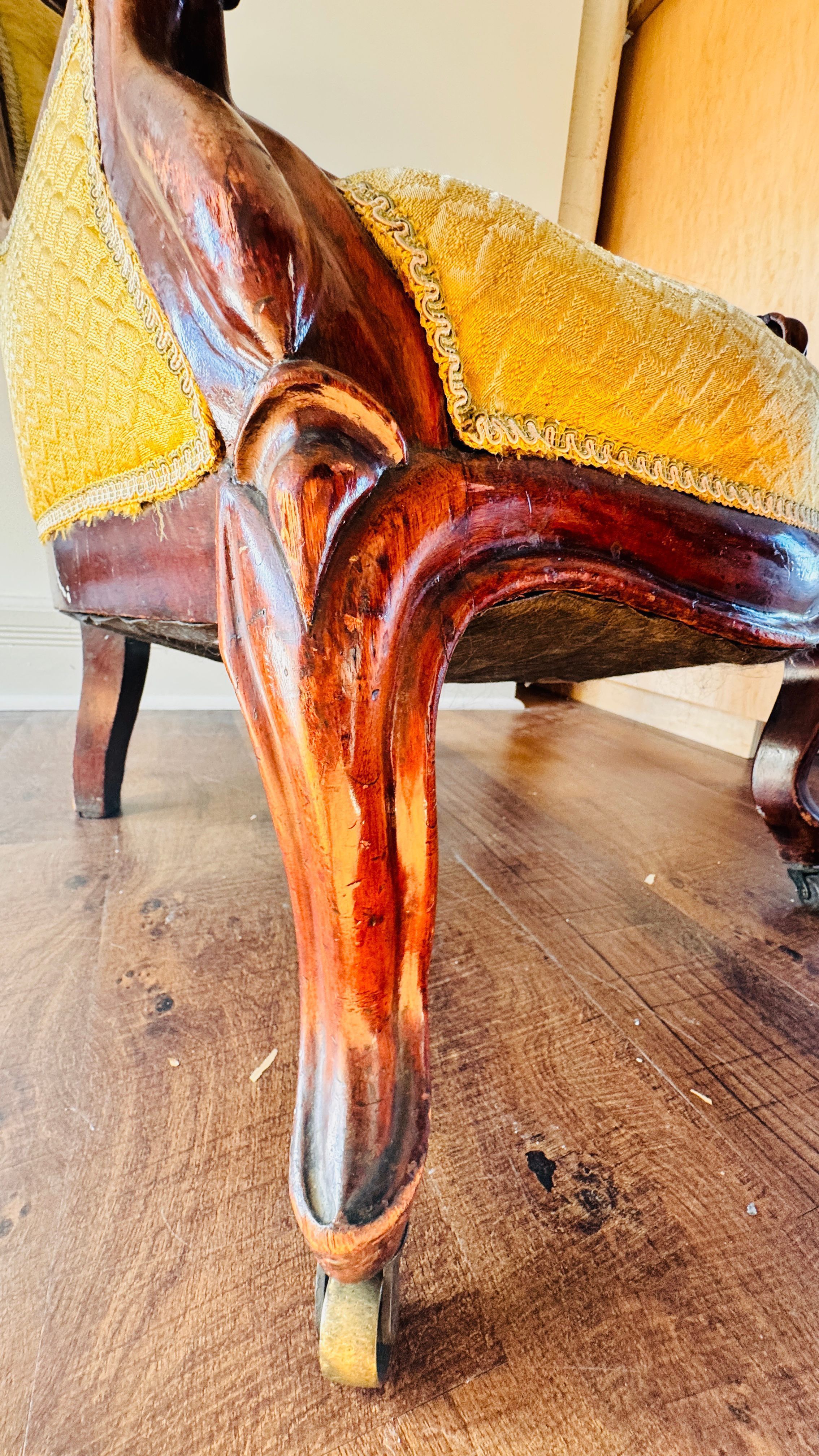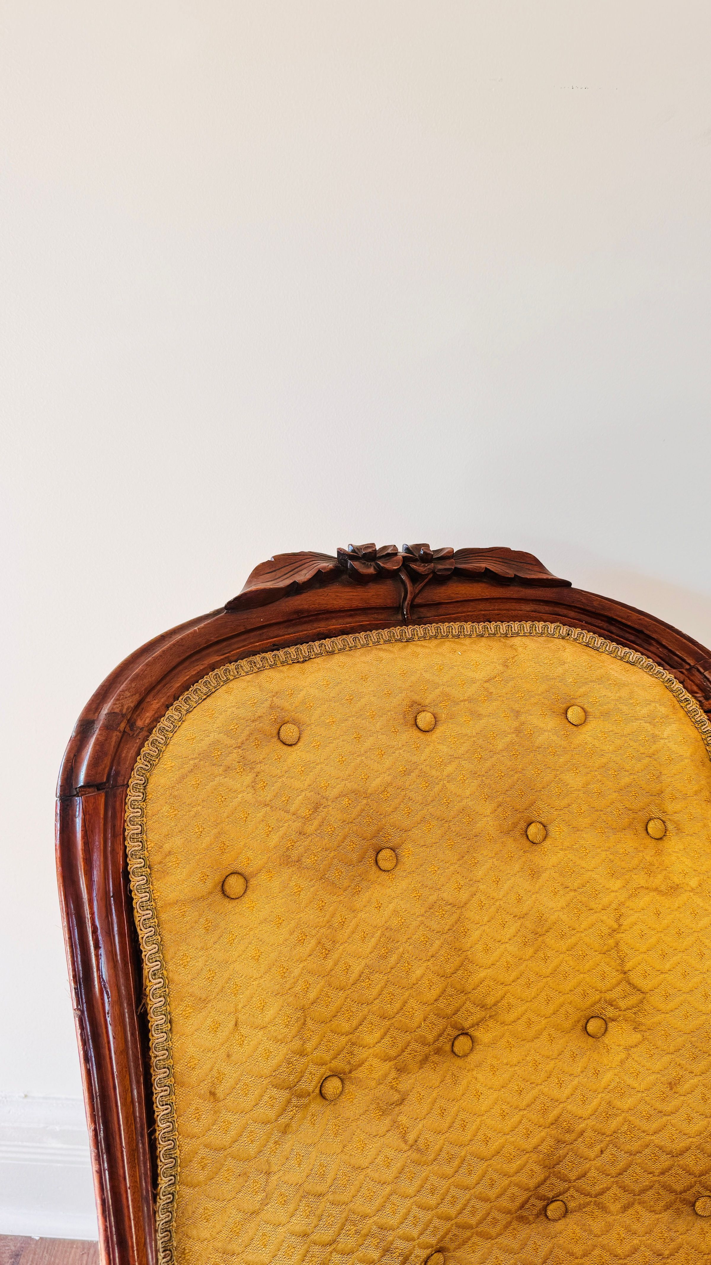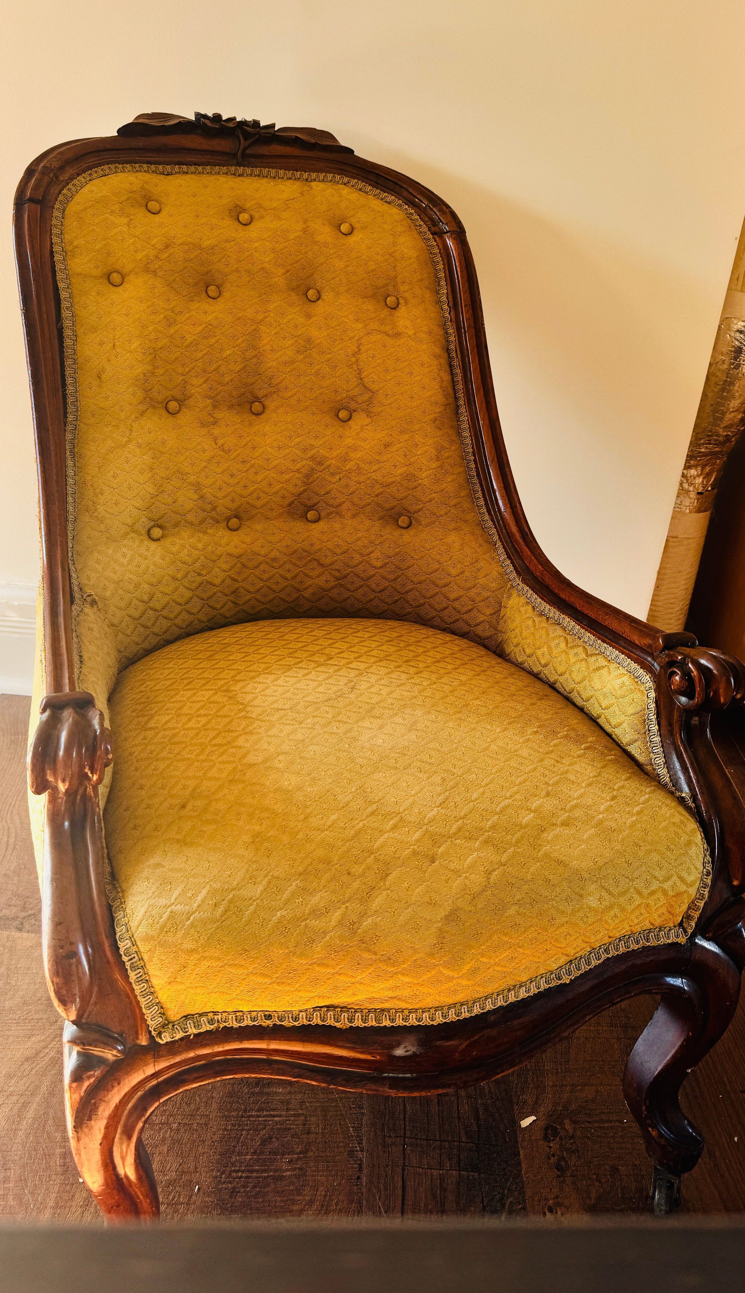 This ornate armchair, once belonging to Lewis Latimer, is crafted from wood and features a hand-carved floral motif on the crest rail. The upholstery is a mustard-gold fabric with a delicate diamond pattern, secured by button tufting along the backrest. The armchair's legs are carved and mounted on castors, enabling easy movement. The piece showcases Latimer's taste for elegant and functional home furnishings, reflecting the aesthetic sensibilities of the Victorian era.Use
