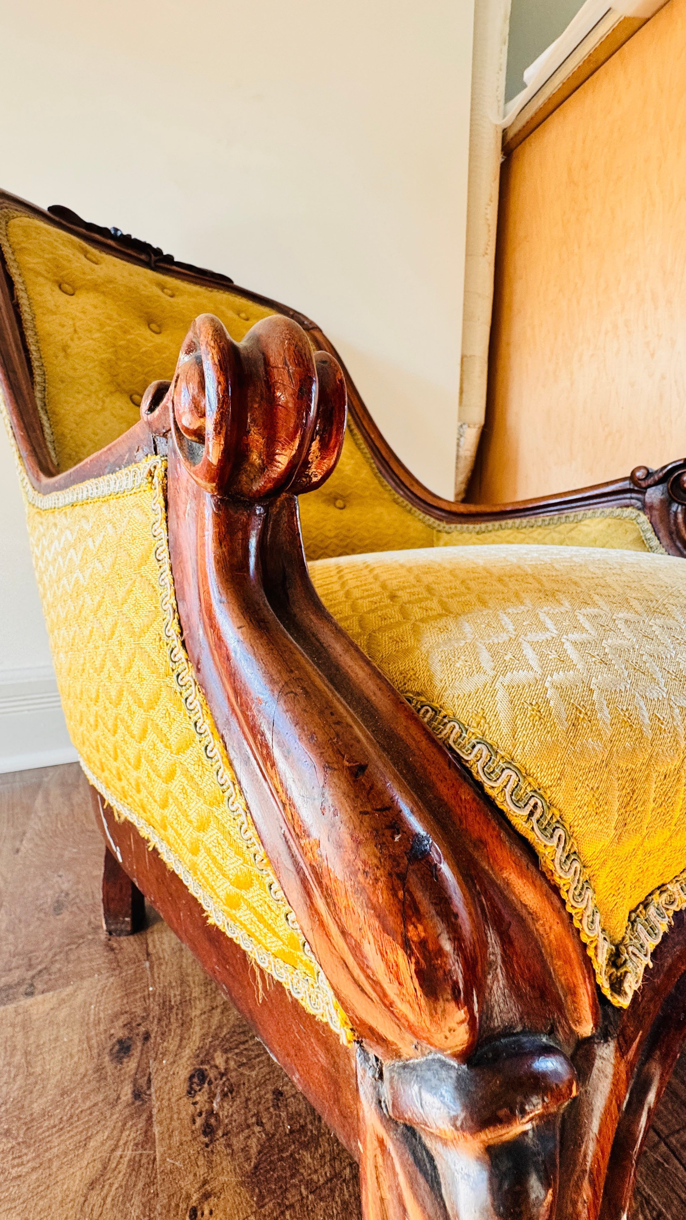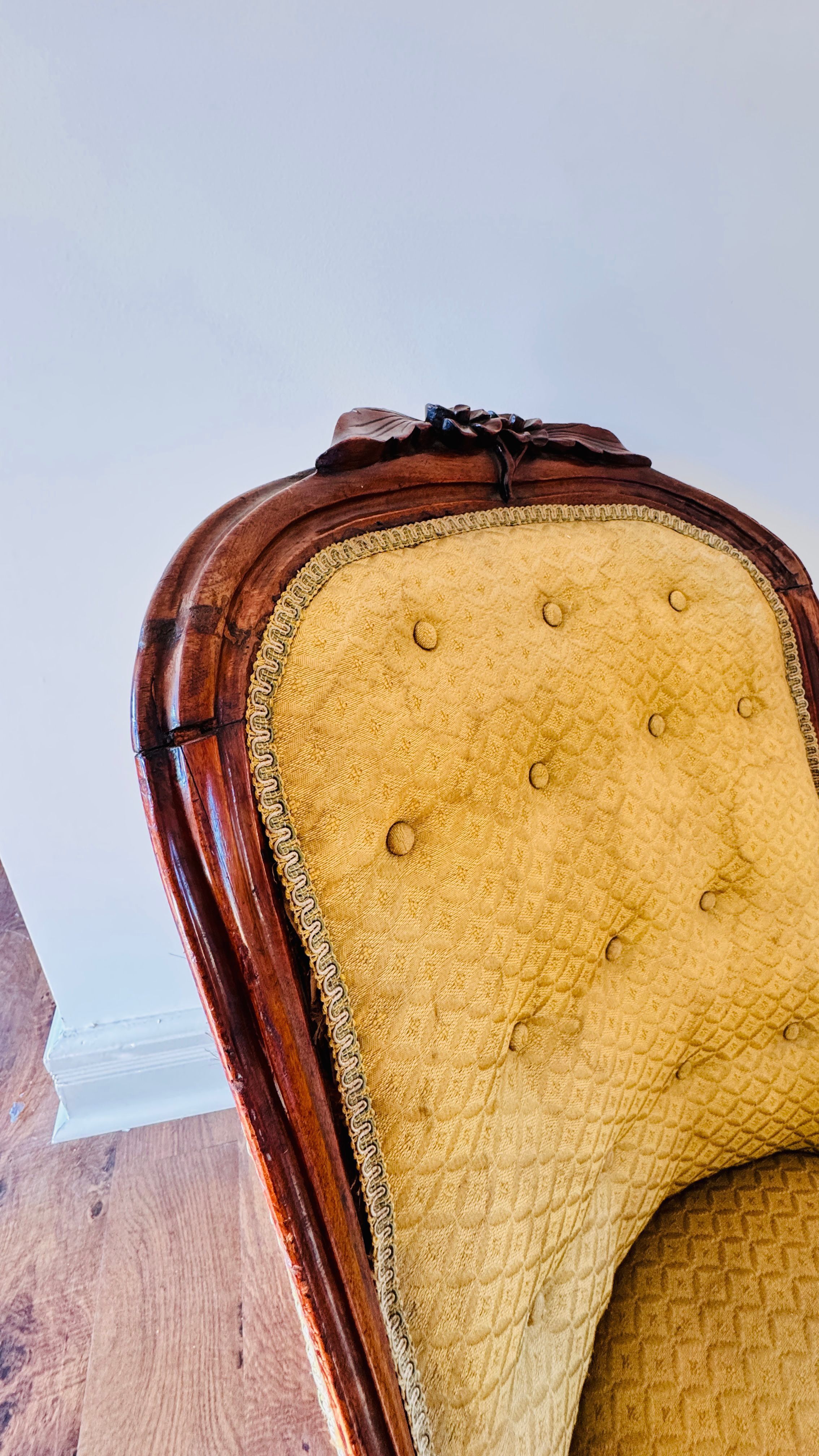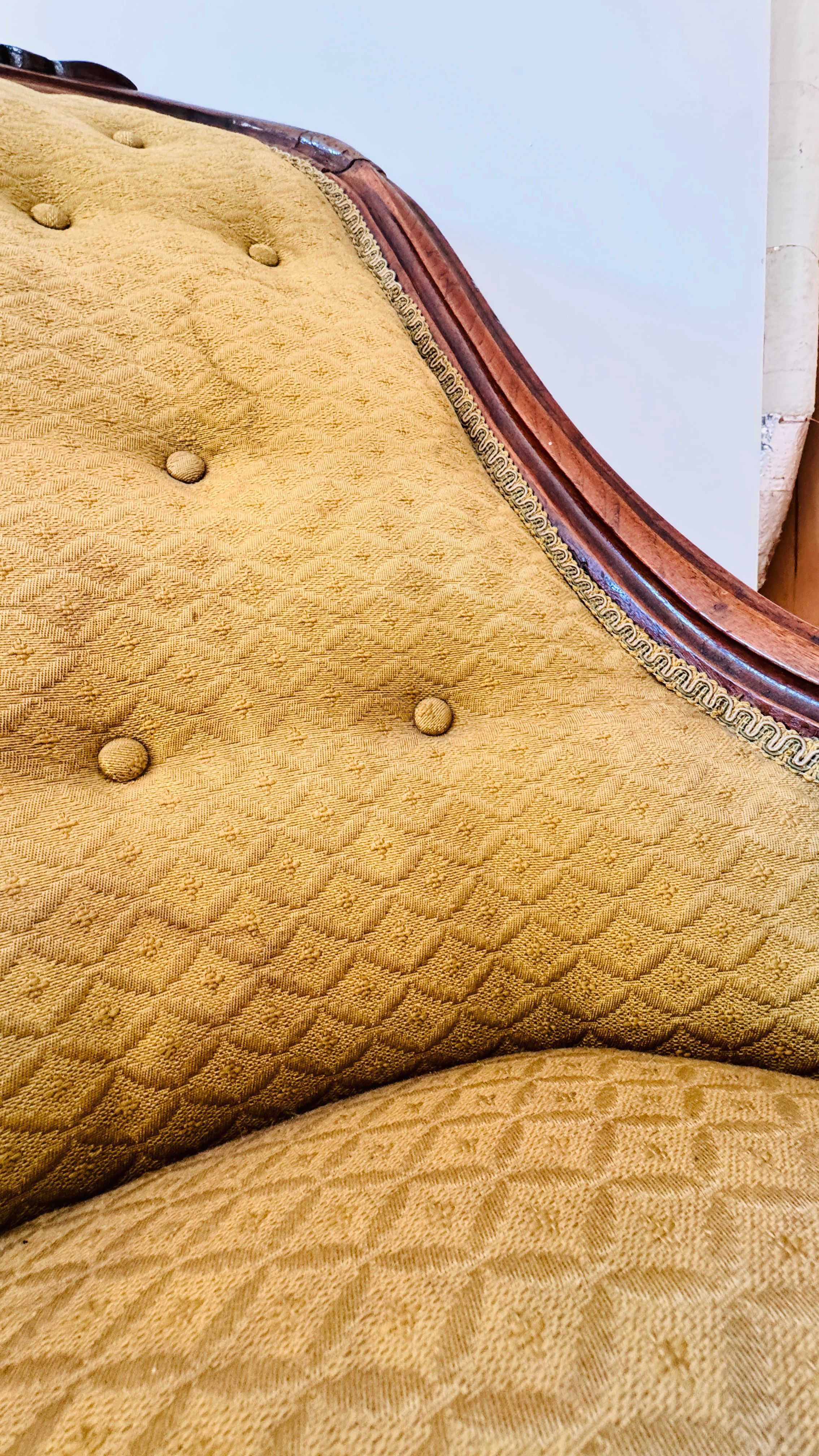 This ornate armchair, once belonging to Lewis Latimer, is crafted from wood and features a hand-carved floral motif on the crest rail. The upholstery is a mustard-gold fabric with a delicate diamond pattern, secured by button tufting along the backrest. The armchair's legs are carved and mounted on castors, enabling easy movement. The piece showcases Latimer's taste for elegant and functional home furnishings, reflecting the aesthetic sensibilities of the Victorian era.Use
