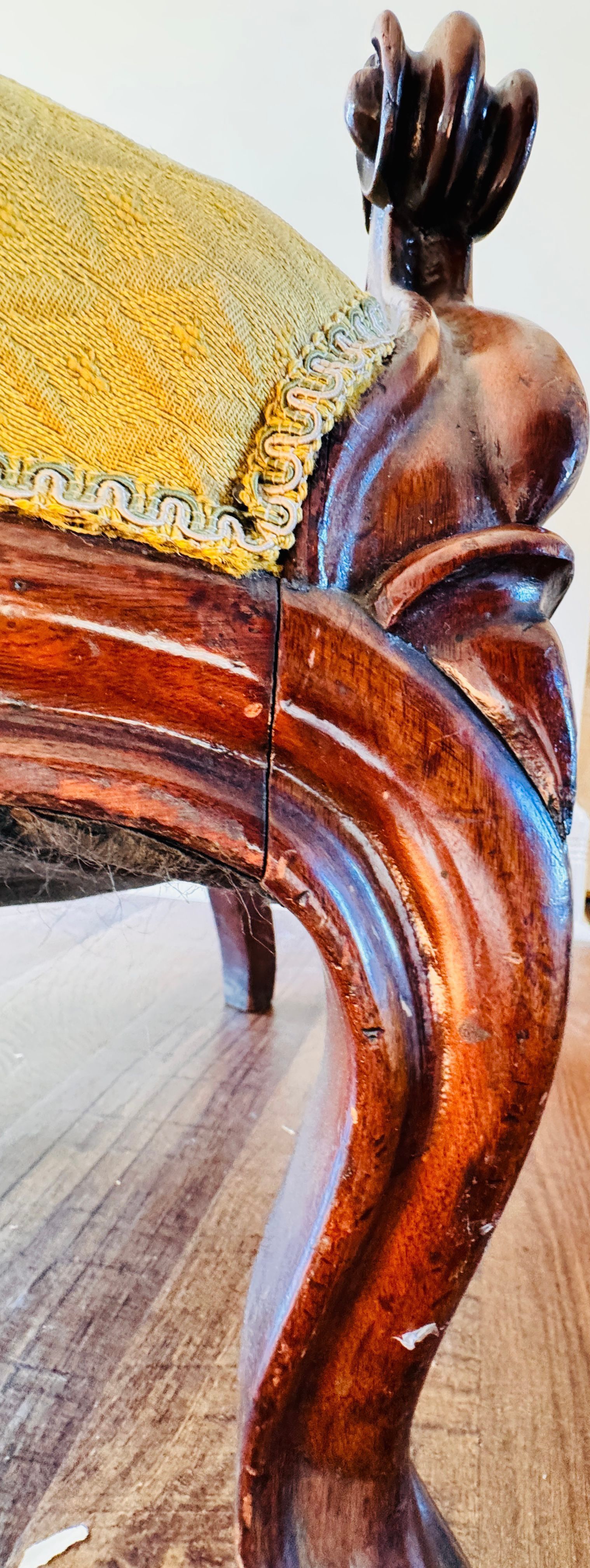 A Victorian-style armchair, originally from the home of Lewis Latimer, featuring intricate wood carving and mustard-gold upholstery. This chair is a fine example of 19th-century craftsmanship and provides a glimpse into the personal furnishings of the renowned inventor.Context