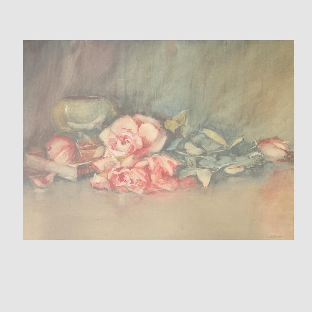Watercolor on paper. The subject is still life of cut roses, vase and book. Signed Louise R. Latimer 1924 on front of painting. The painting is framed in a molded wood frame.Artwork Details