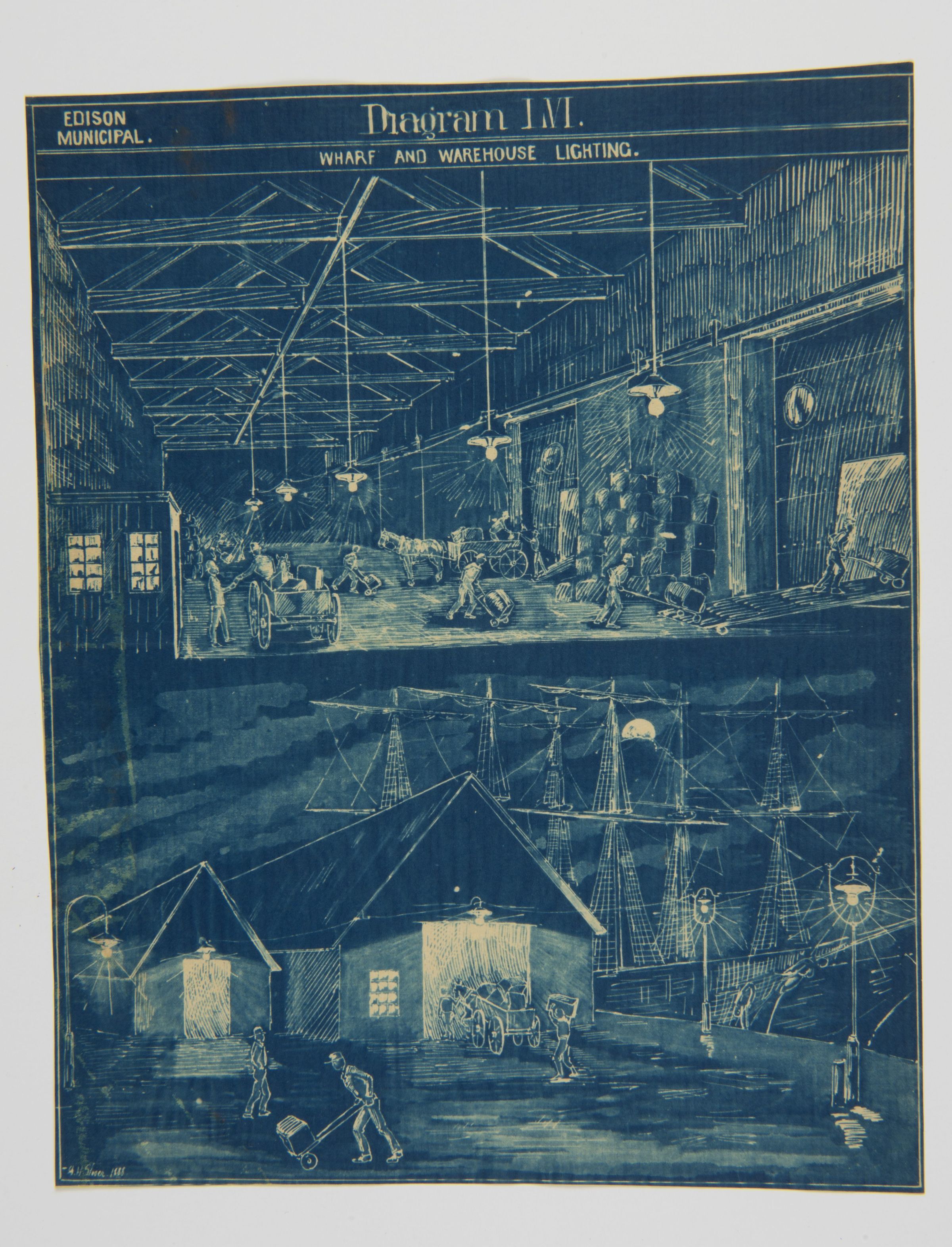 This 1881 blueprint represents an early visualization of electric lighting in industrial and municipal spaces. Lewis H. Latimer, who worked for Edison, played a role in developing and installing electric lighting systems. The drawing highlights how electricity was envisioned as a transformative tool for nighttime industry, improving safety and productivity at shipping docks and warehouses. This document was likely used to promote the benefits of electric lighting in large-scale infrastructure projects during the late 19th century.Collection