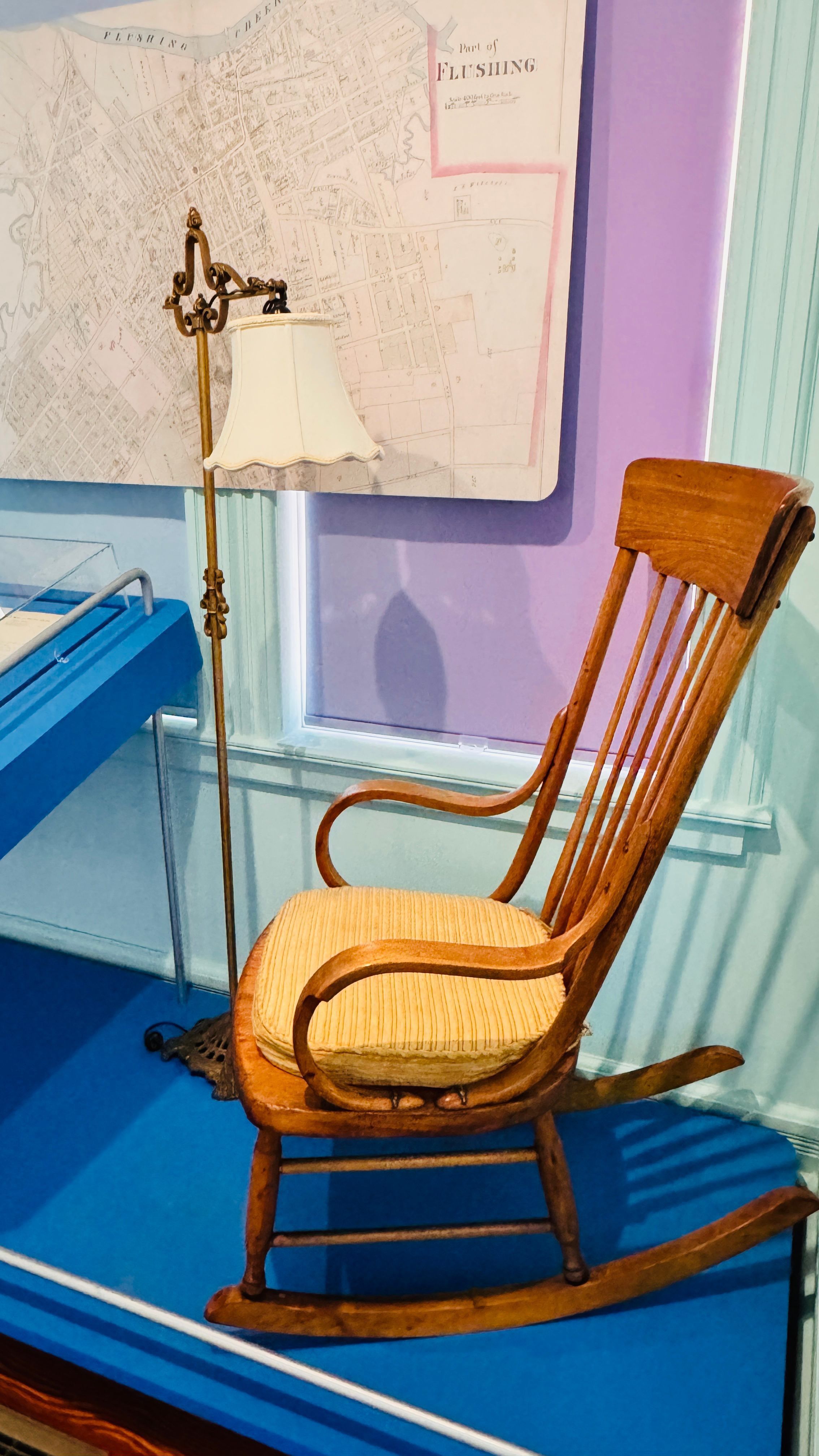 A wooden rocking chair from the Latimer family collection, preserved at the Lewis Latimer House Museum. This piece reflects the family’s taste in practical and comfortable home furnishings.Context