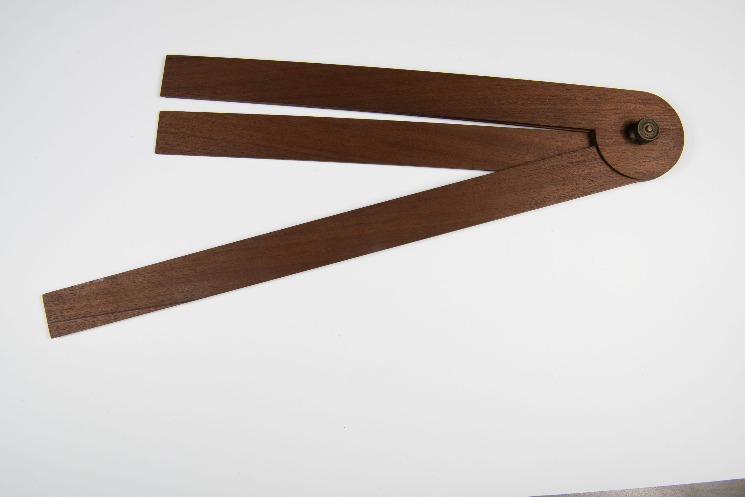 This wooden instrument is a folding drafting or measuring tool, possibly used in engineering, architecture, or carpentry. The tool consists of two long wooden arms connected by a circular pivot point with a brass fastener, allowing for angular adjustments and precise measurements. The wood appears smoothly finished, suggesting it was made for precision work.Context