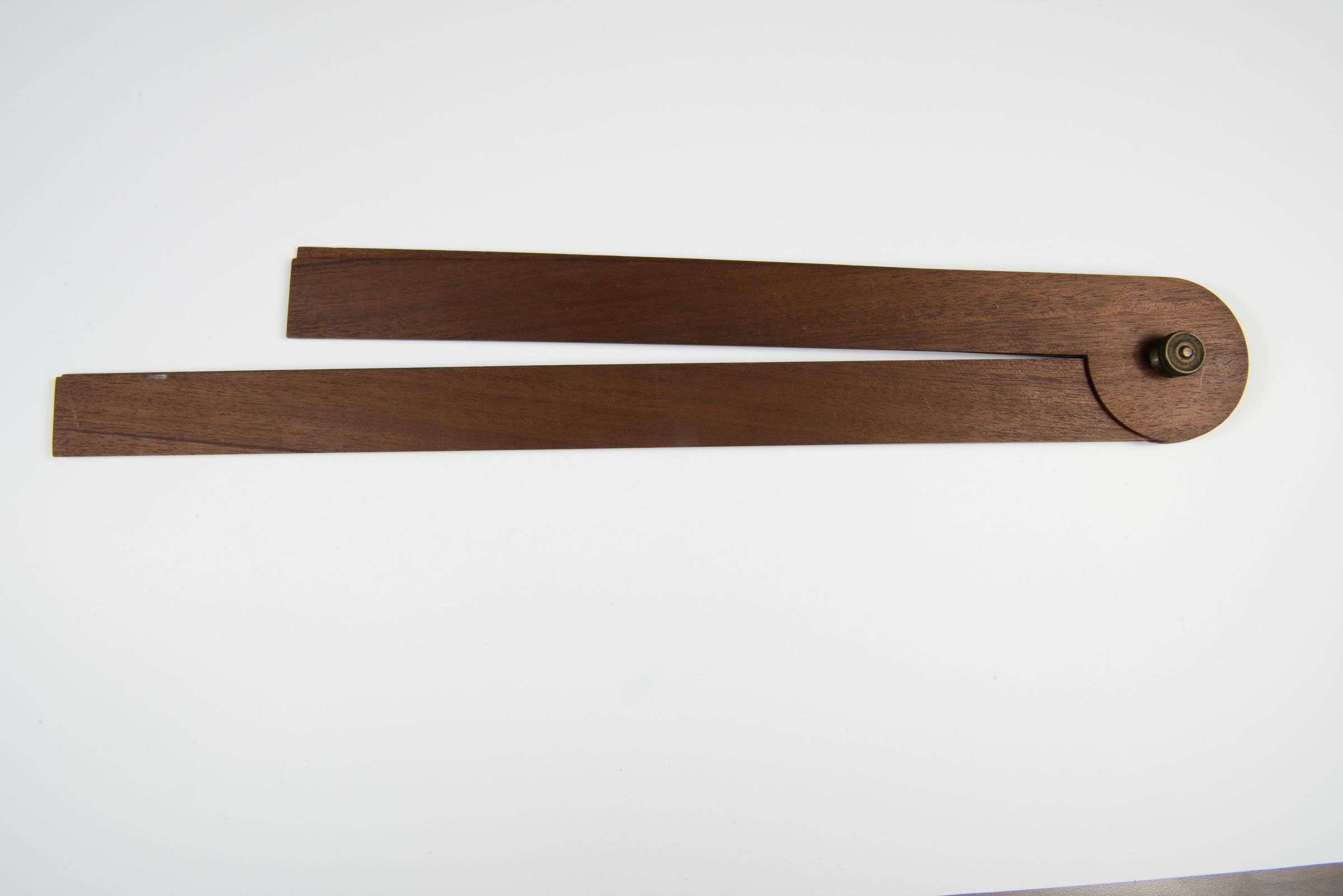 A wooden measuring tool with two pivoting arms connected by a circular brass hinge. The device allows for the measurement and replication of angles. The dark wood and brass fittings suggest it is an older or vintage tool, likely used in engineering, carpentry, or drafting.Context