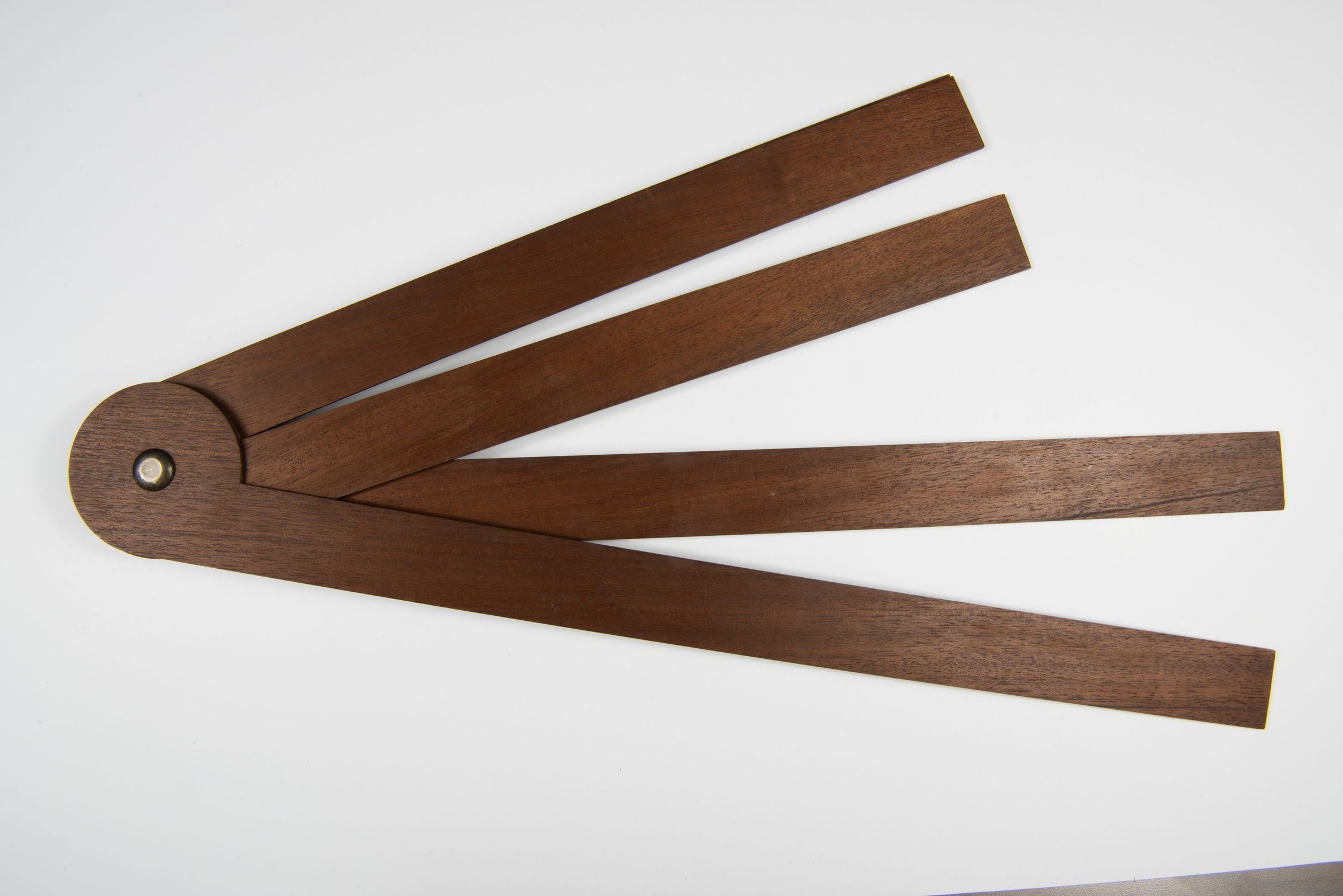A wooden measuring tool with four pivoting arms, joined at a central point with a brass or metal fastener. The arms fan out, forming adjustable angles, suggesting its use as an angle measurer or carpenter’s tool. The wood appears well-crafted and polished, with clean edges and a dark finish.Context