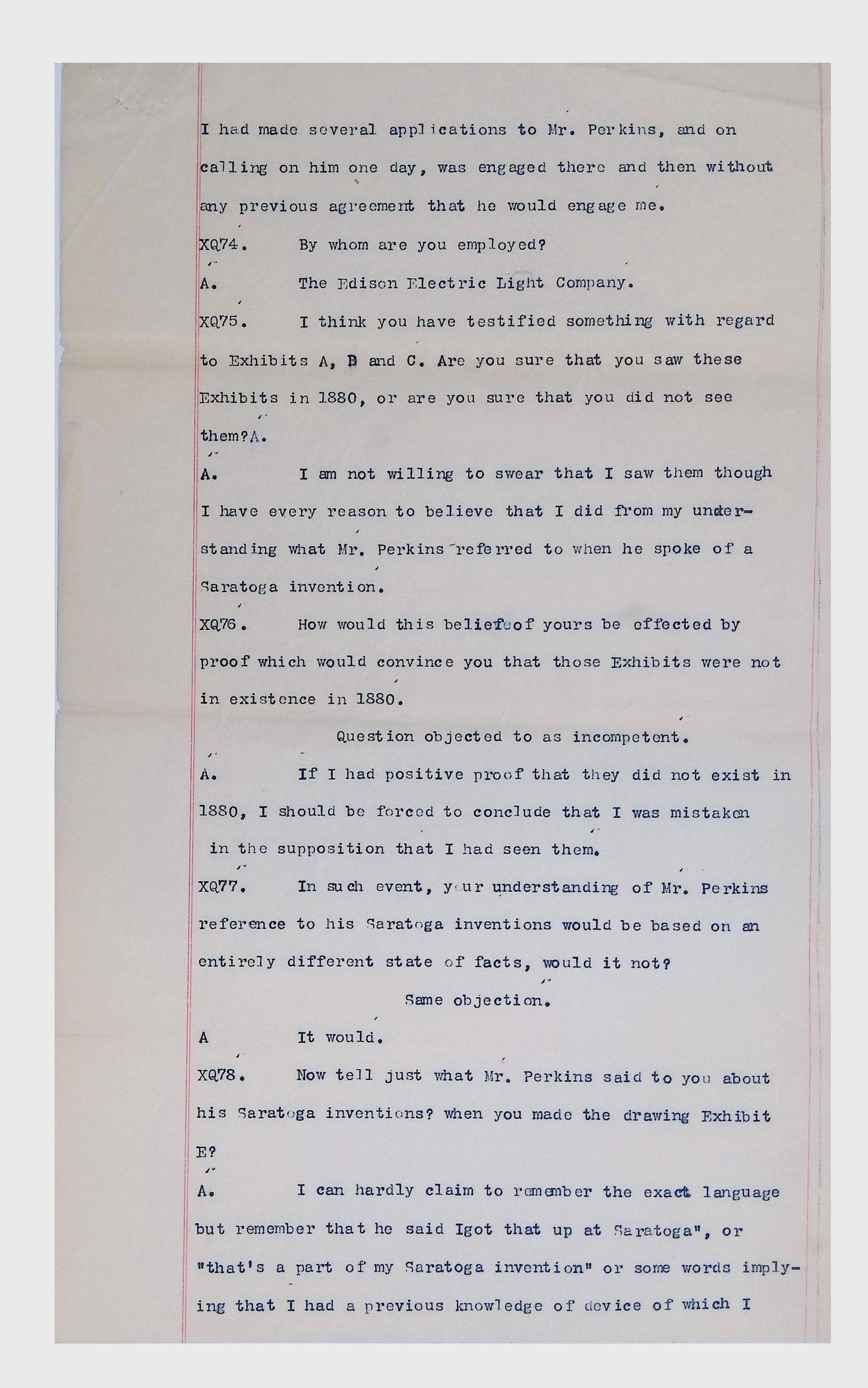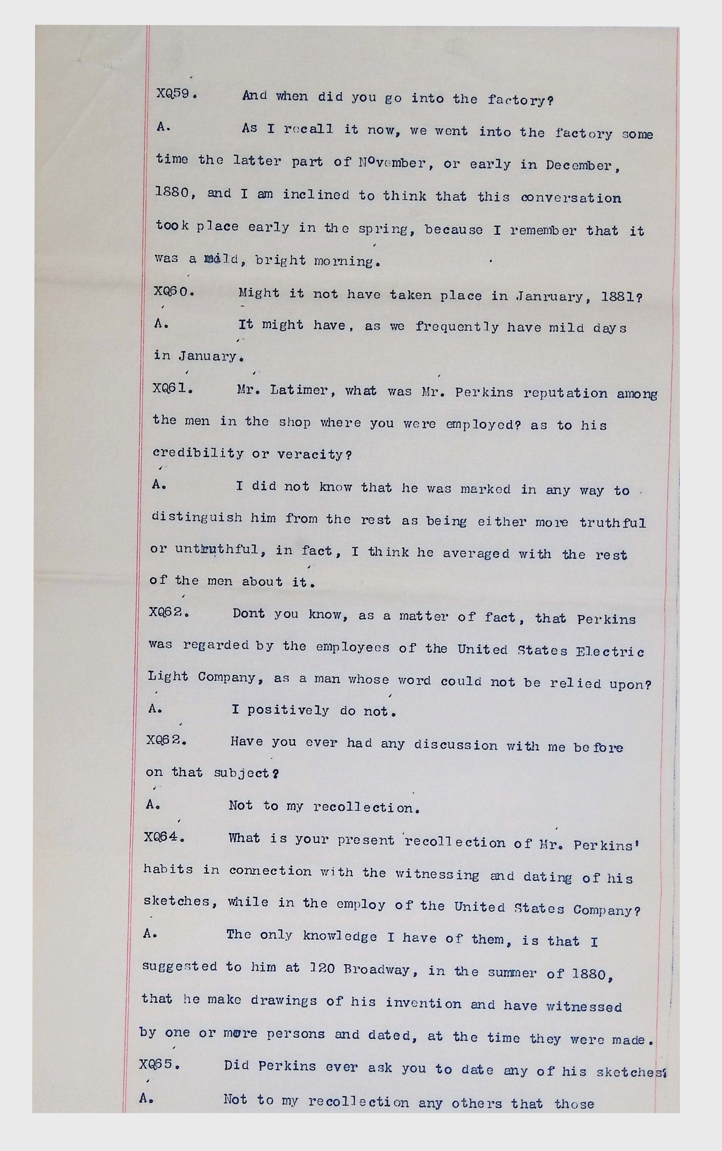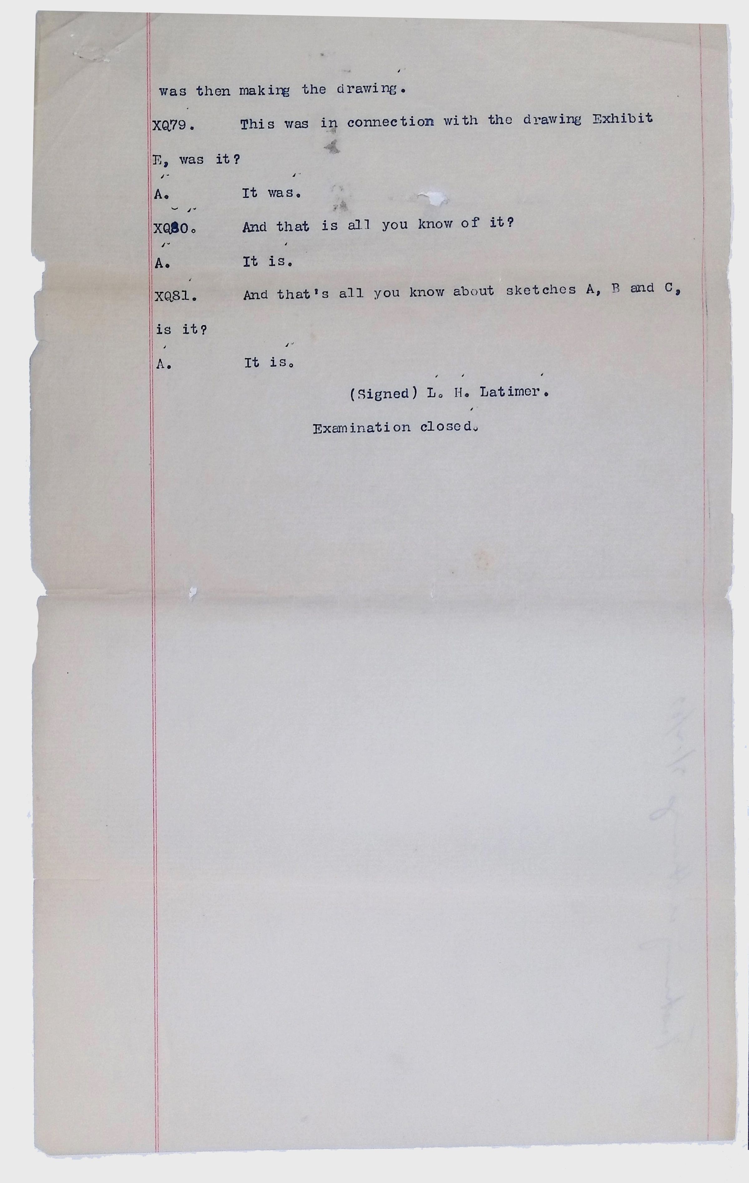 This collection consists of typed and handwritten pages, likely transcripts, depositions, or technical records related to Lewis Latimer’s work in engineering and patent law. These documents may pertain to legal cases, technical patents, or professional correspondence involving Latimer's contributions to electrical engineering and innovation. Specifically, they illustrate Latimer’s professional work as an expert witness in patent lawsuits, and the challenges facing inventors (particularly an African American and at the time relatively unknown inventor such as Latimer) in trying to persuade businesspeople to put inventions into production.Collection