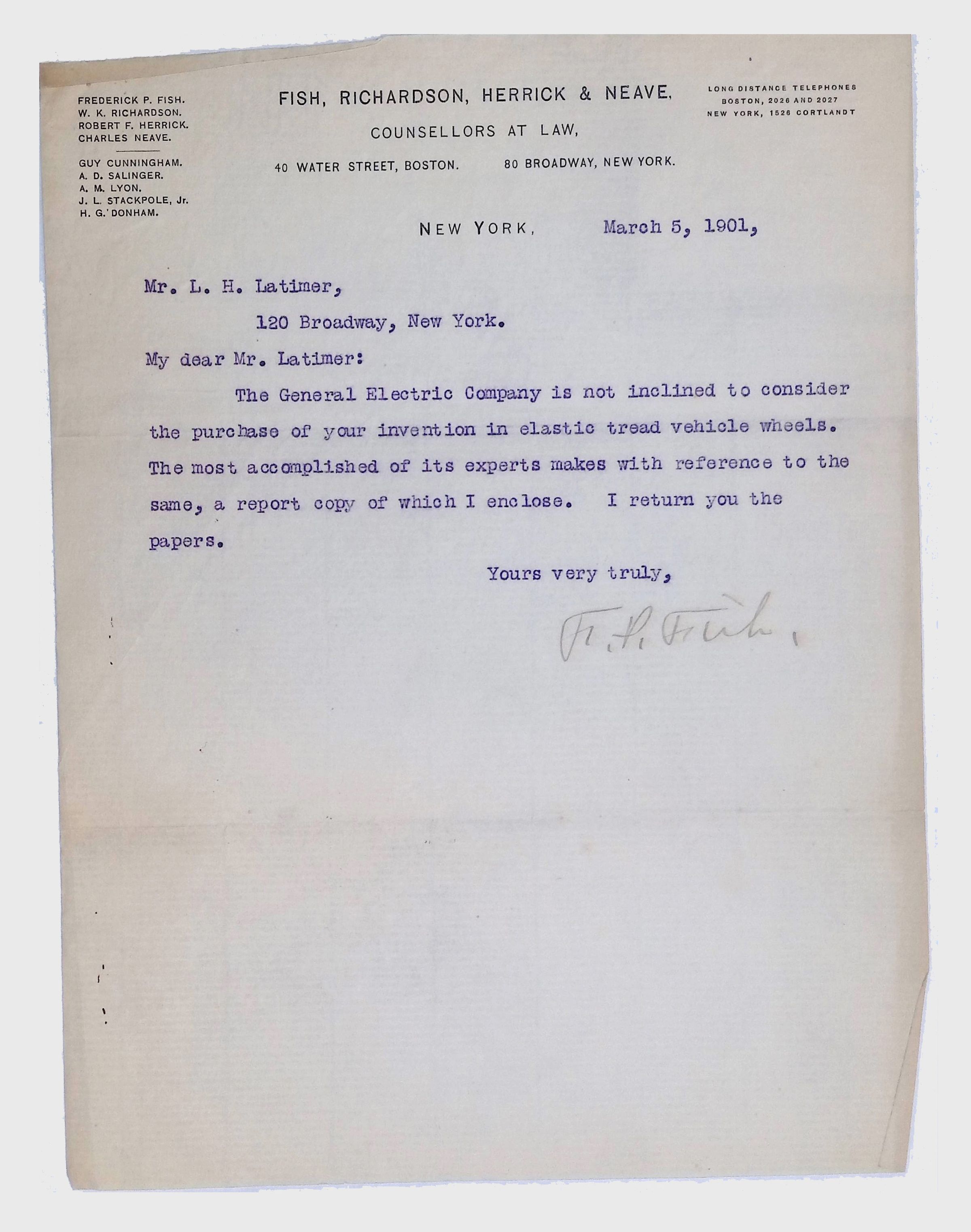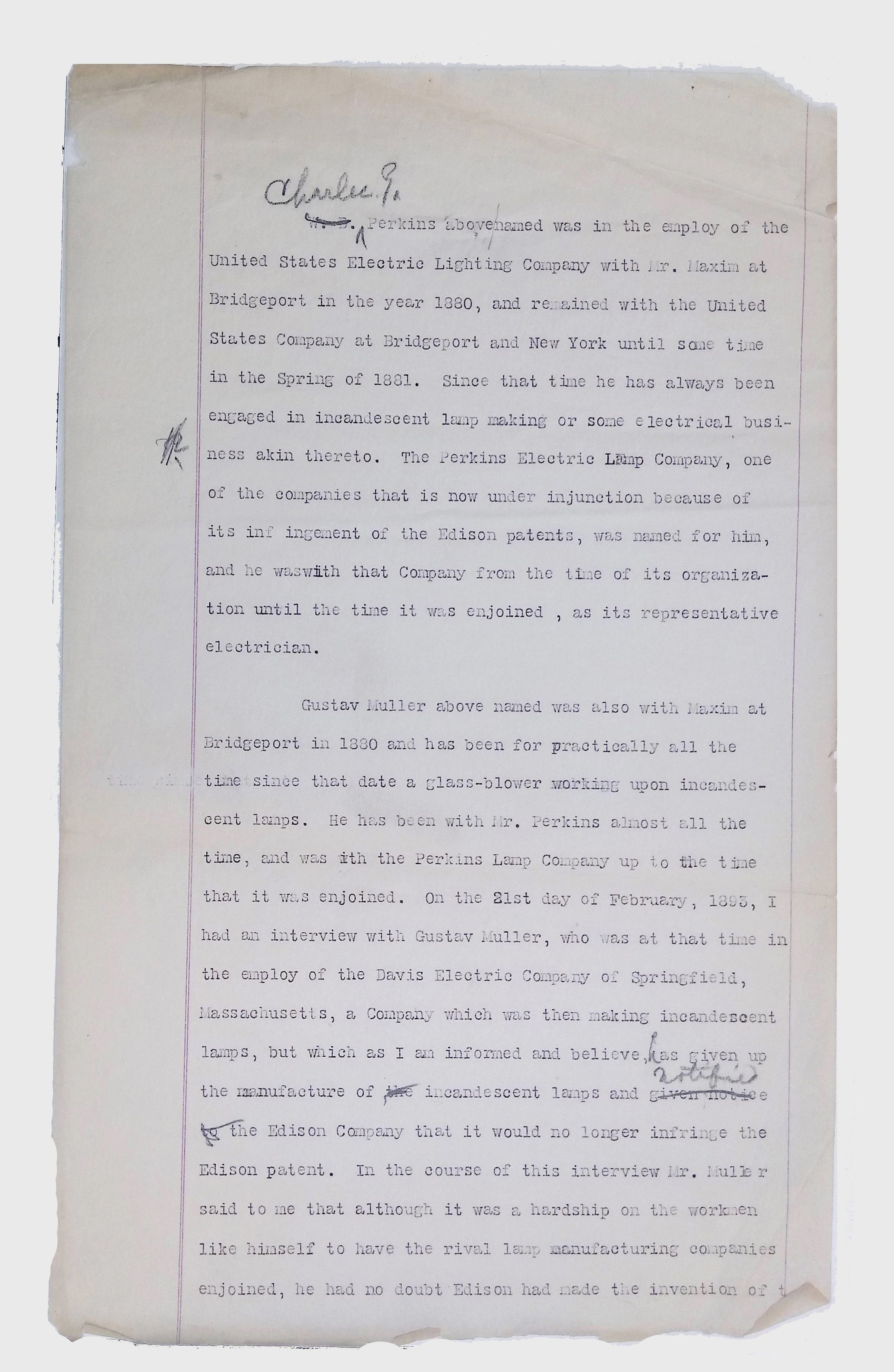 This folder includes two noteworthy documents: a partial typescript of expert testimony given by Lewis Latimer during a 1893 law case involving his former colleague, Charles Perkins, and an unrelated 1901 letter from lawyers for the General Electric Company, noting that the company “is not inclined to consider the purchase of your invention in elastic tread vehicle wheels.” A set of typed legal and technical documents, structured in a formal format, possibly from court proceedings, patent filings, or professional testimonies. Some pages contain handwritten annotations or corrections. These records provide insight into Lewis Latimer’s professional engagements, legal involvement, and technical expertise.Context