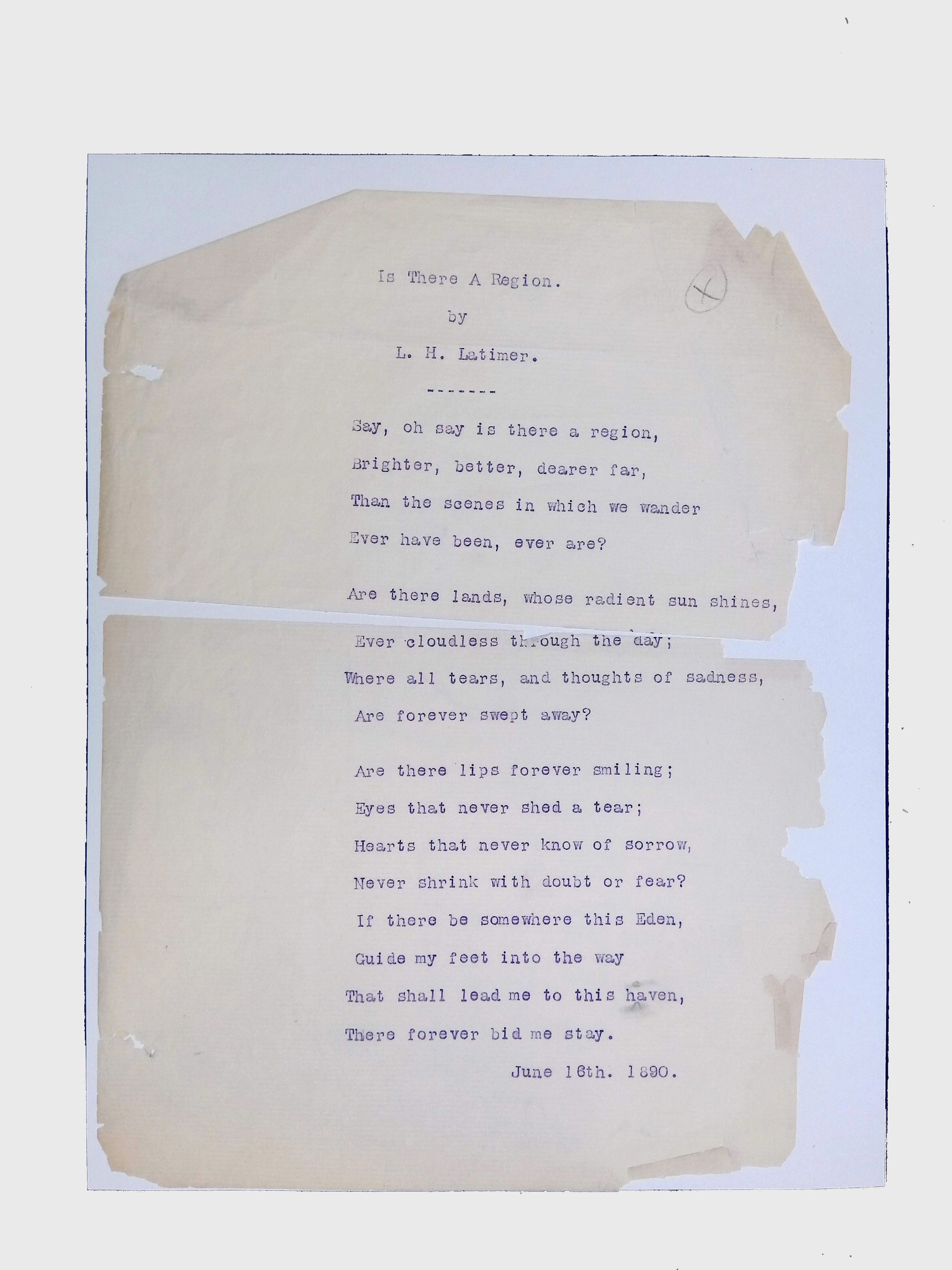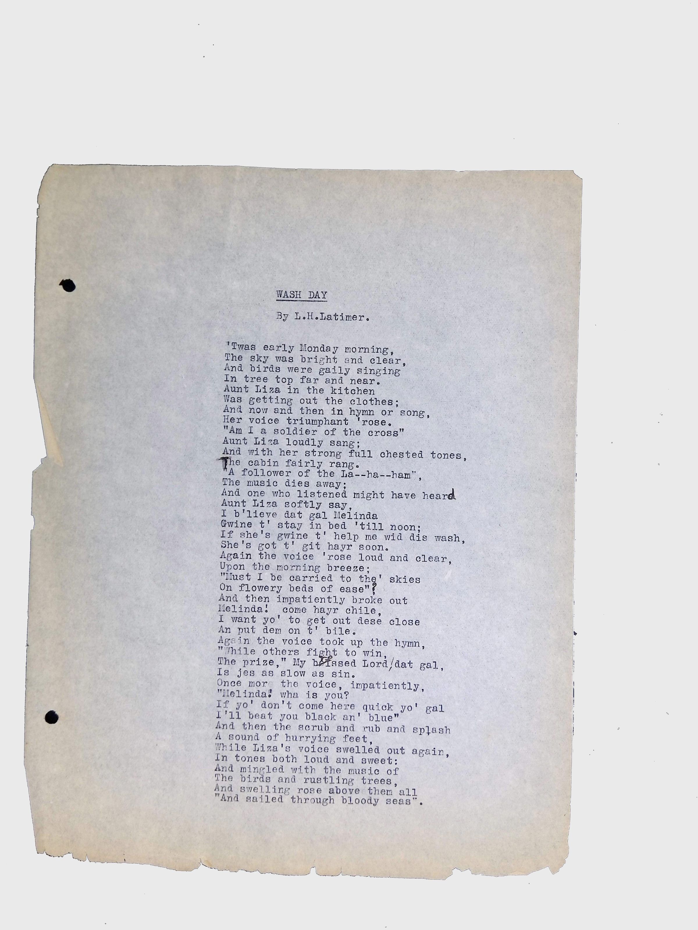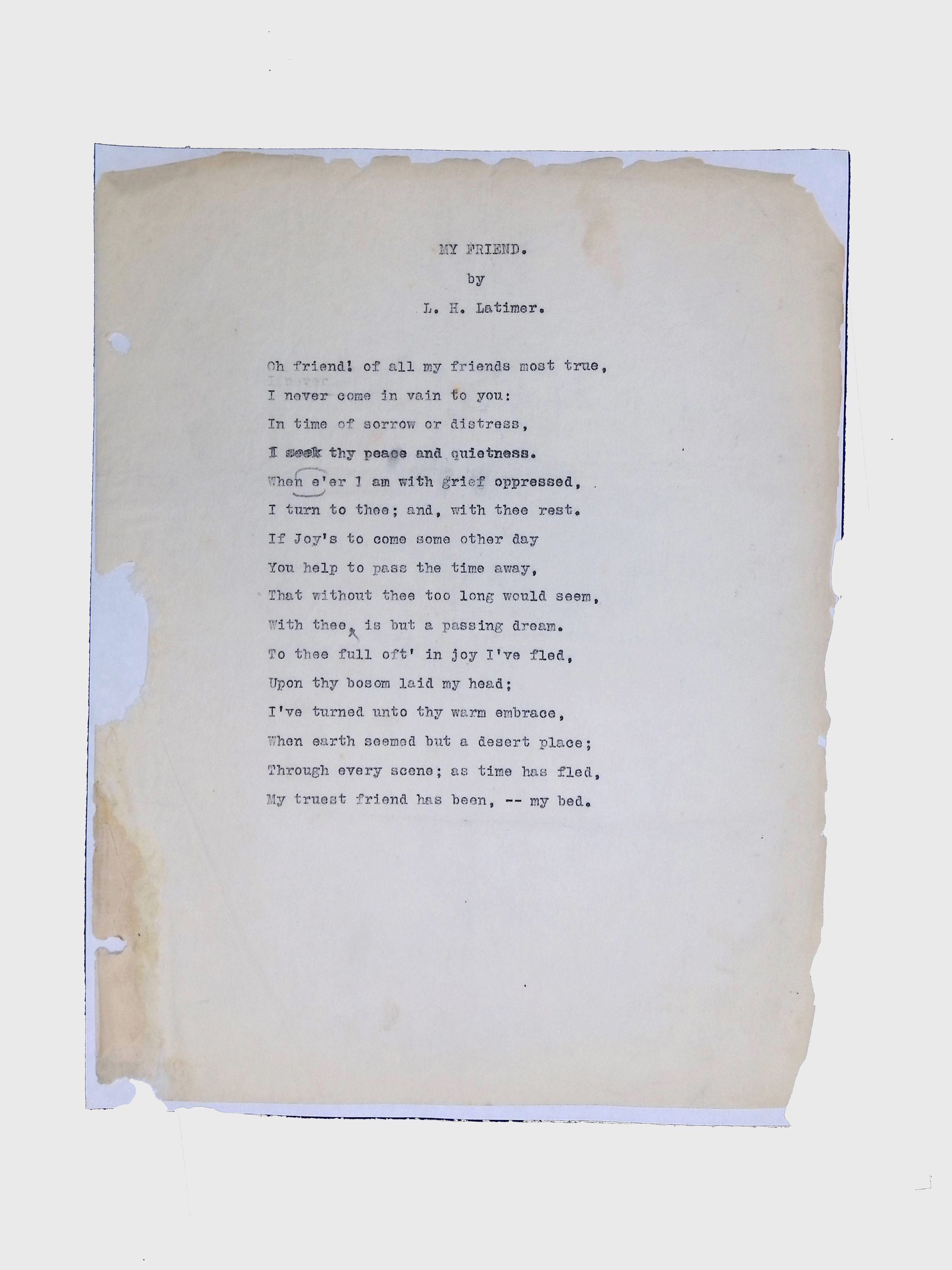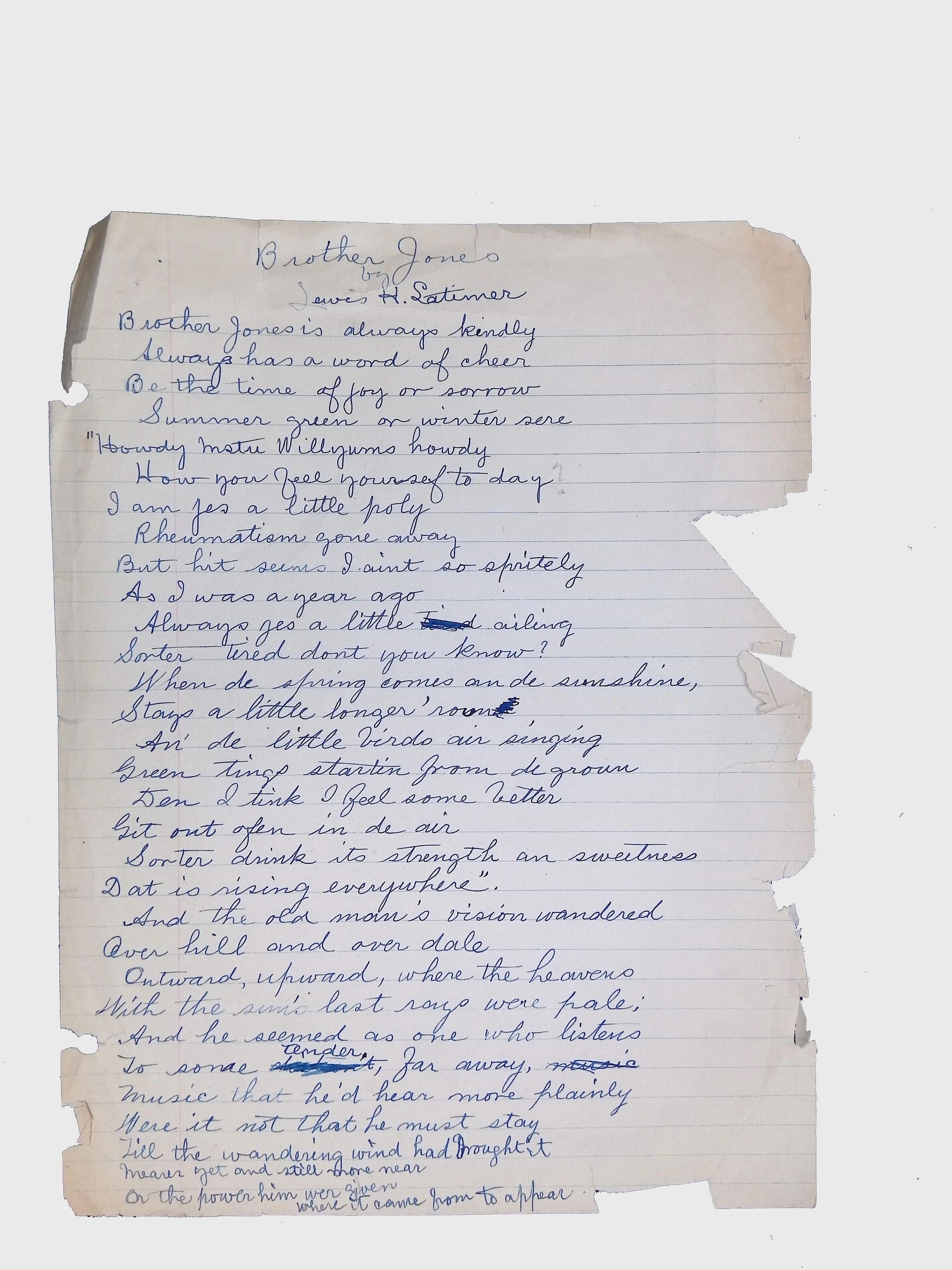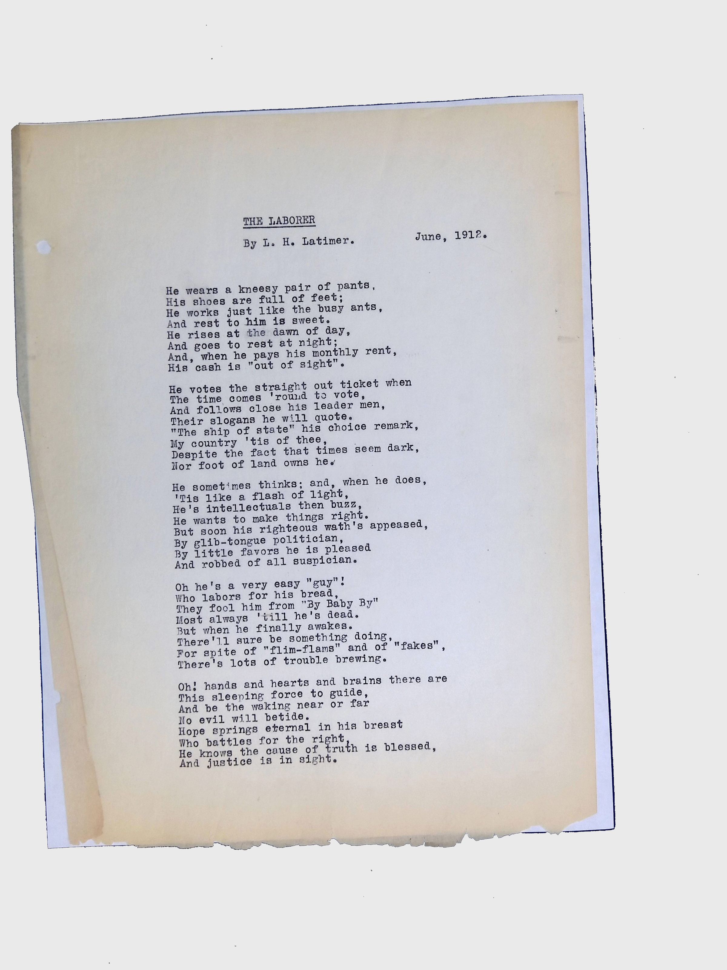 These materials provide a glimpse into Latimer’s intellectual and creative side, illustrating his thoughts on the social issues of his time. His poetry and prose offer insight into his life experiences, personal beliefs, and the broader African American experience during his lifetime.Location