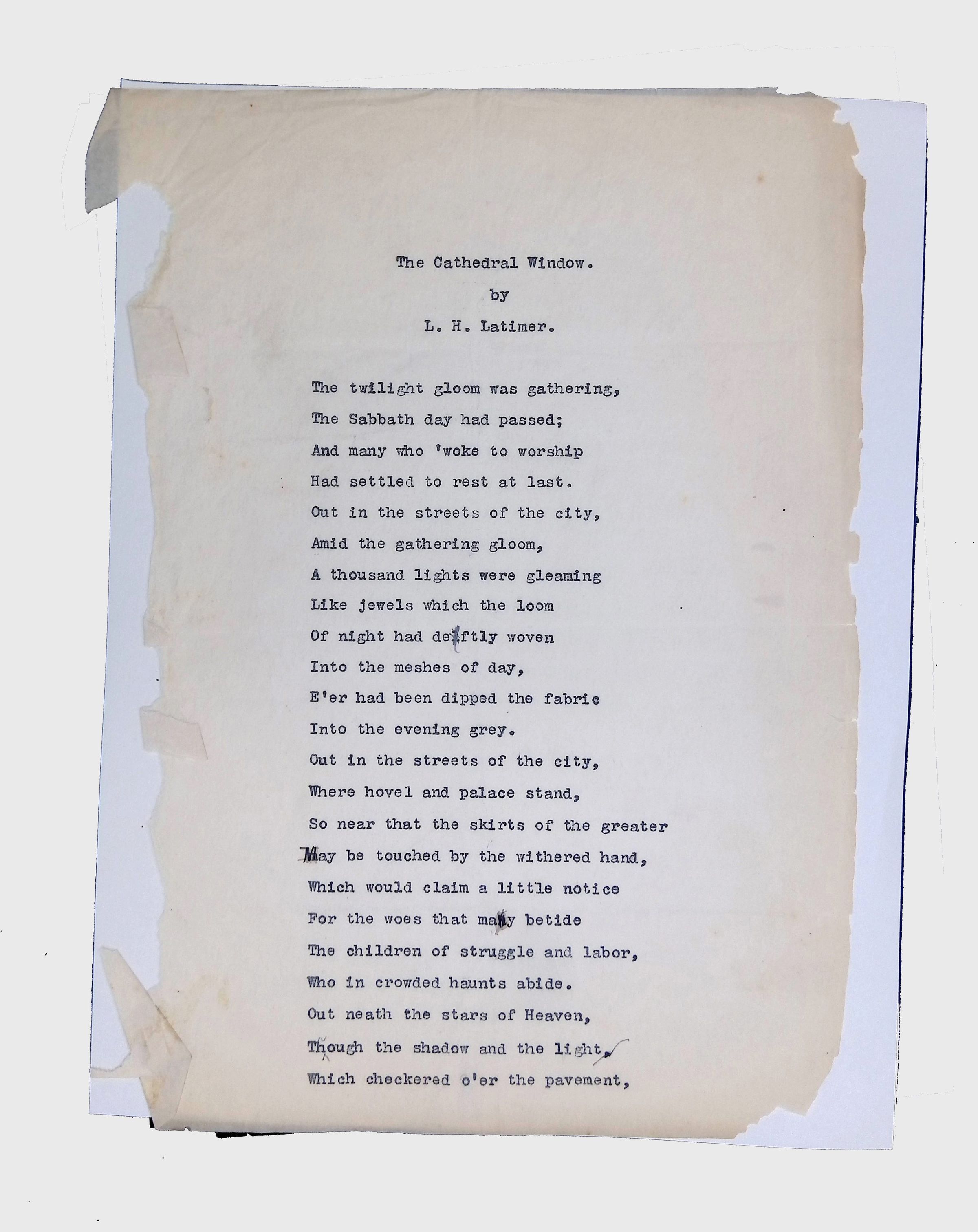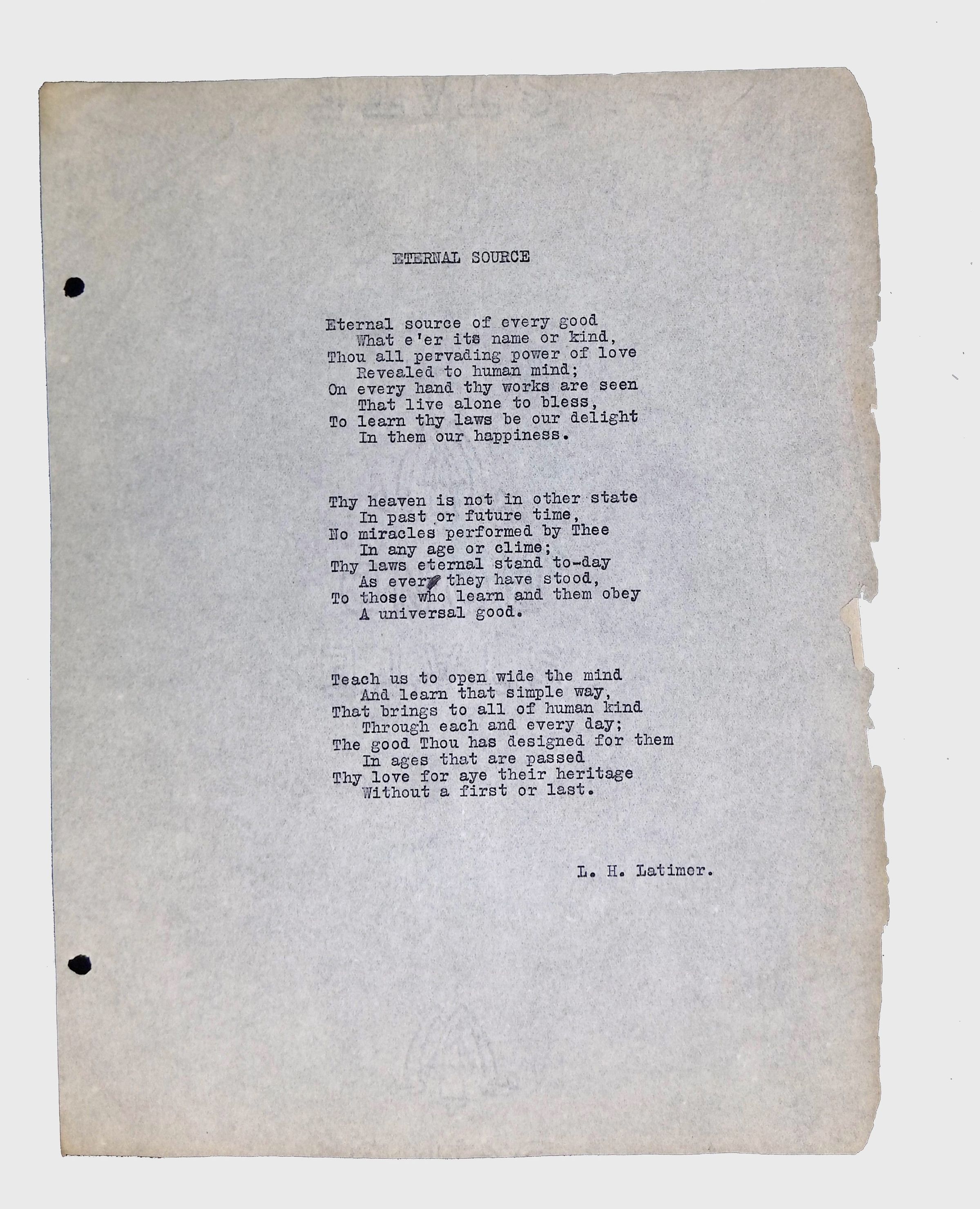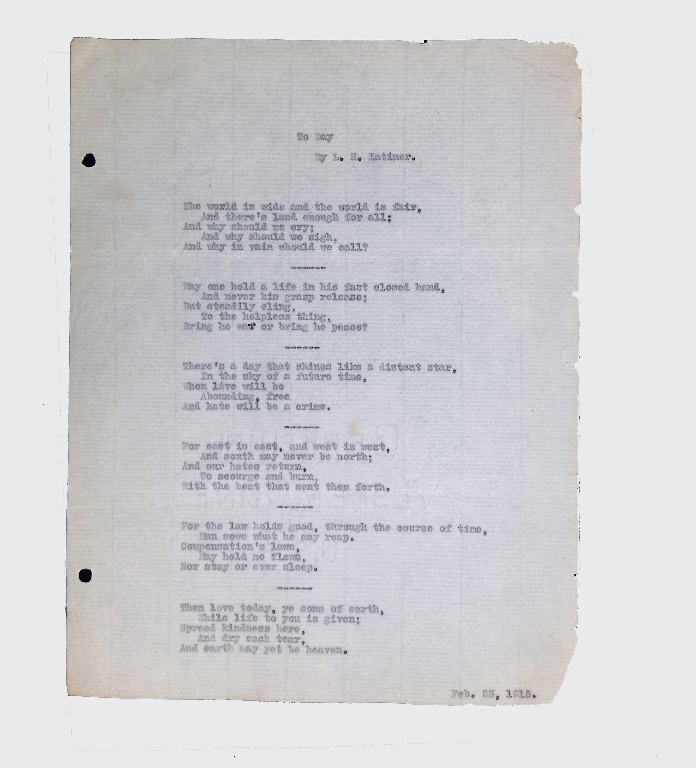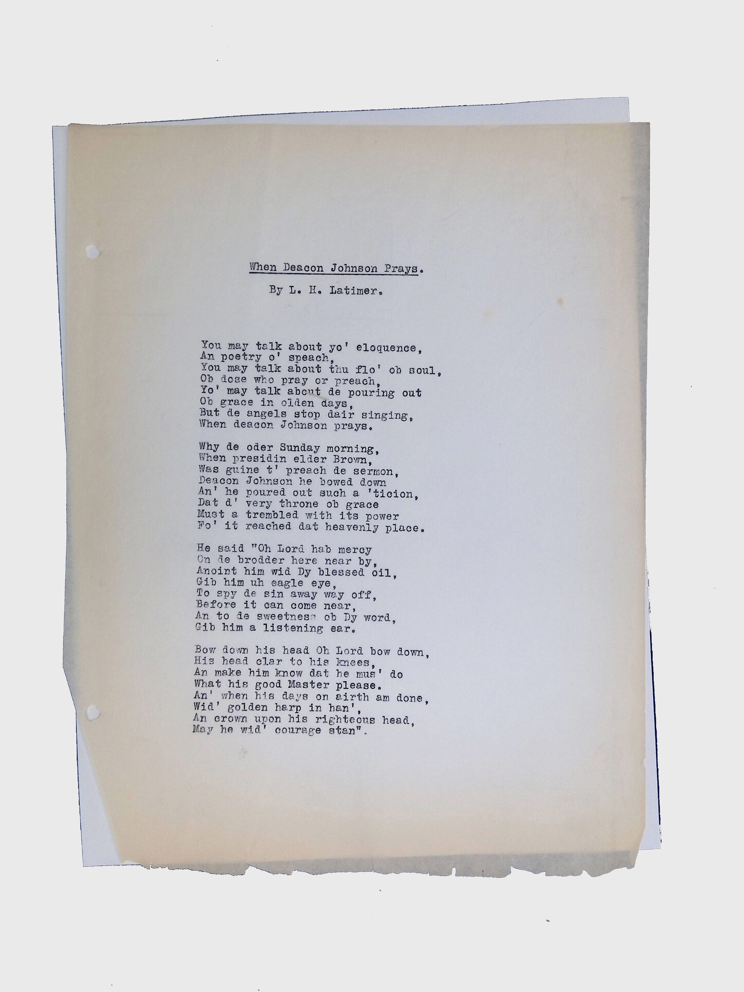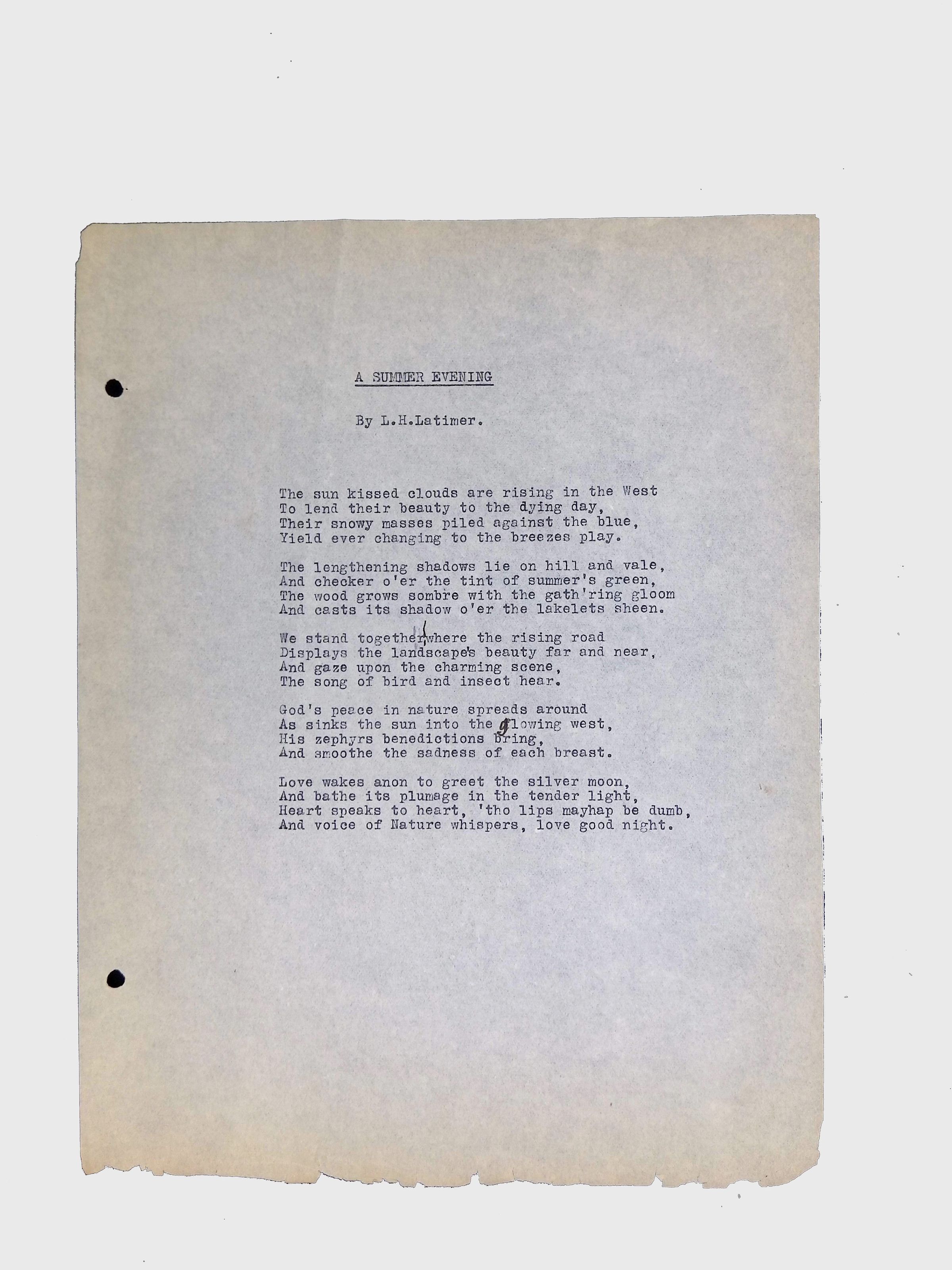 These materials provide a glimpse into Latimer’s intellectual and creative side, illustrating his thoughts on the social issues of his time. His poetry and prose offer insight into his life experiences, personal beliefs, and the broader African American experience during his lifetime.Location