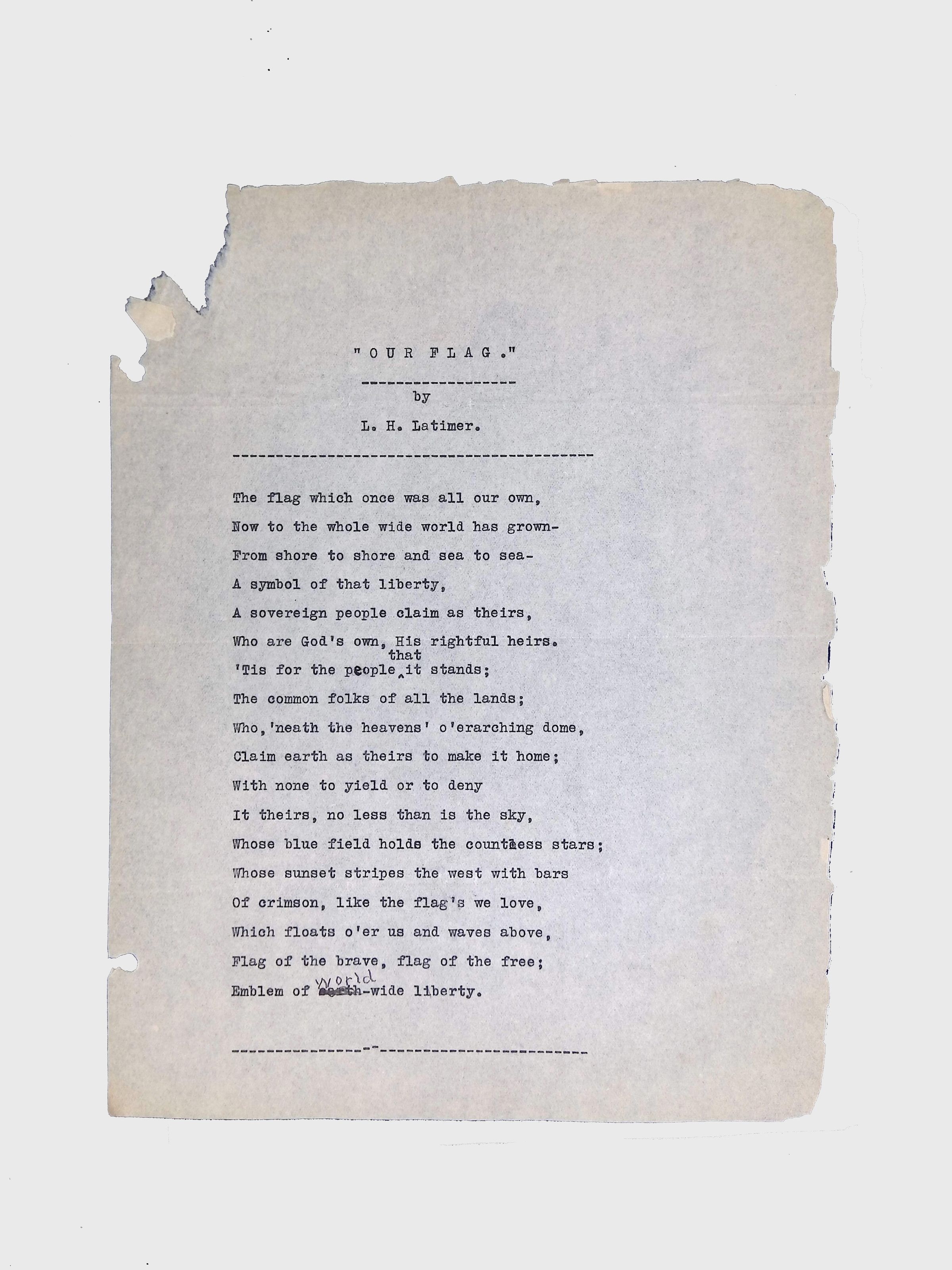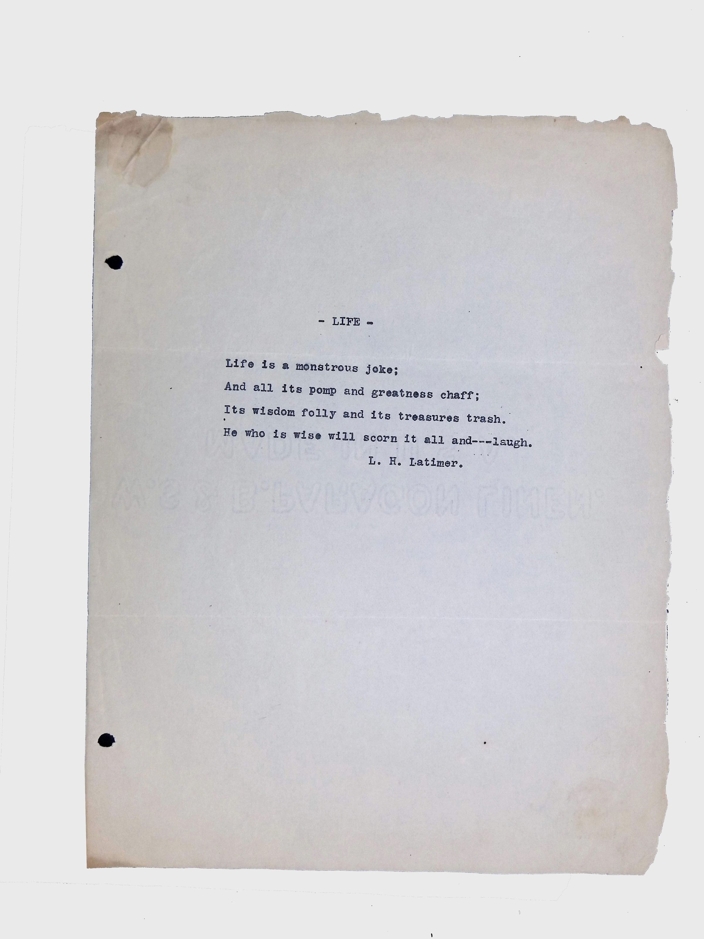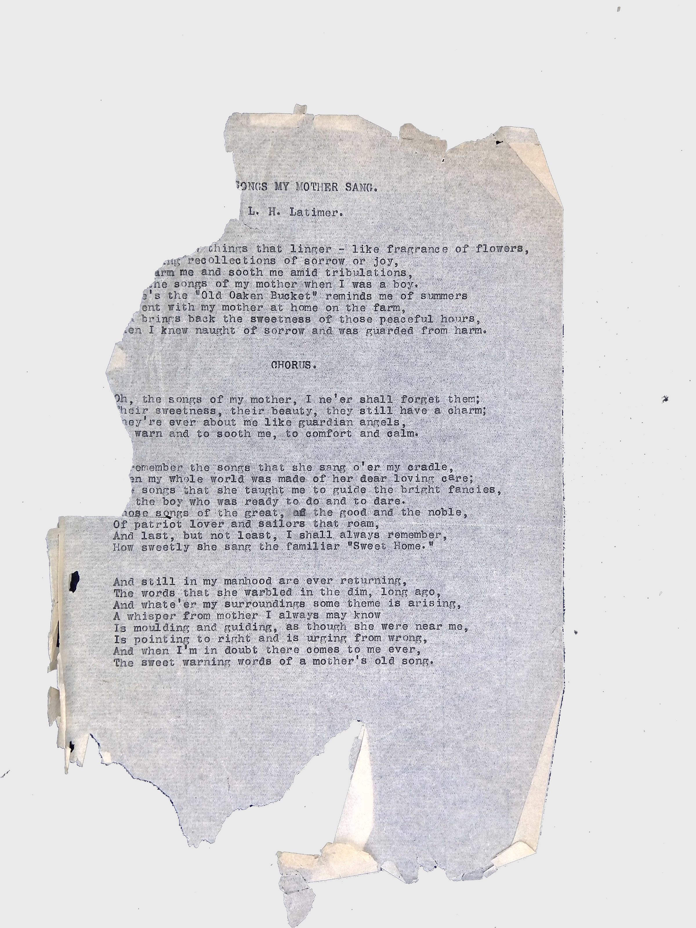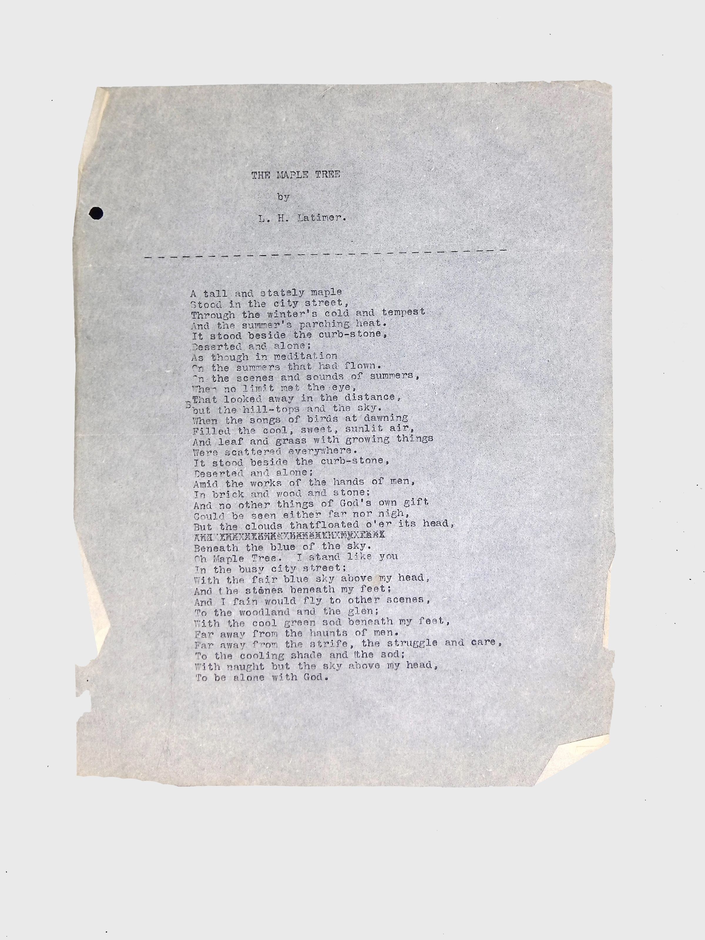 This folder contains original and copied writings by Lewis H. Latimer, including poetry, essays, and notes. Latimer was not only an inventor but also a talented writer and poet, expressing his thoughts on race, society, and personal reflections. The folder includes poems pertaining to African American life such as “Frederick Douglass” and “Cream White,” and a clipping of one of Latimer’s poem published in The New York Age, New York City’s African American newspaper.Collection
