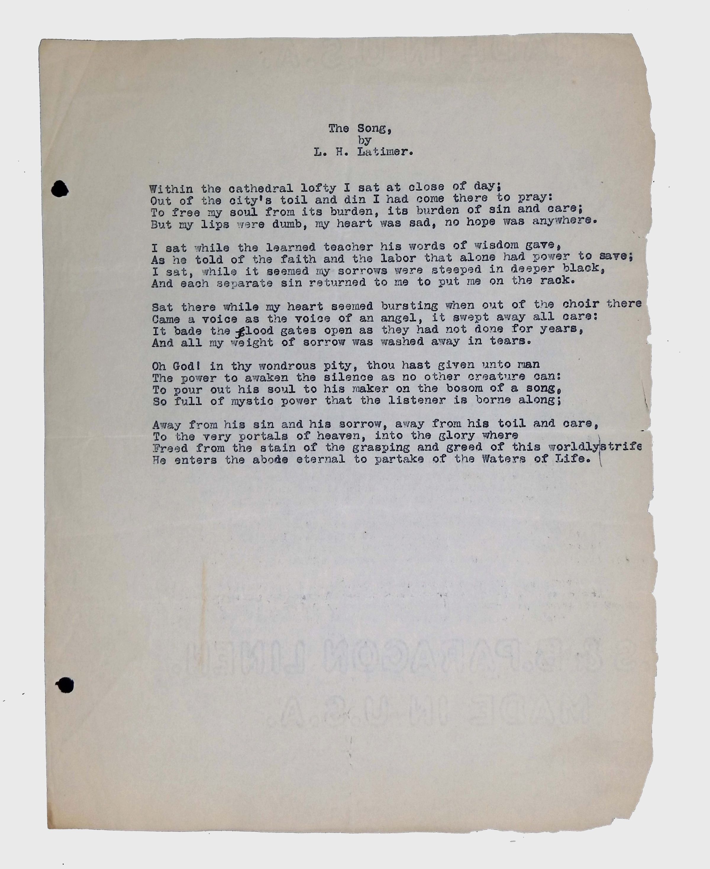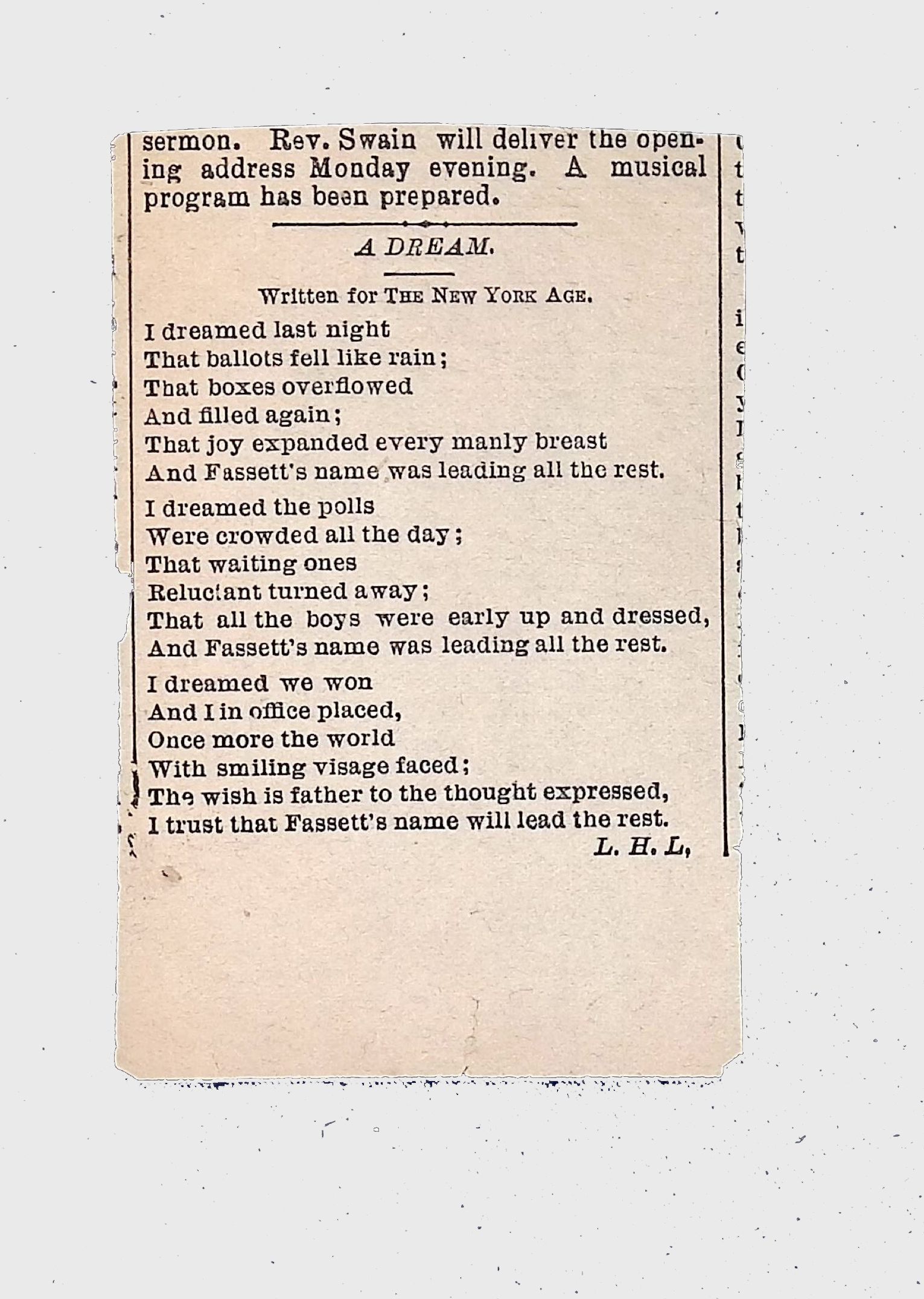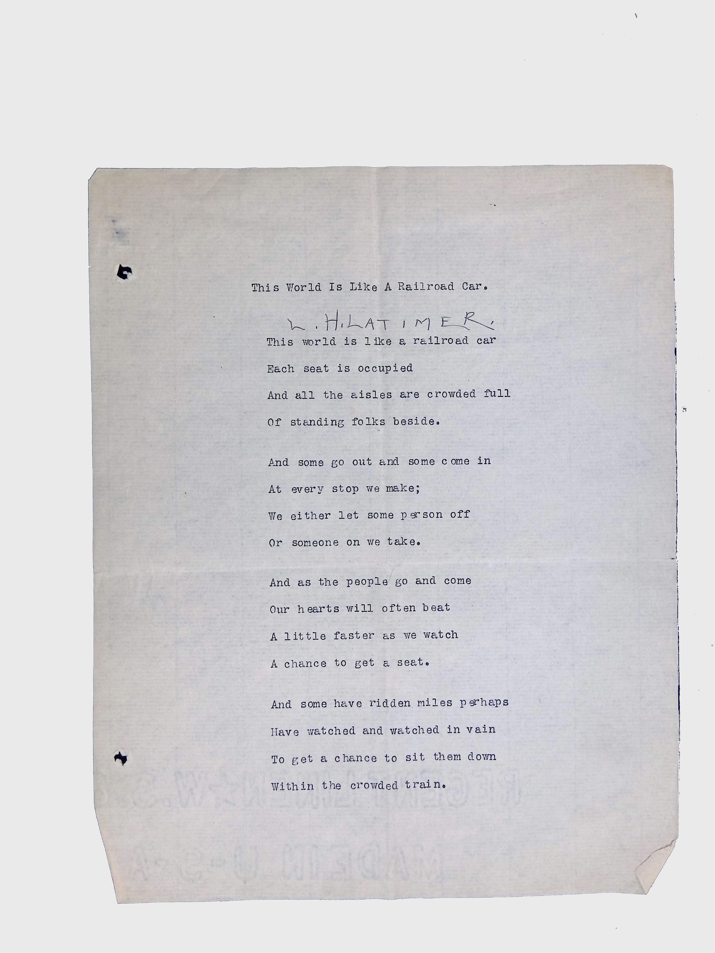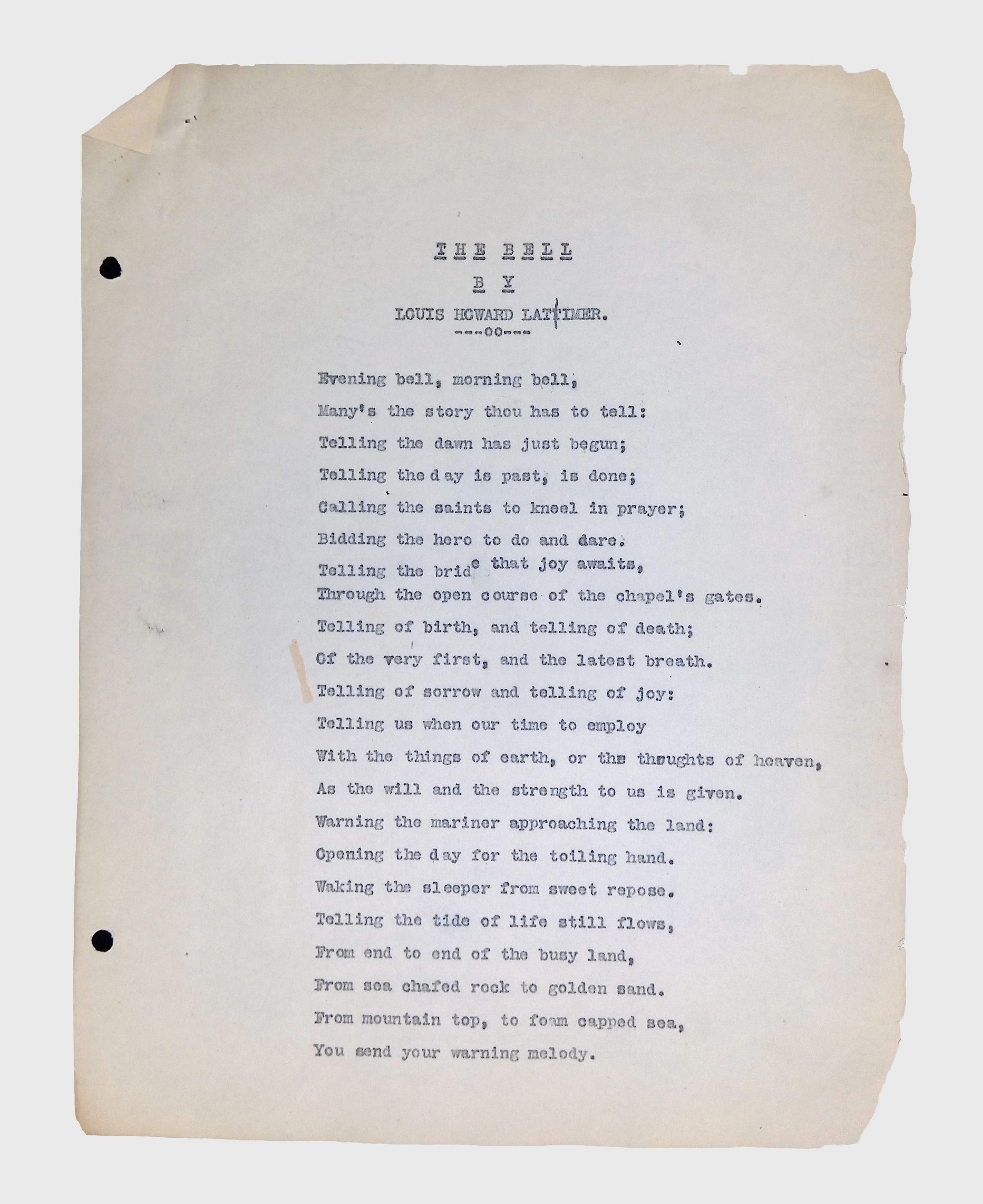 This folder contains original and copied writings by Lewis H. Latimer, including poetry, essays, and notes. Latimer was not only an inventor but also a talented writer and poet, expressing his thoughts on race, society, and personal reflections. The folder includes poems pertaining to African American life such as “Frederick Douglass” and “Cream White,” and a clipping of one of Latimer’s poem published in The New York Age, New York City’s African American newspaper.Collection
