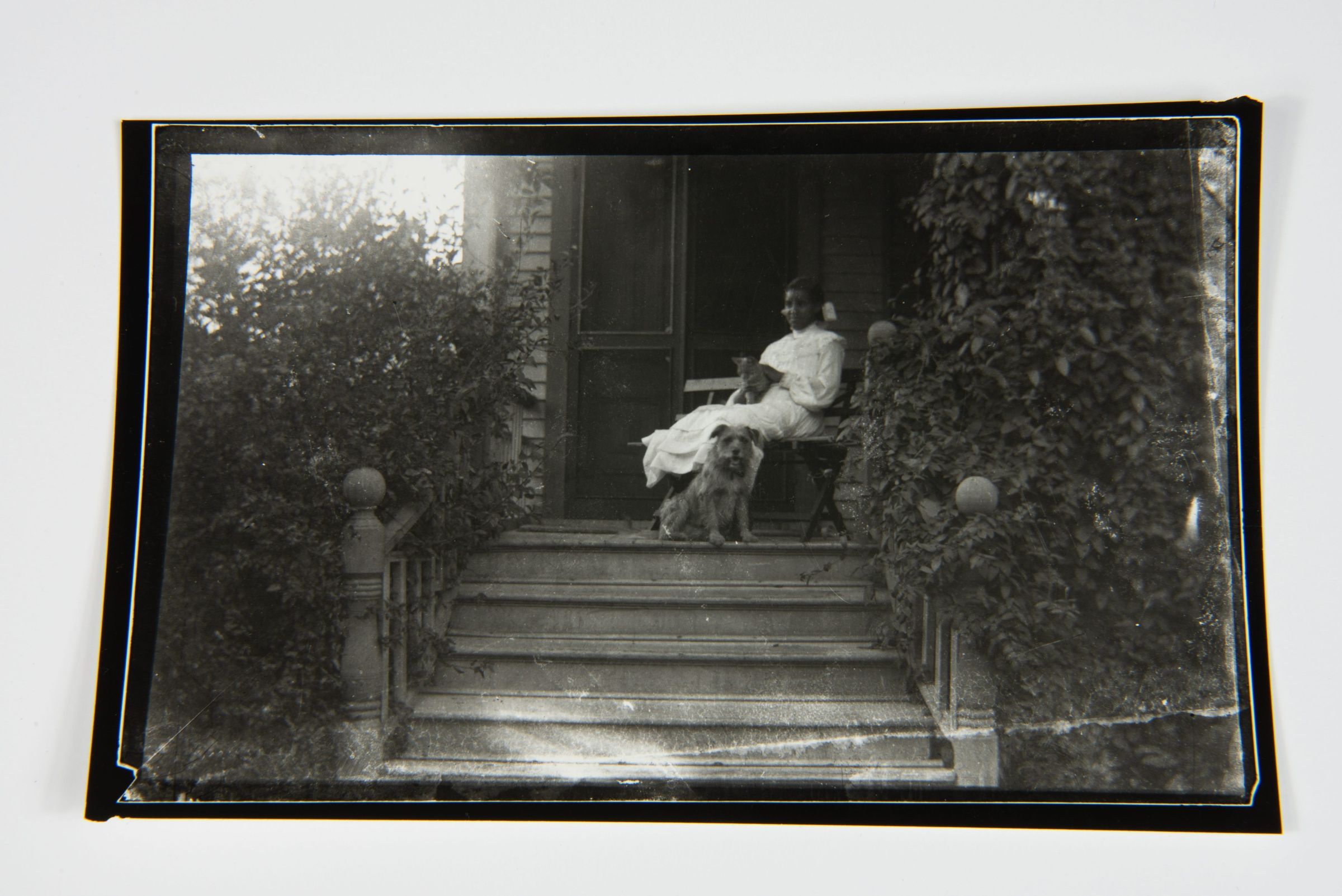 Jeannette Latimer relaxes with a pet cat and dog on the porch of 64 Holly Avenue (later Holly Street) circa 1905, in the early years of the Latimer family’s residence there. A young woman, dressed in a white Edwardian-style dress with a high neckline and long sleeves, sits on a wooden bench on the porch of a house. She holds a small cat in her lap and gazes slightly away from the camera. A ribbon or bow adorns her neatly styled hair. Black and white photograph, likely developed from a glass plate negative or early film negative.Photograph Details