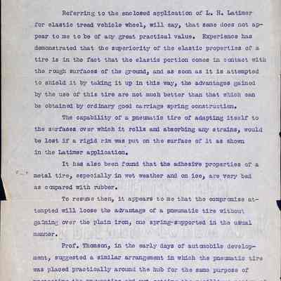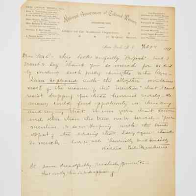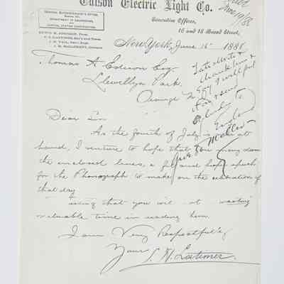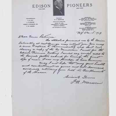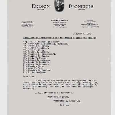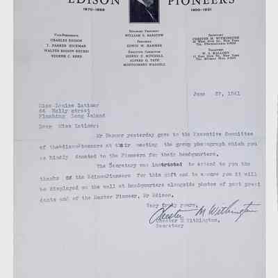 Printed Material, (1 folder, 1900-ca. 1920): Letter to Louise Latimer from Edison Pioneers