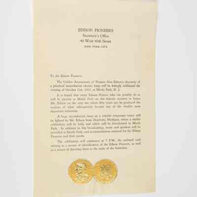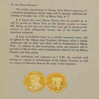 Edison Pioneers Invitation to the Golden Anniversary Celebration of Edison's Electric Light, 1929.