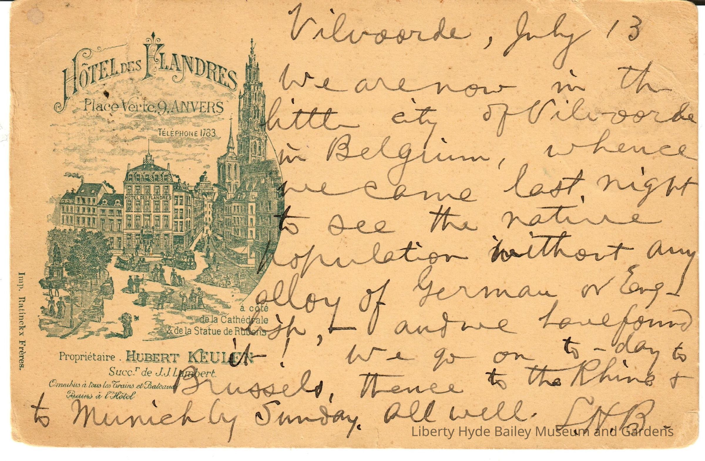 Postcard has a rendering of Hotel des Flandres on backDate and Time of Postmark