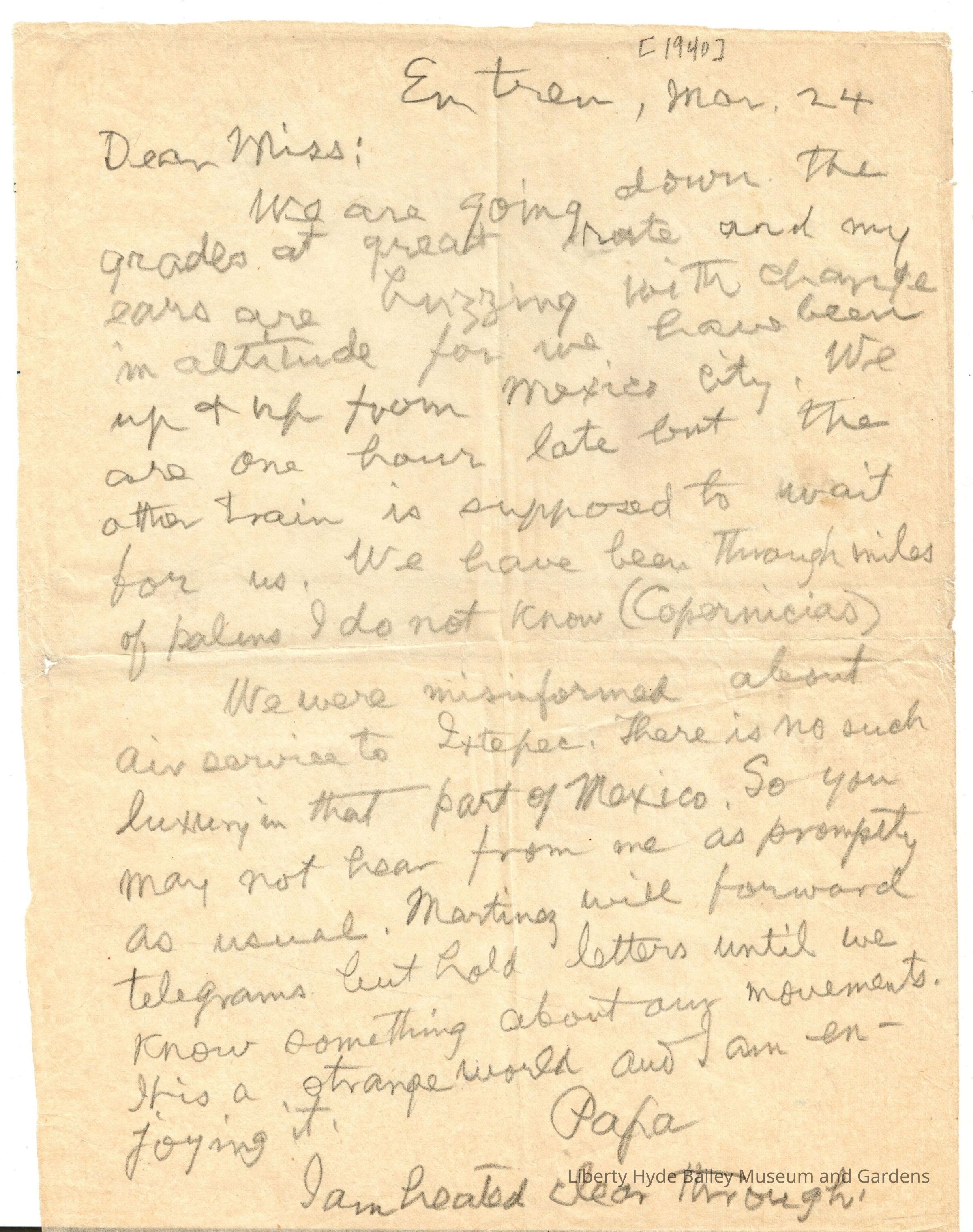 Letter, LH Bailey to EZ Bailey: 3-23-1940; Mexico en route to Ixtepec
