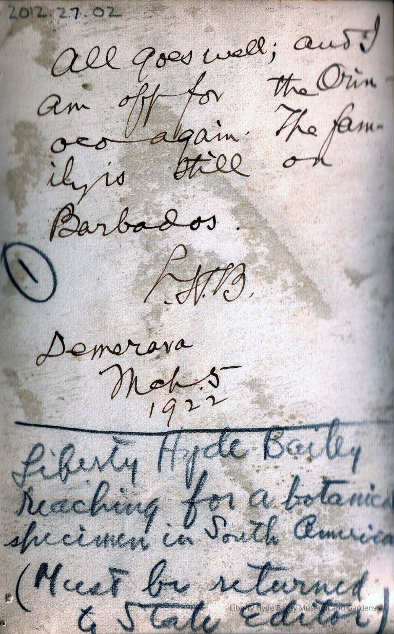 All goes well; and I am off for the Orinoco again. The family is still on Barbados. L.H.B. Demerava. Mch. 5, 1922.