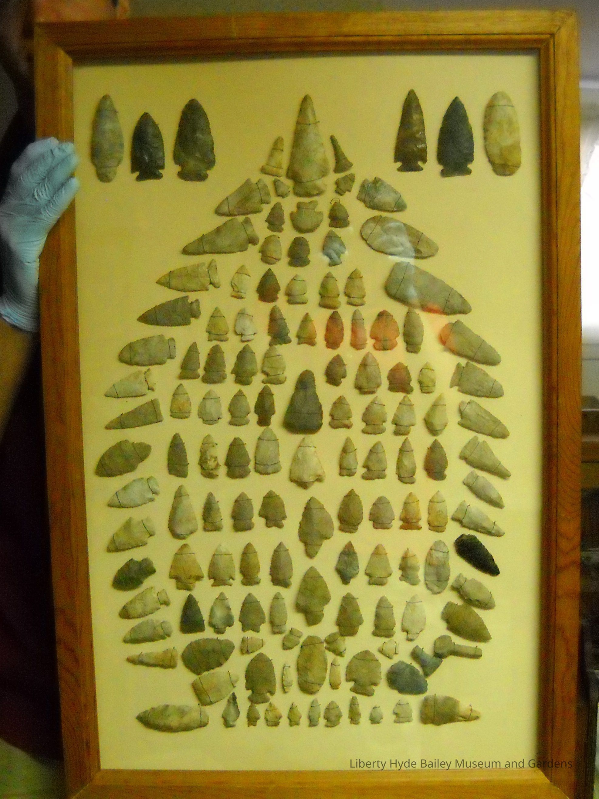 Framed collection of 133 arrowheads. Measures 29.5 inches by 20 inches. Arranged by Guy L. Nelson