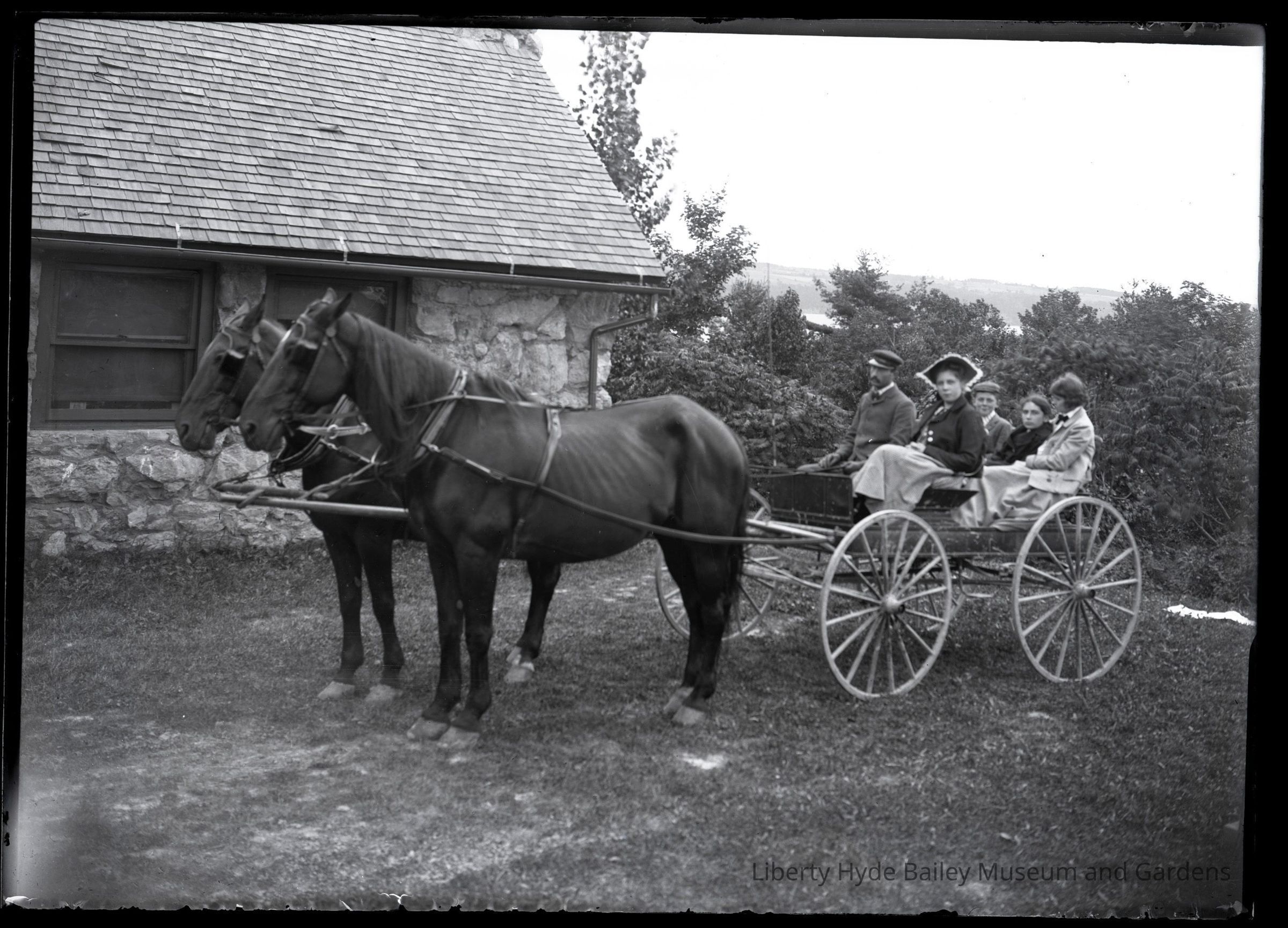 Bailiwick- Horse-drawn carriage with riders. Ethel Zoe Bailey is seated in the back wearing black. The western shore of Cayuga Lake is seen in the background.Photograph Details