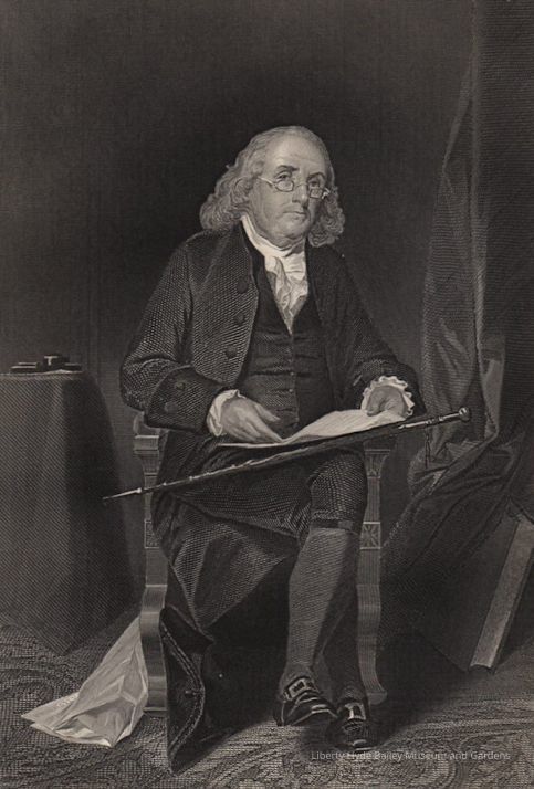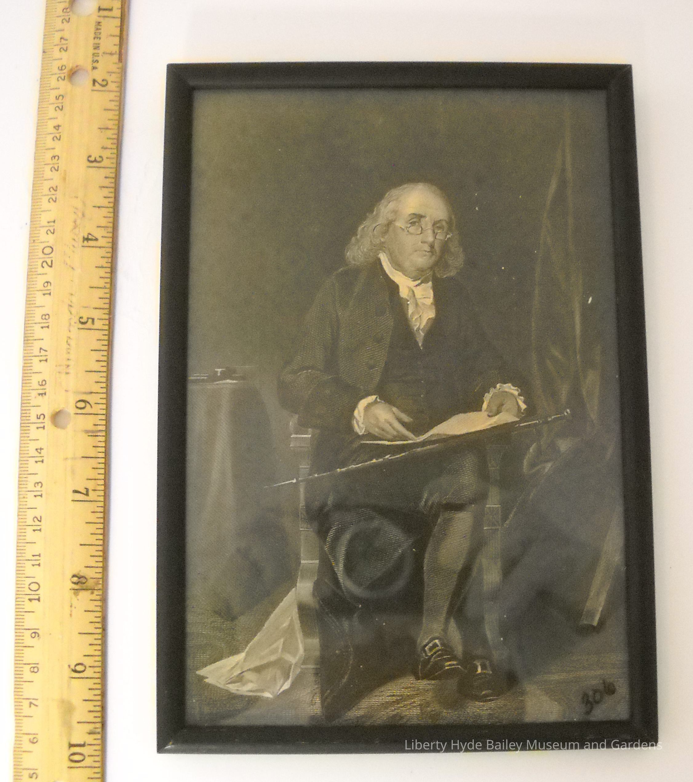 Framed black and white print of Benjamin Franklin. This image hung above Dr. Bailey's desk office at Sage Place by the west facing windows. The framing was done by H.J. Bool Company, Ithaca, New York.Context
