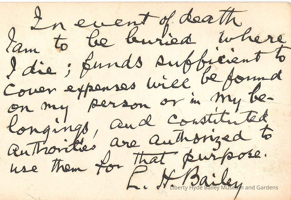 Identification card containing a photo of L.H. Bailey and handwritten instructions for dealing with his injury or death. Includes a black leather case with L.H. Bailey embossed on the front.
