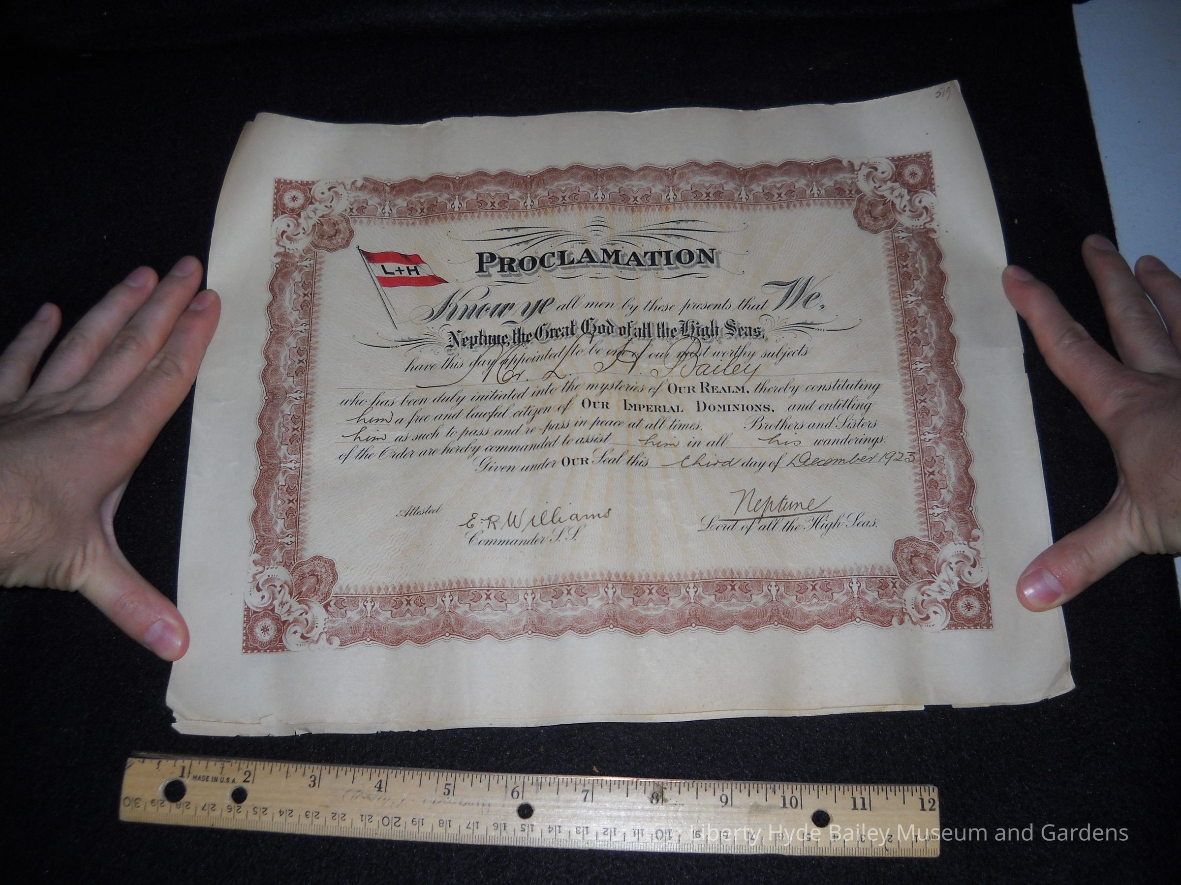 Certificate for "Neptune, the Great God of all the High Seas" initiating Liberty Hyde Bailey on December 2, 1923. Two (2) copies.