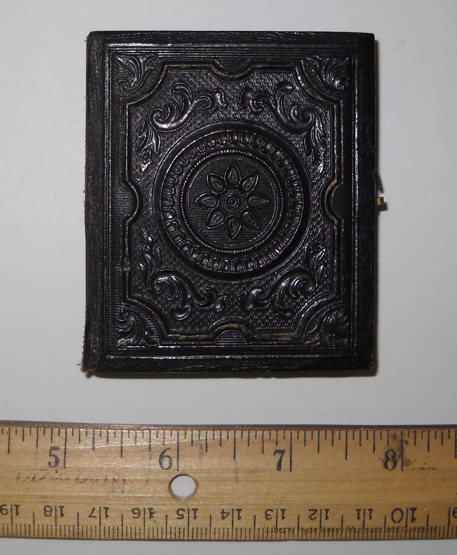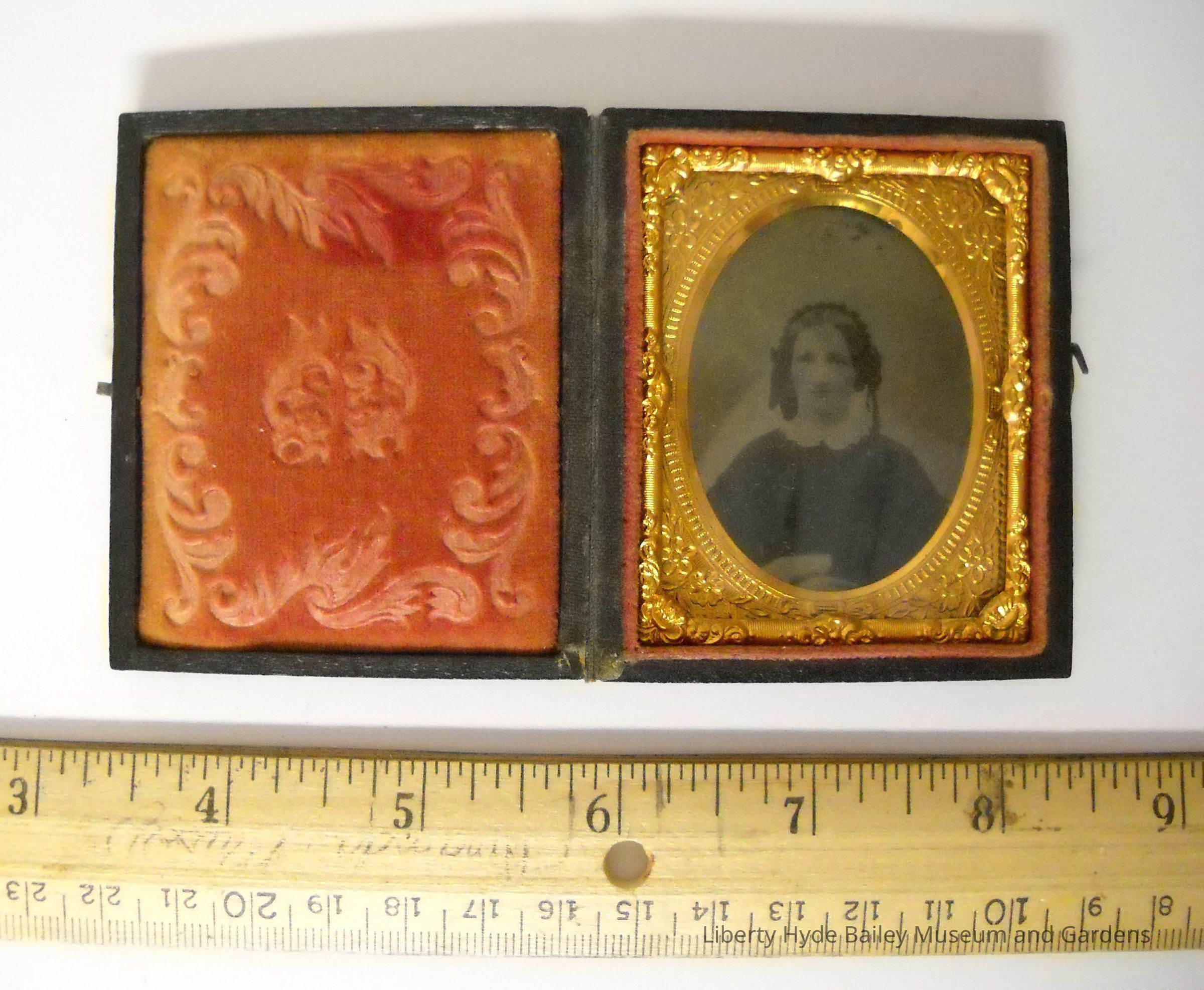 Daguerreotype photo of Liberty Hyde Bailey's mother, Sarah Harrison Bailey, in a small, black wooden case with a clasp. Lined with red-patterned velvet, in an intricate, gold-leaf frame.