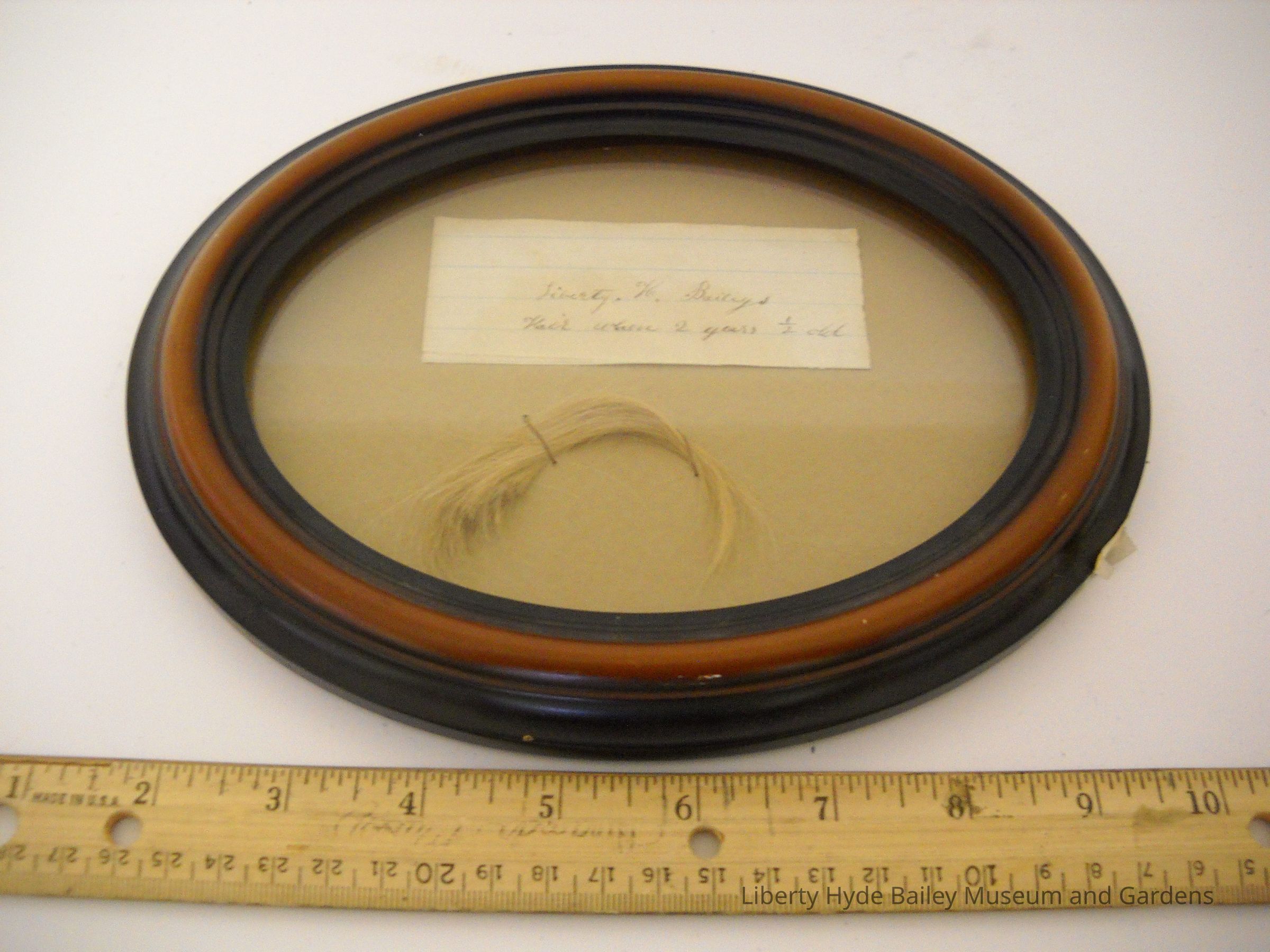 Lock of Liberty Hyde Bailey Jr.'s hair from when he was 2.5 years old. The hair is in an oval frame, 8.5 inches by 6.5 inches at the largest height and width. There is a note in the frame that reads, " LIberty. H. Baileys Hair When 2 years 1/2 old"Collection