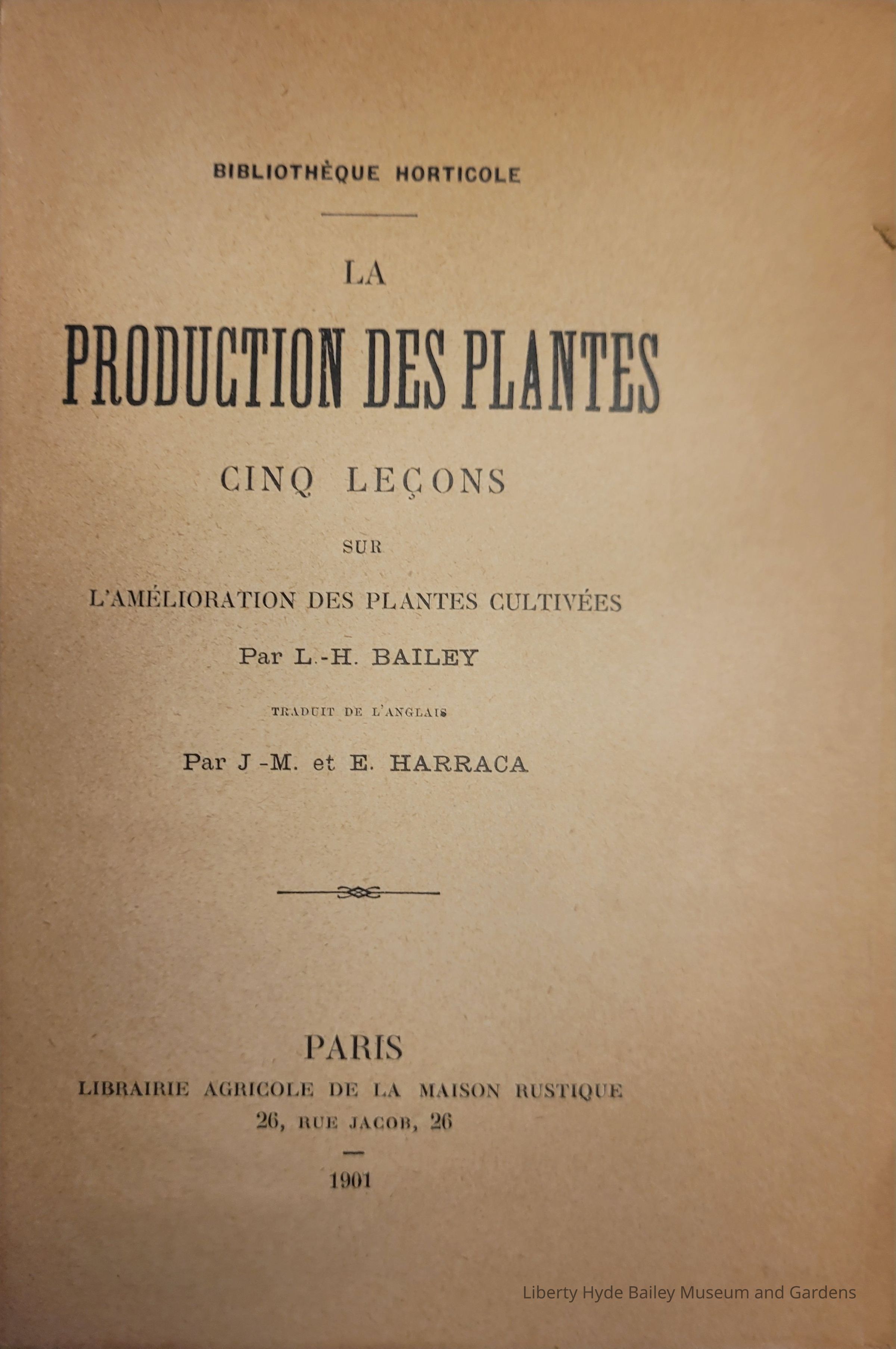 Bailey refers to this French publication in the English introduction of Plant-Breeding (1905), "The book, 'Plant-Breeding,- was translated into the French by J. M. and E. Harraca, and published in Paris in 1901 as 'La Production des Plantes.' " p. v-viCollection