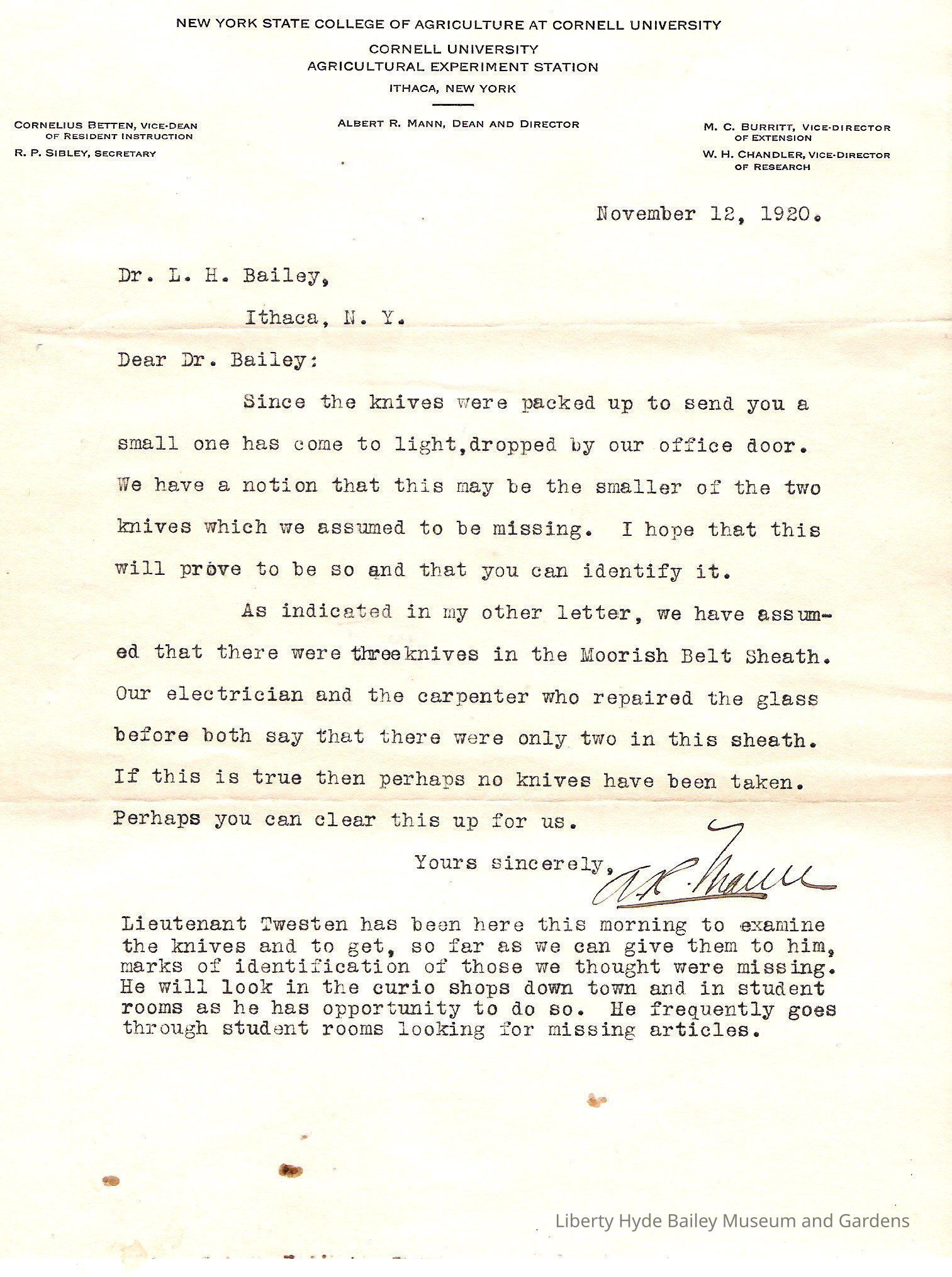 Letter: AR Mann to LH Bailey re: Return of Marcus Bailey knife collection from exhibit at Cornell University