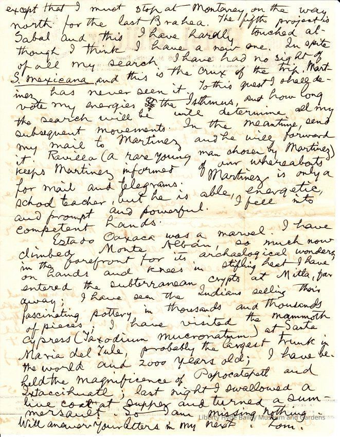 from Mexico City, received letters from EZ. travel to Isthmus and Vera Cruz, Tehuantepec. Has not seen S. mexieana, "and this is the crux of the trip." Discusses Martinez, an assistant who is, "...able, energetic, and prompt and powerful." Discusses Oaxaca, Monte Sebain (?). Mamoth Cypress... Santa Maria, "probably largest trunk in the world and 2000 years old..."