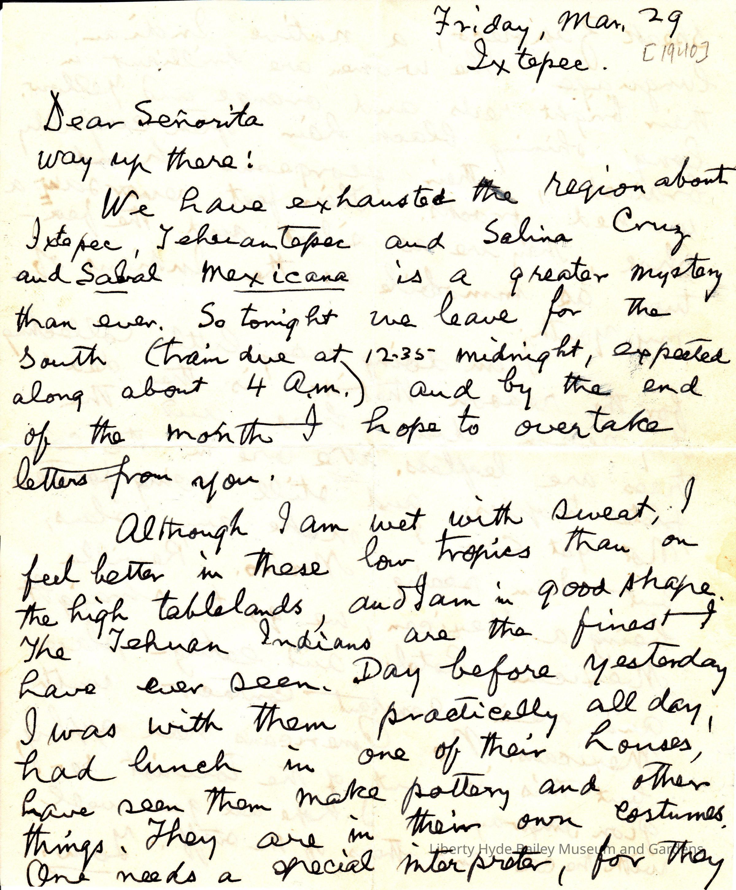 Letter, LH Bailey to EZ Bailey: 3-29-1940; Ixtepec, Mexico