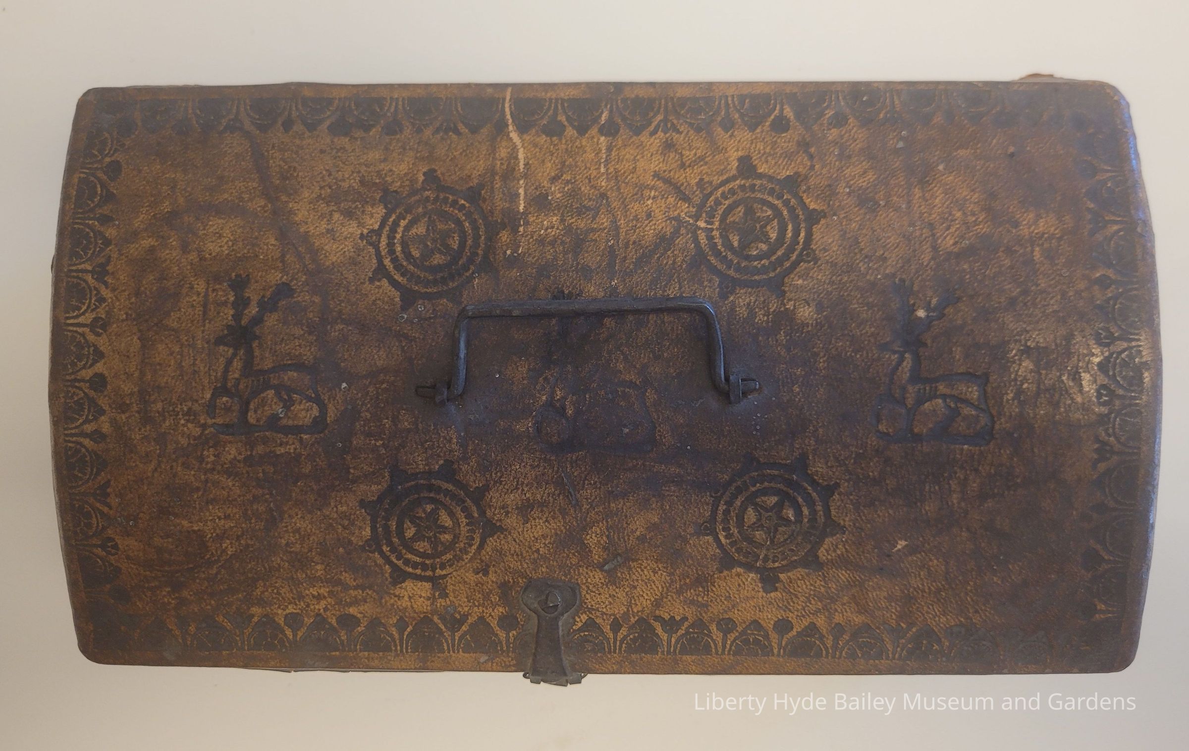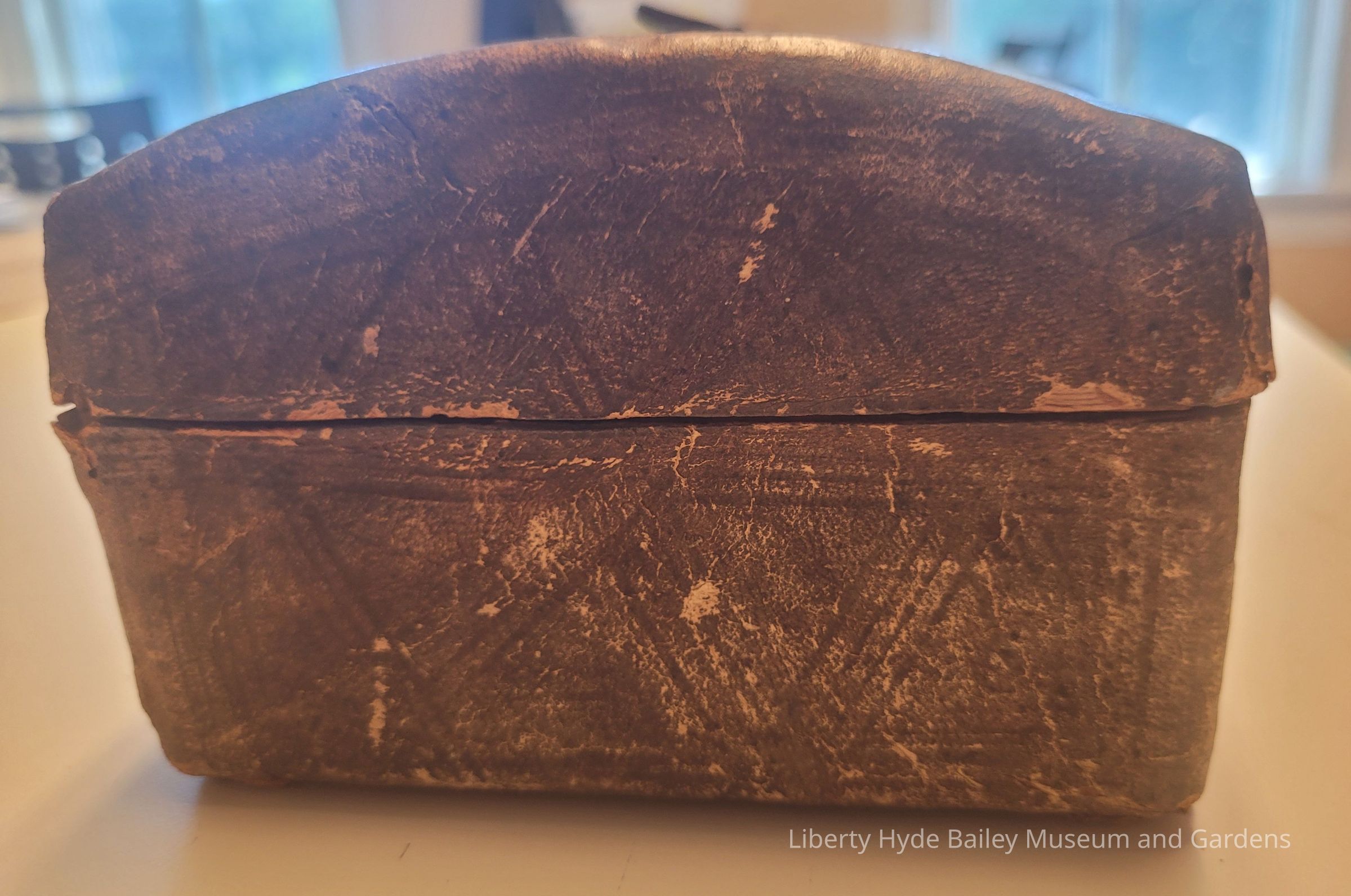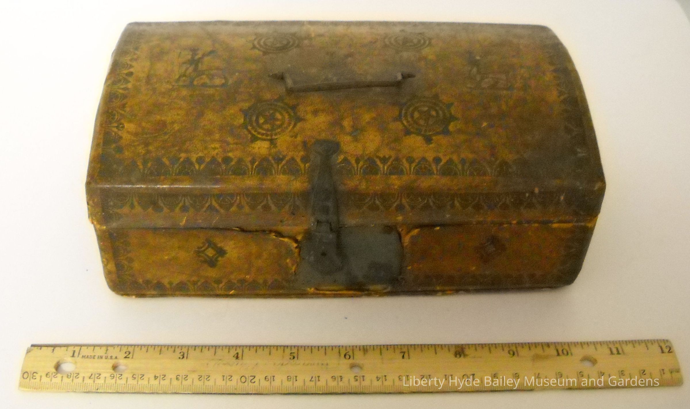 Small wooden trunk with embossed leather covering, the interior lined with newspaper. Metal handle and lock. Past documentation indicates that it was made by Jeshurun/Jesurun (Jesse) Walker (1748-1813), Liberty Hyde Bailey's great-grandfather who came to the U.S. from England at eleven and fought in the American Revolution. However, birth records indicate Jesse Walker's place of birth to be Massachusetts.